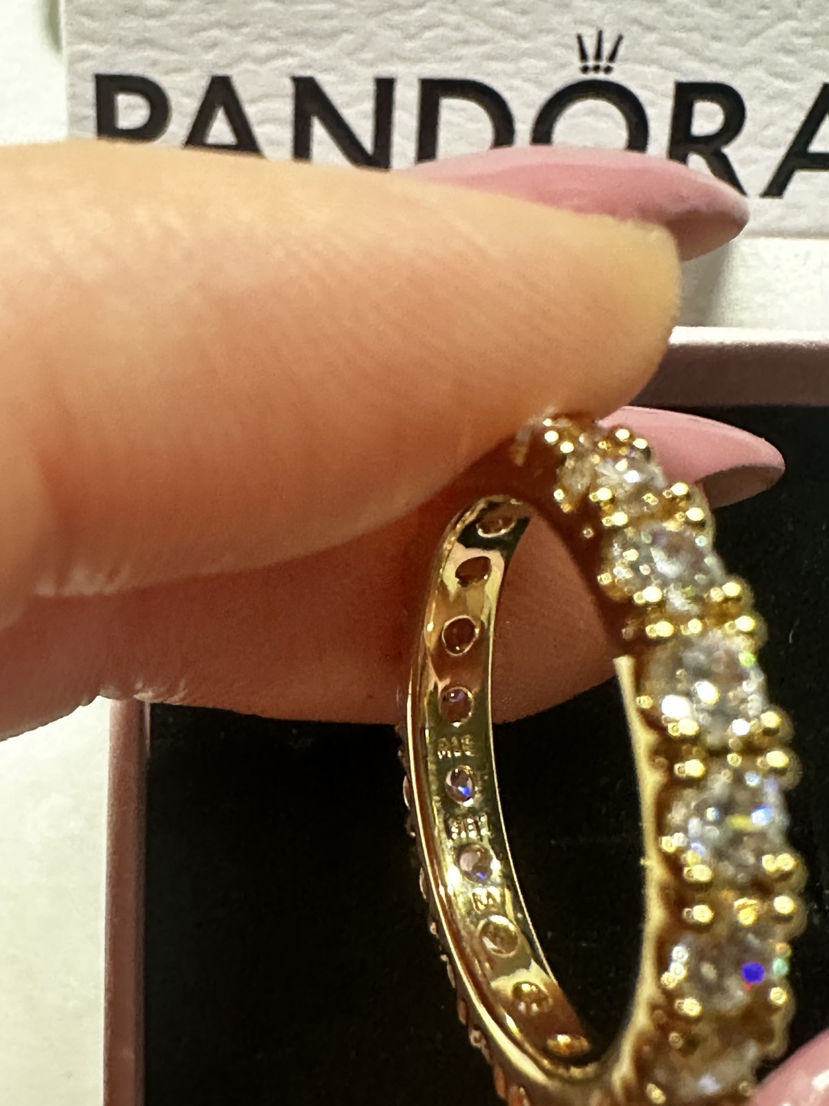 Véčkový prsteň so vznášajúcim sa pavé kolekcie Pandora Timeless Veľkosť 52. Mne žiaľ malý. Aj original krabičkou. Vhodný ako darček!!! PC - 70€ Pôvodnú krabicu nemám.