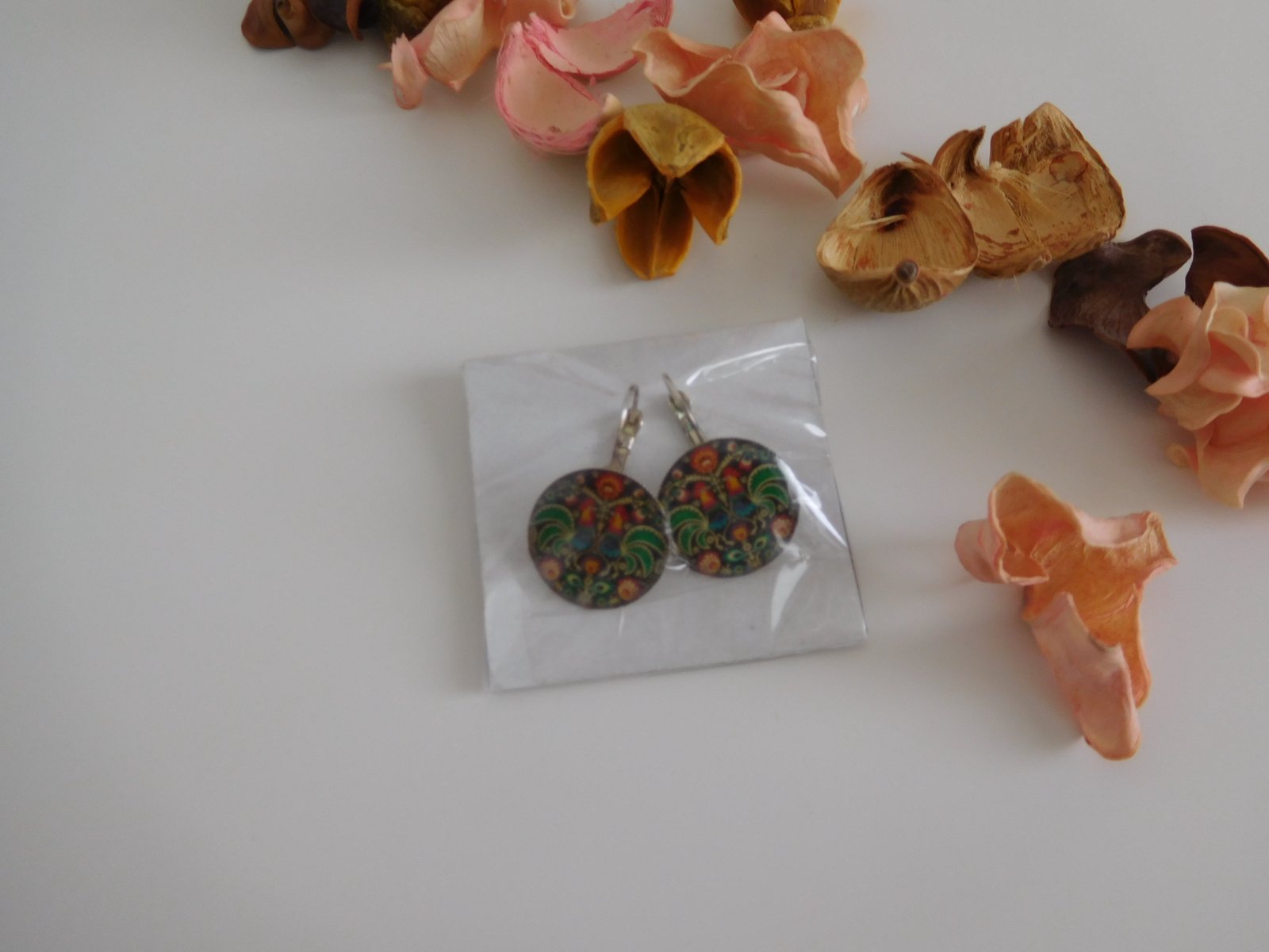 Handmade náušnice vyrobené z farebných kamienkov a koženkových strapcov, nalepené na zlatom podklade, zapínanie je napichovacie s klapkou