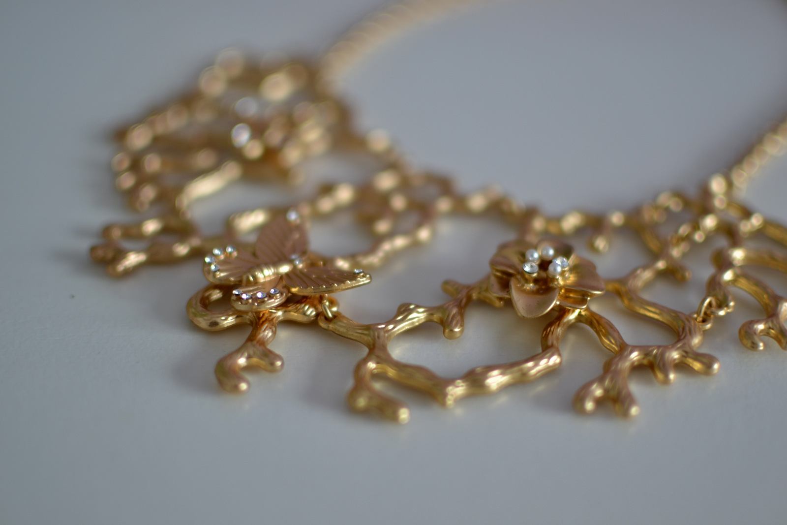 Krásny, masívny náhrdelník, na retiazke z matnej zlatistej mosadze zdobený príveskom v tvare konárov stromov, kvetov a motýľov. Je vykladaný trblietavými sklenenými kamienkami a perličkami. Nový, nenosený, ešte v darčekovej krabičke.