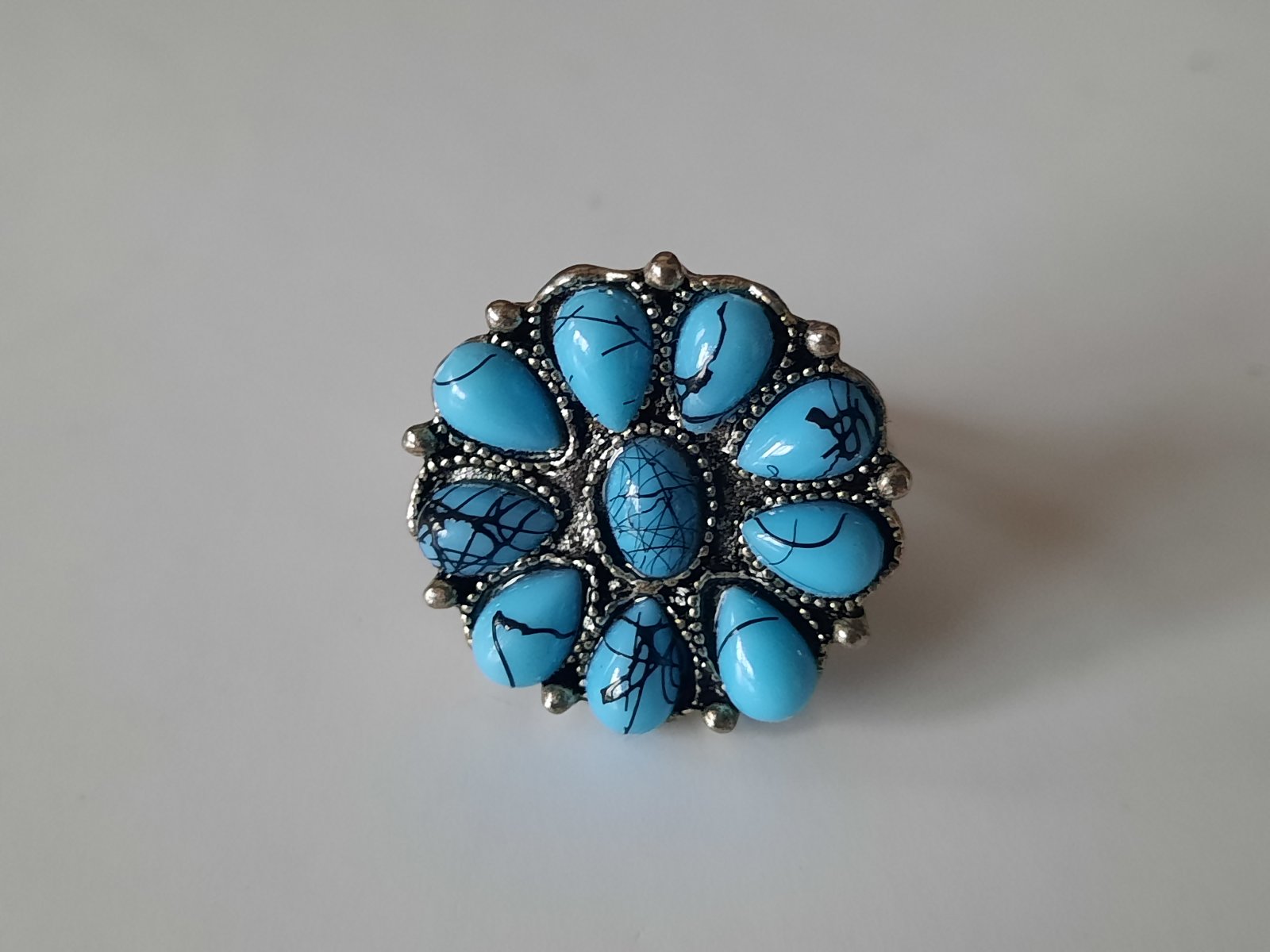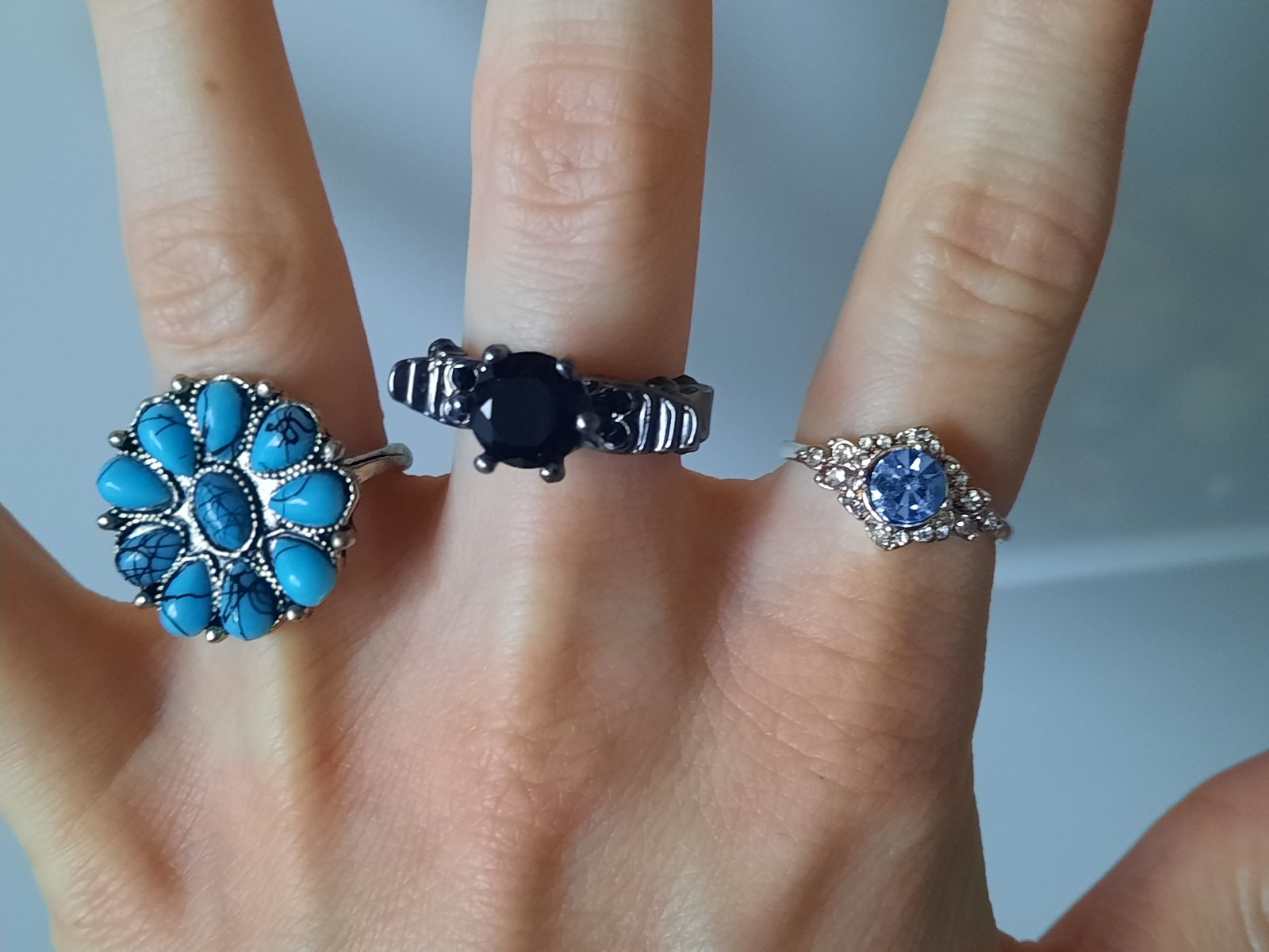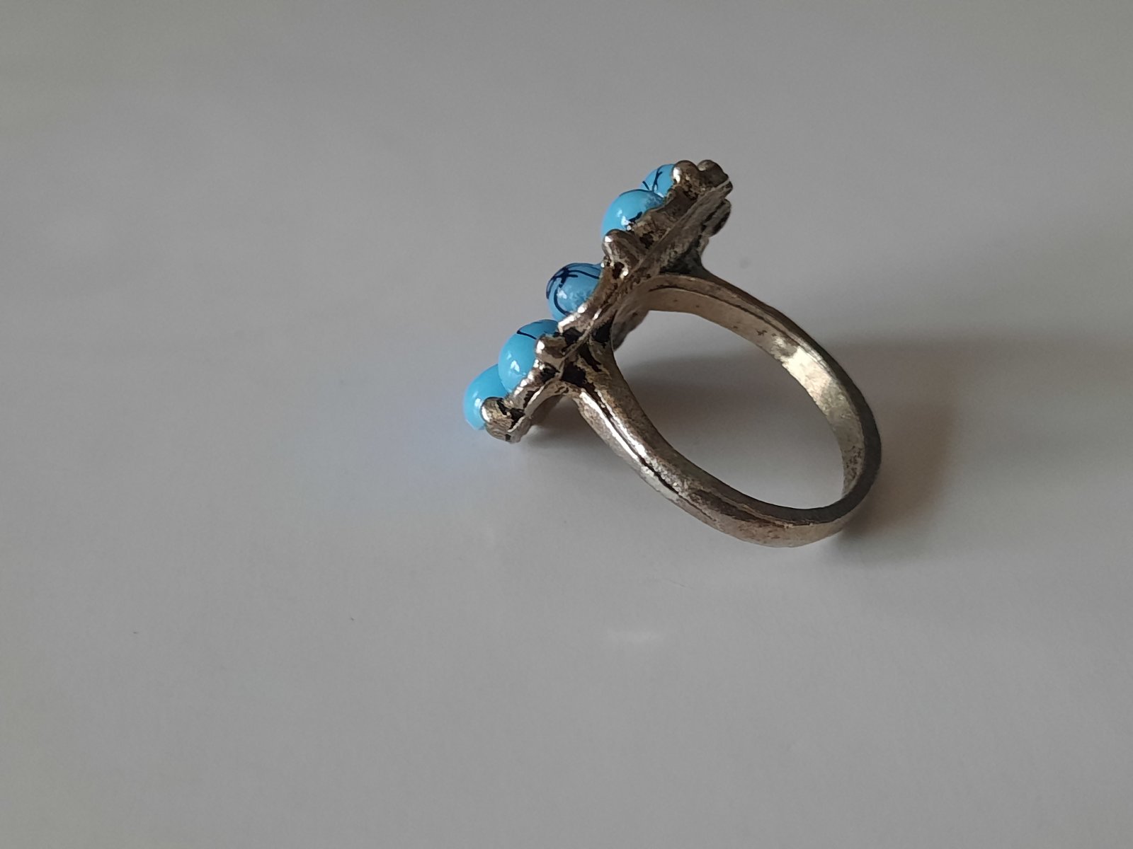 1. prsteň striebornosivej farby, modrá kvetinka, veľkosť S (5€)
