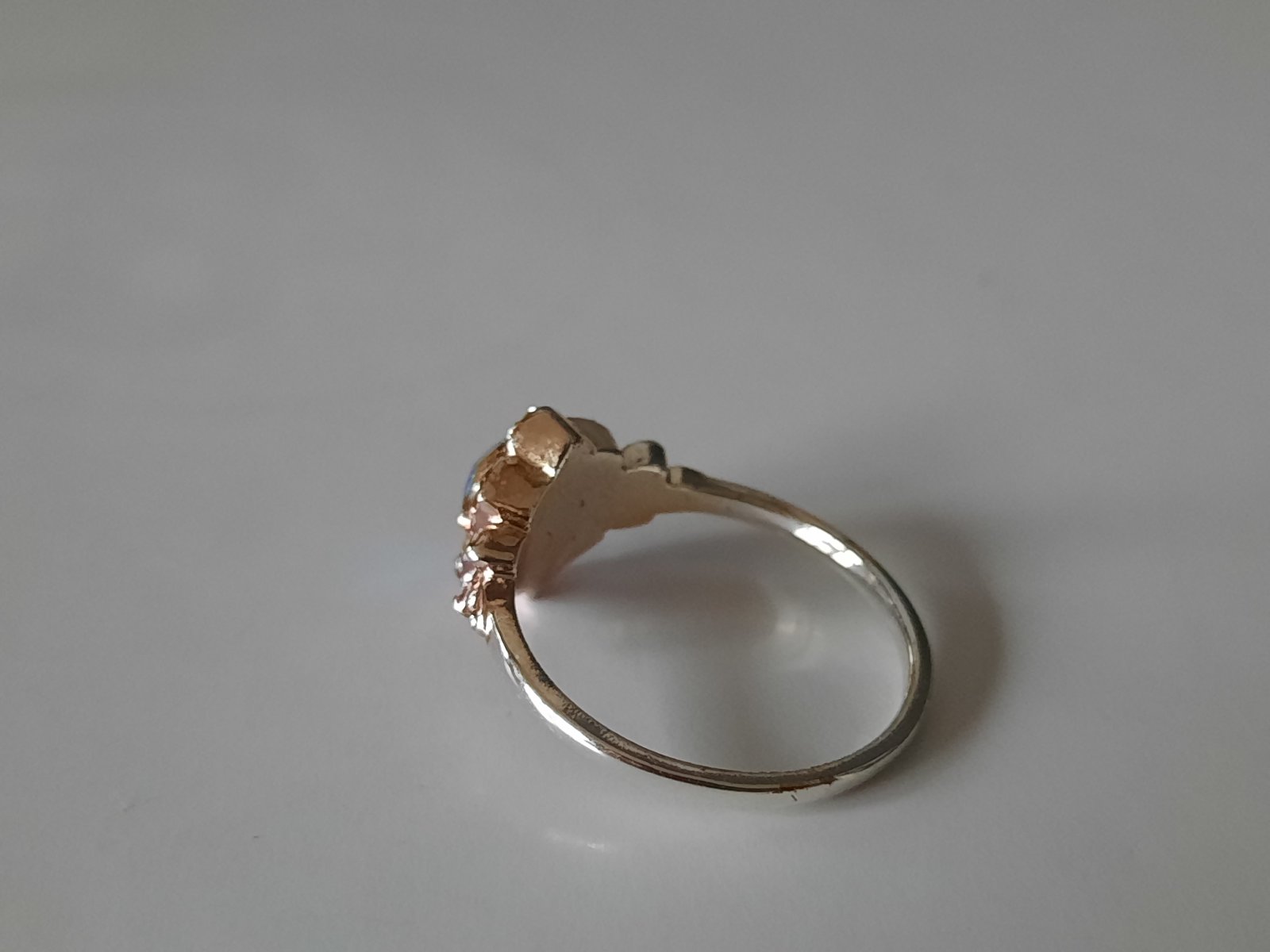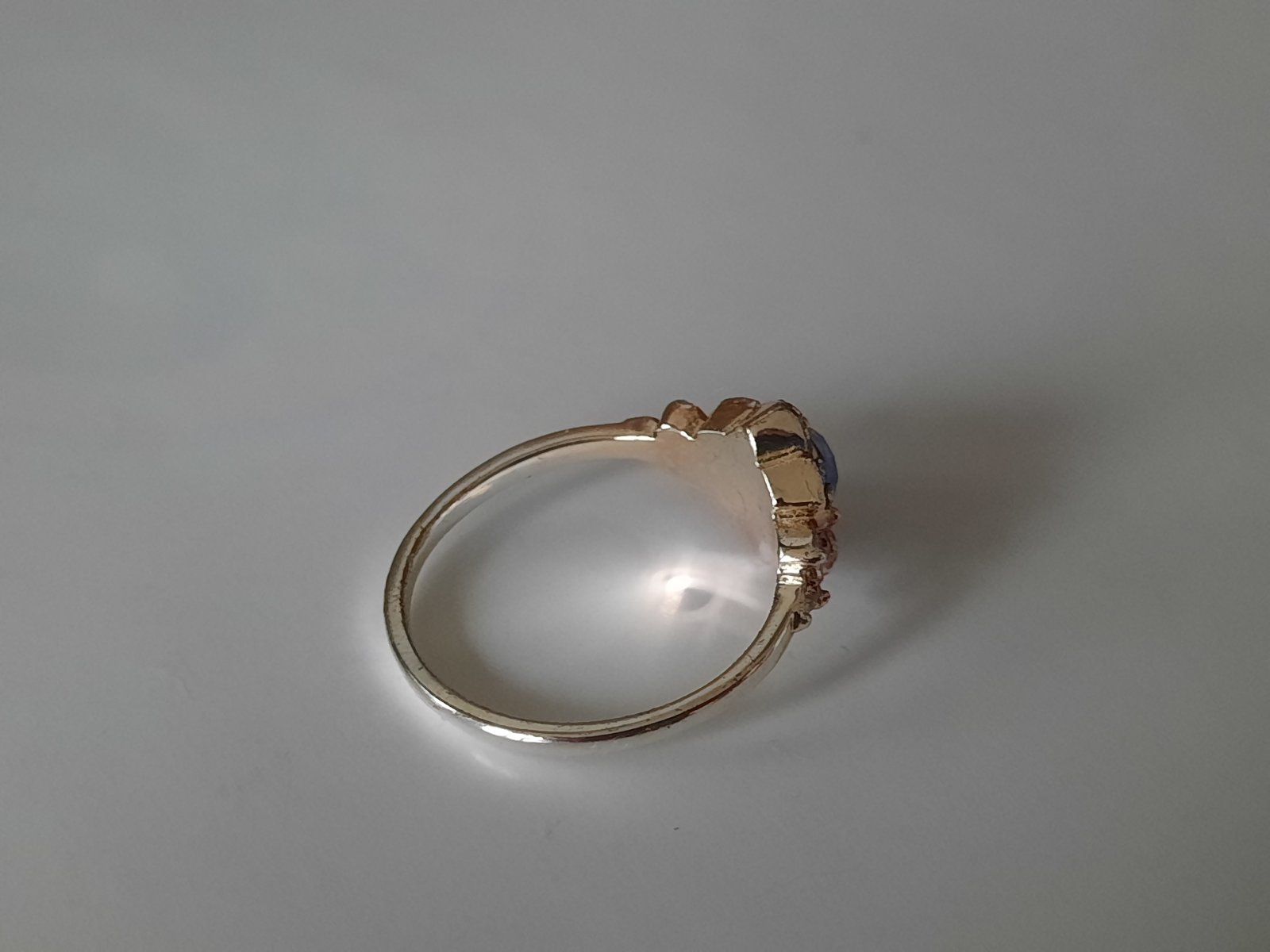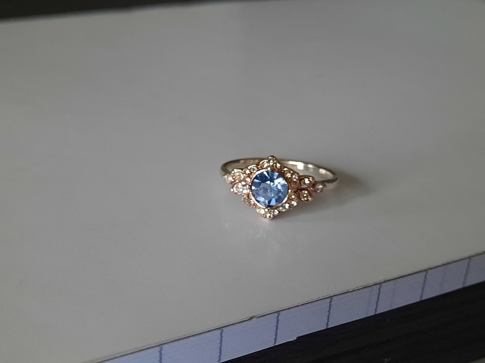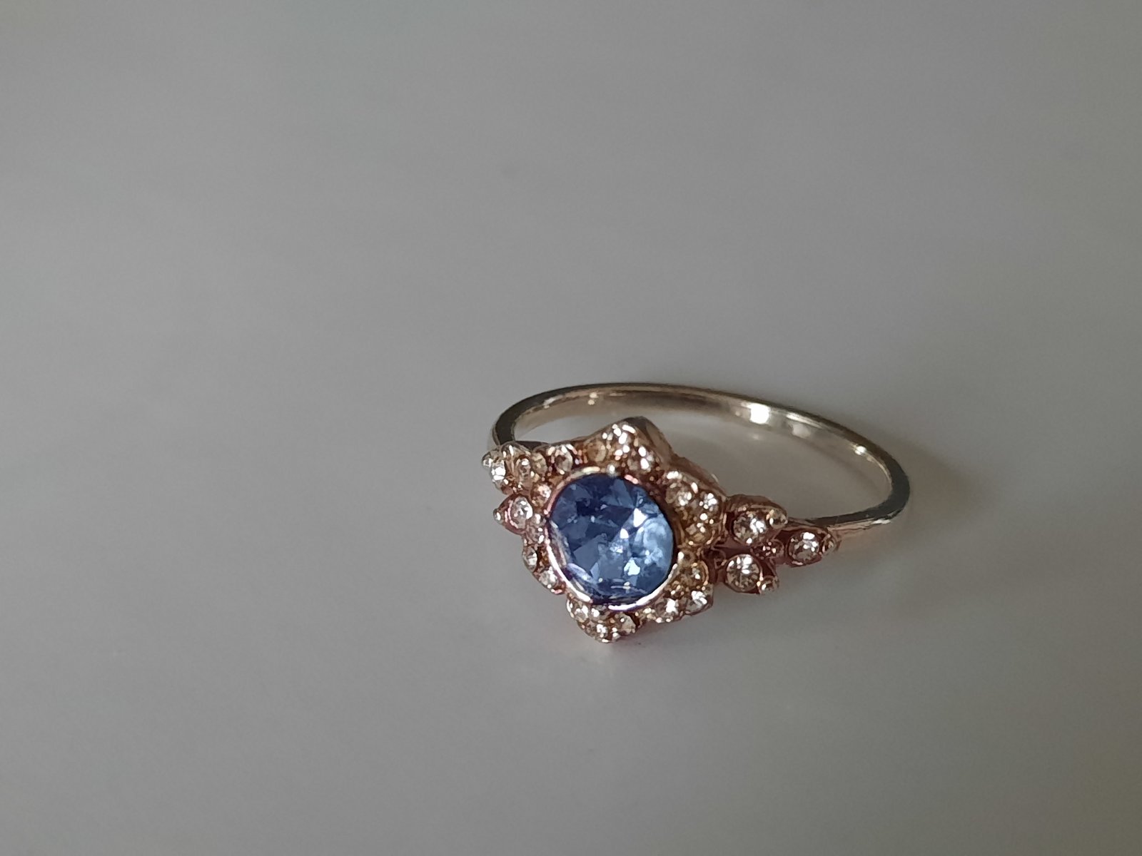 3. prsteň zlatej farby s falošnými bielymi diamantami a falošným modrým diamantom uprostred, veľkosť XS-S (3€)