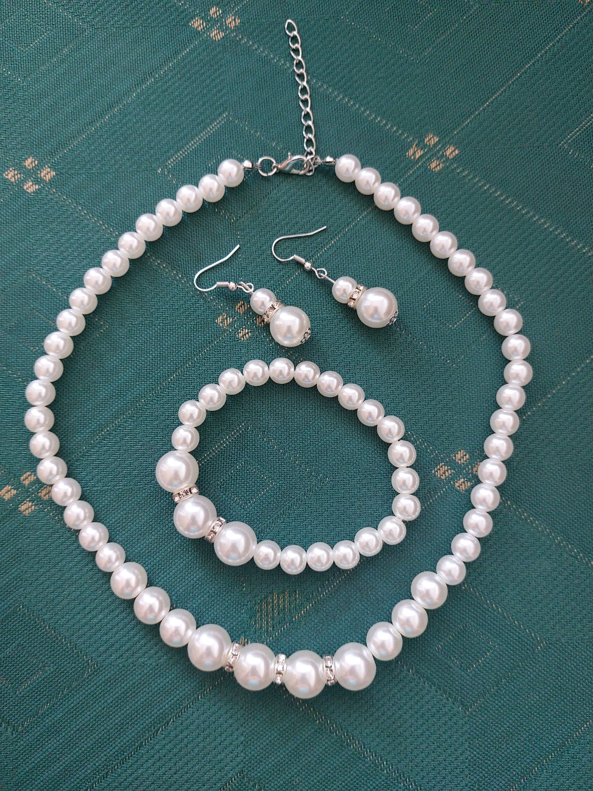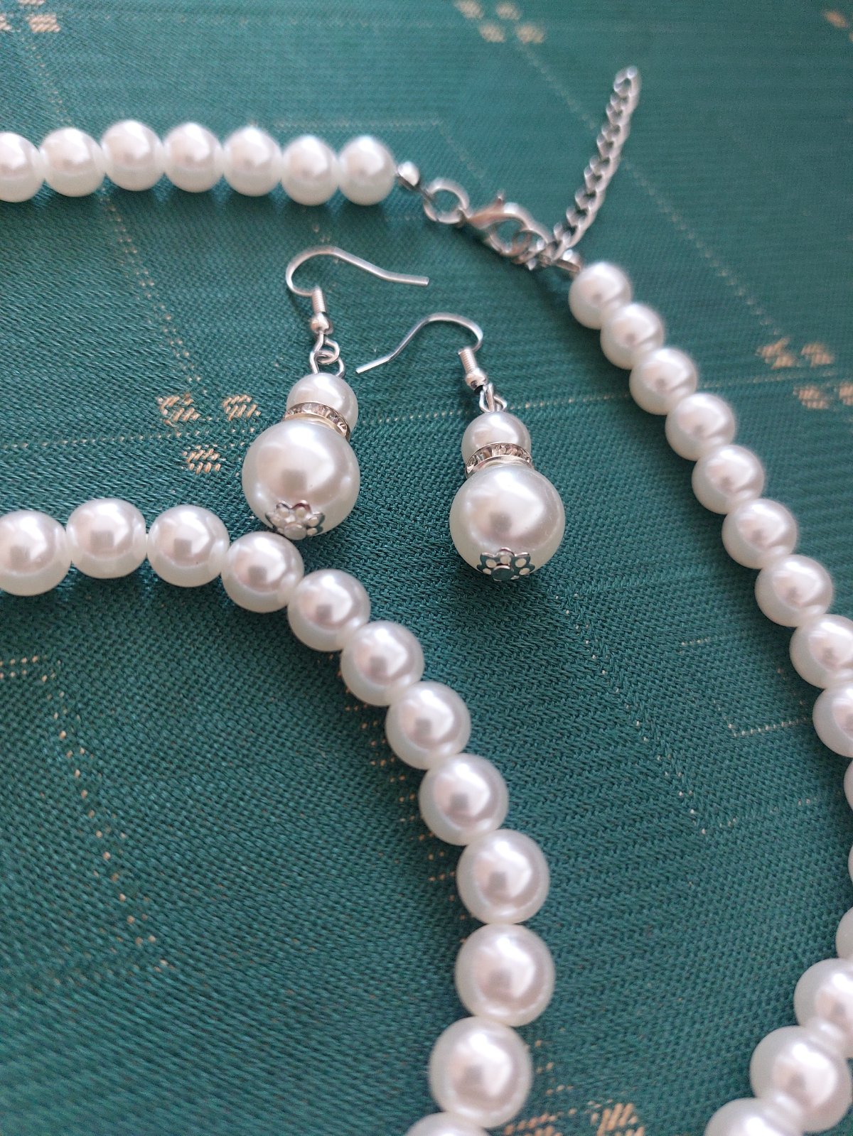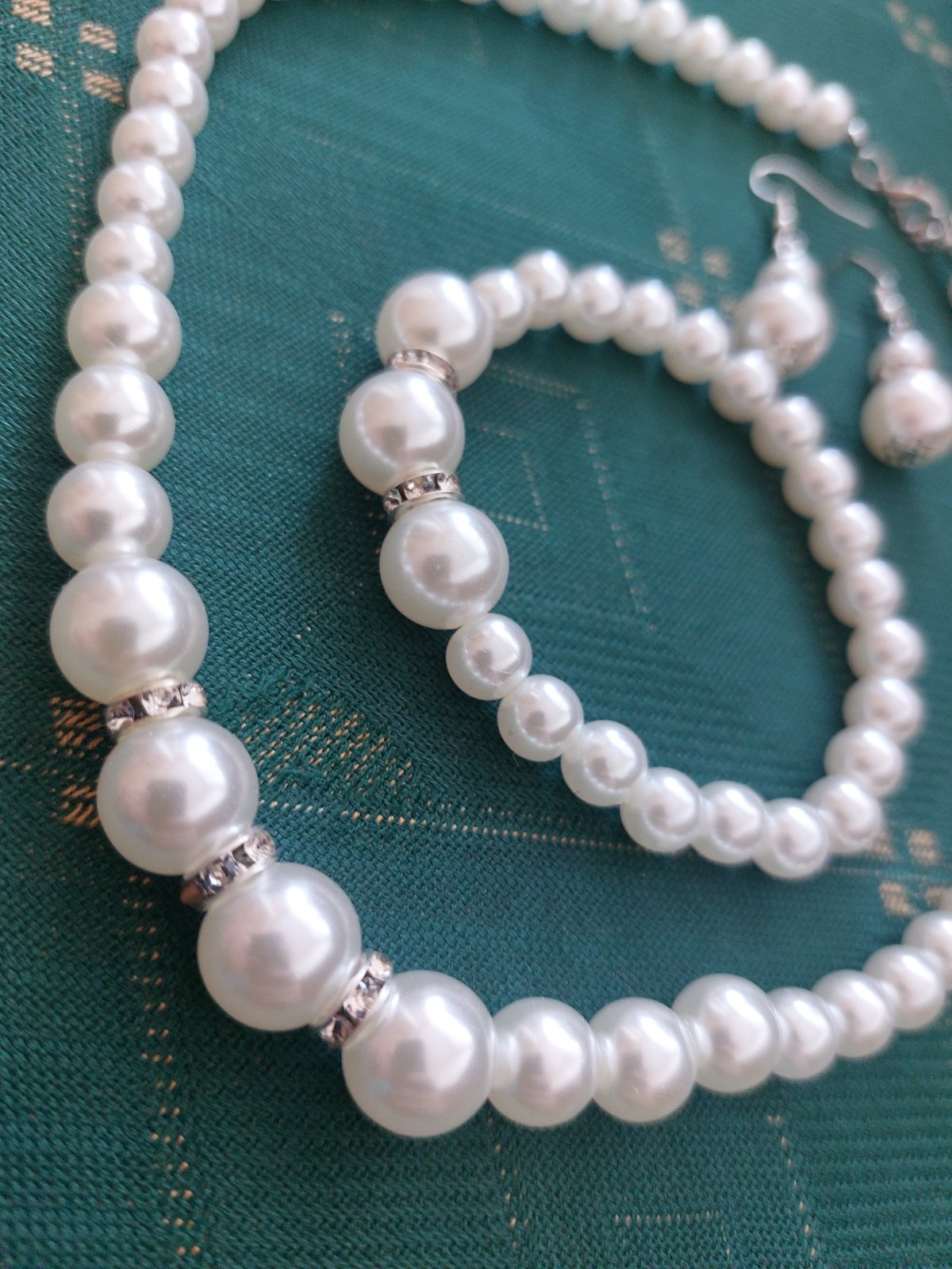 Súprava pozostáva z náušníc,prívesku a náramku z prírodnej perlete.Cena je 7Eúr.