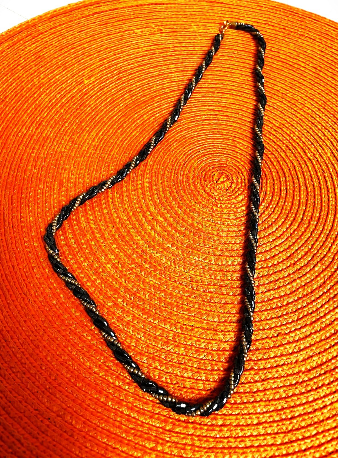 krásny jemný elegantný náhrdelník,točená reťaz z drobných korálikov,popretkávaná zlatým,jemne metalízovaná farba,1 x použitý, v top stave,dlžka = 58 cm