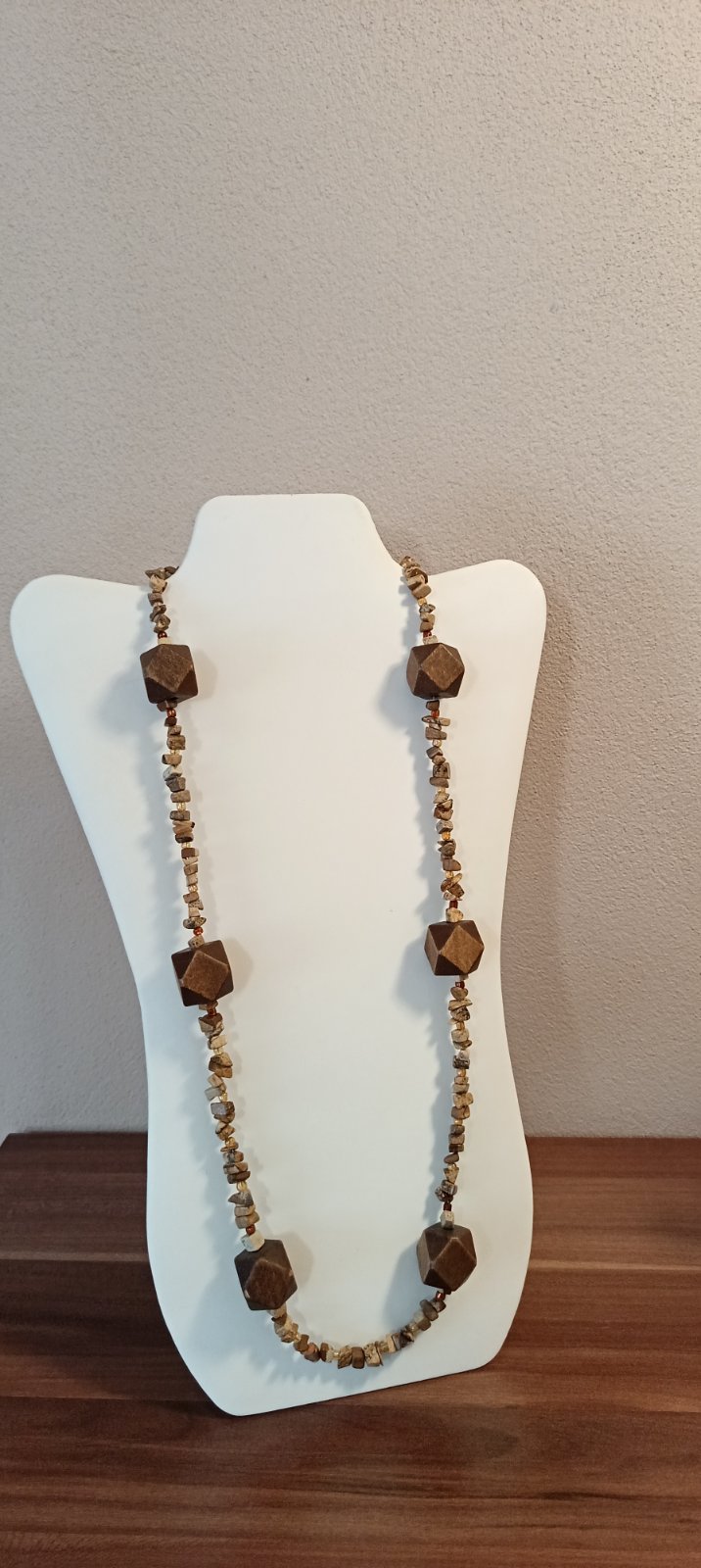 Náhrdelník je kombináciou brúsených drevených kociek, drobných úlomkov leopardieho jaspisu a sklenených korálok.