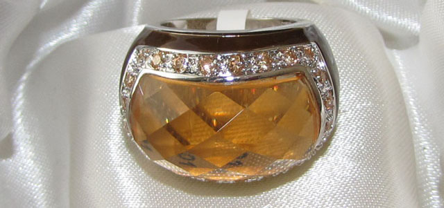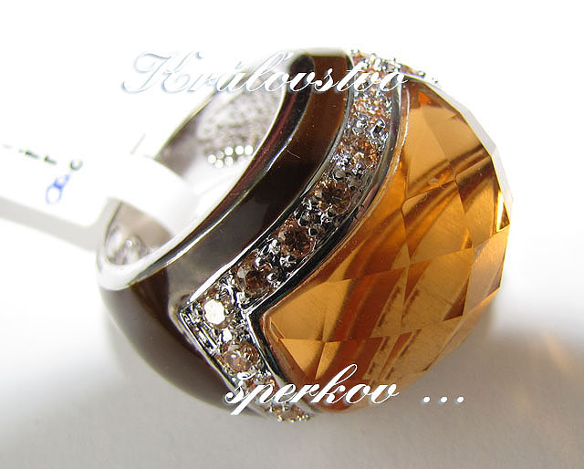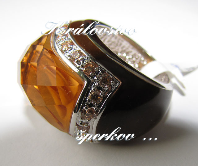 Prsteň je pokovaný rhodiom s kryštálmi CZ. Povrch je potiahnutý hnedým e-mailom. Kameň 2.5 x 1.5 cm.