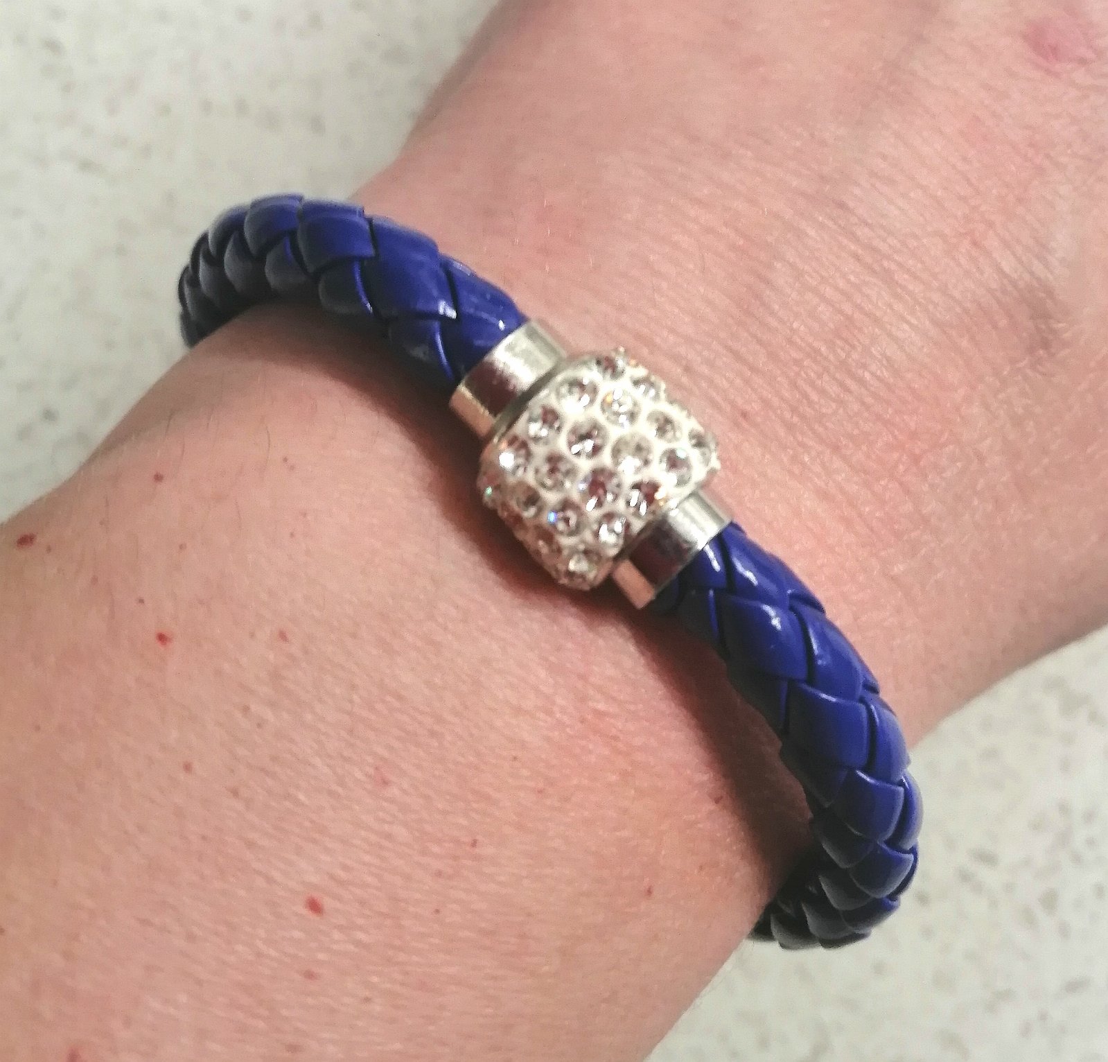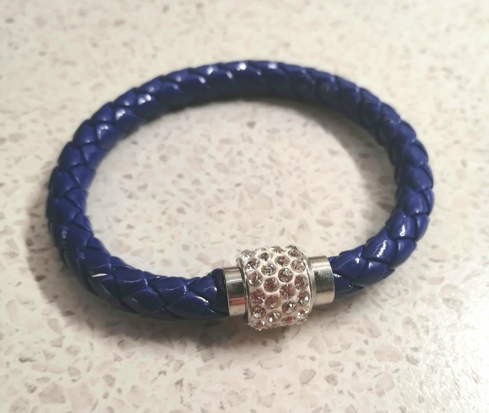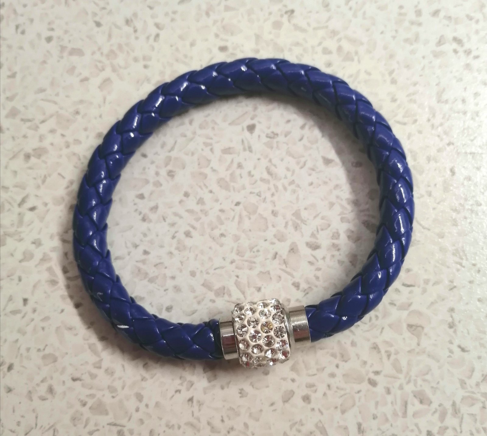 Elegantný dámsky /dievčenský náramok zo syntetickej lakovanej kože, v tmavomodrej farbe, magnetické zapínanie zdobené bielymi štrasovými kamienkami.