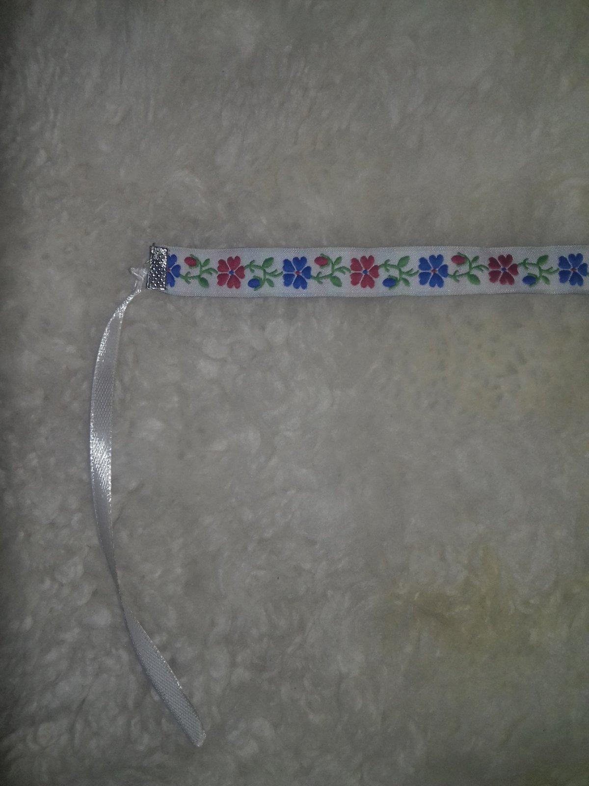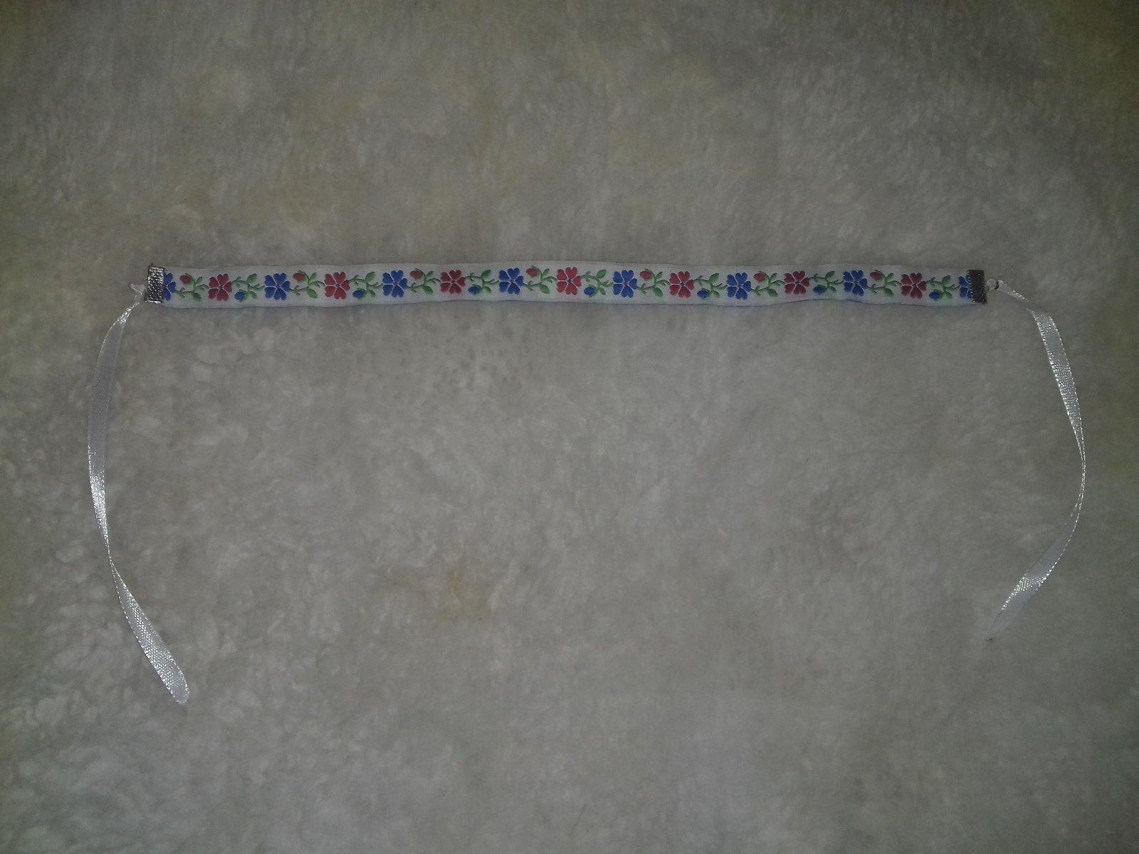 Na bielom podklade červeno – modré kvietočky so zelenými lístkami. Choker je dlhý cca 30 cm, široký 1,5 cm. Dĺžka sa dá regulovať vďaka bielej tenkej stužke na jeho kovových koncovkách.