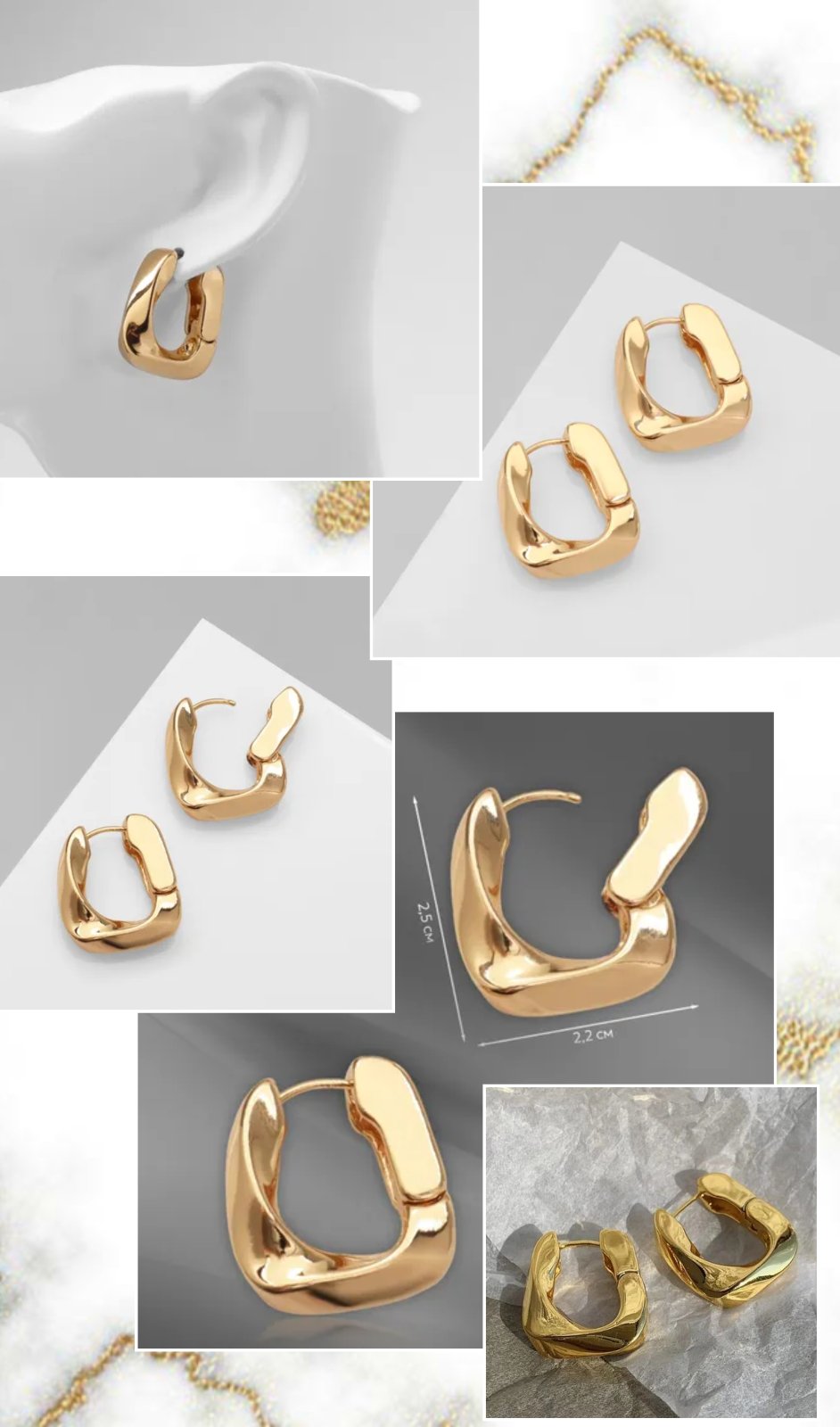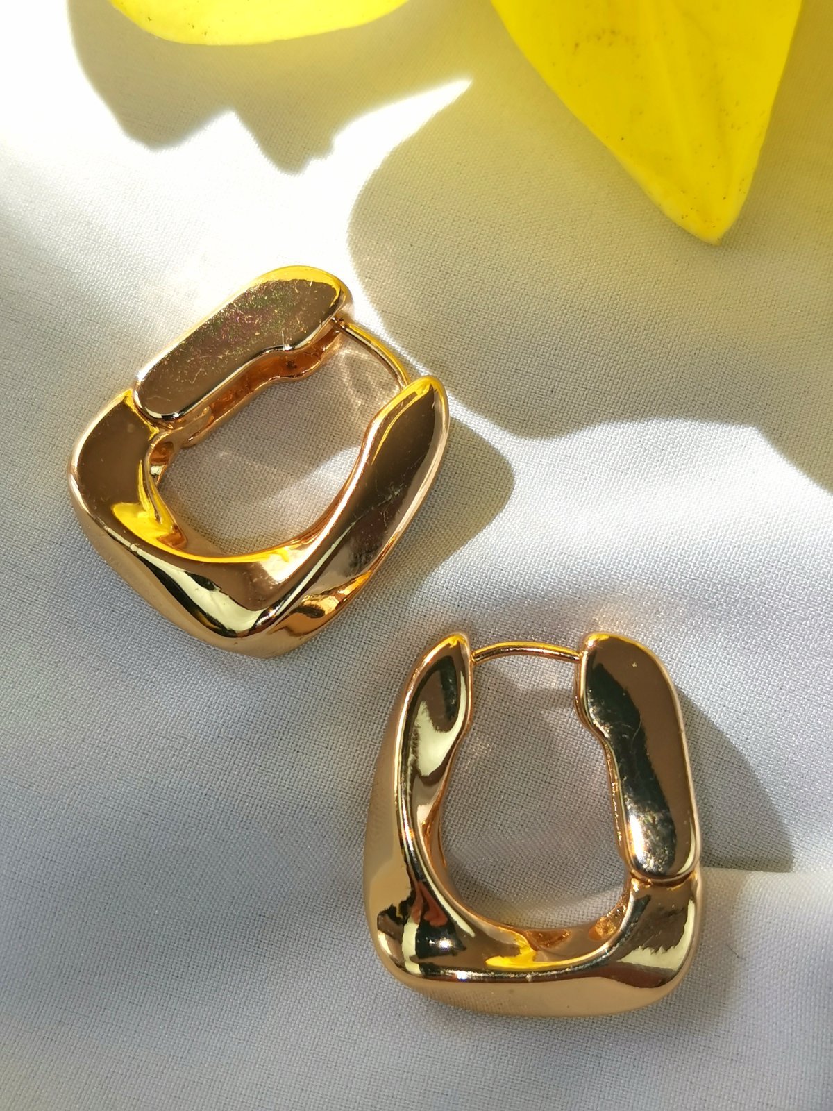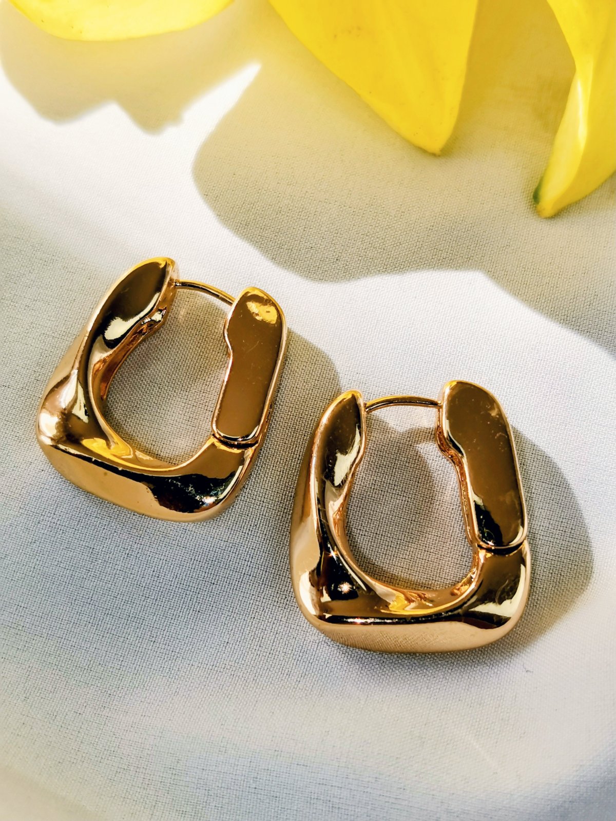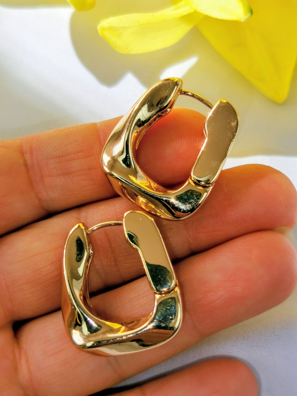 Tieto jednoduché, ale výrazné náušnice sú vyrobené z pozlátenej mosadze, ktorá je vyleštená do vysokého lesku a tvarovaná do hrubého, štvorcového tvaru. Budú tvoriť rafinovanú bodku každého vzhľadu. Zapínanie na háčik.