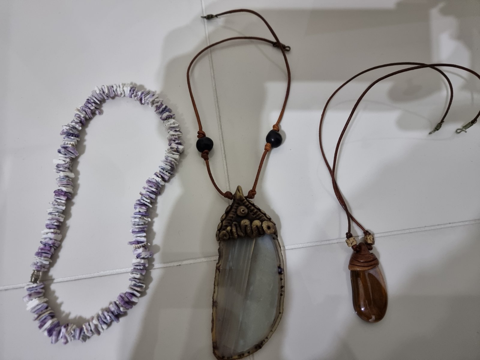 Predám fialovú retiazku z mušieĺ, veľký náhrdelník s nerastom a menší tmavohnedý so sklom kombinovaný. Cena každého kusu je 7 eur. Predám aj jednotlivo.