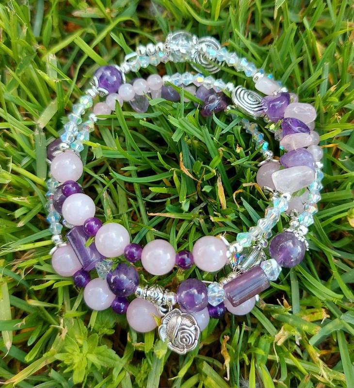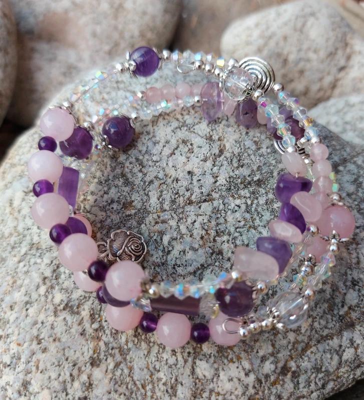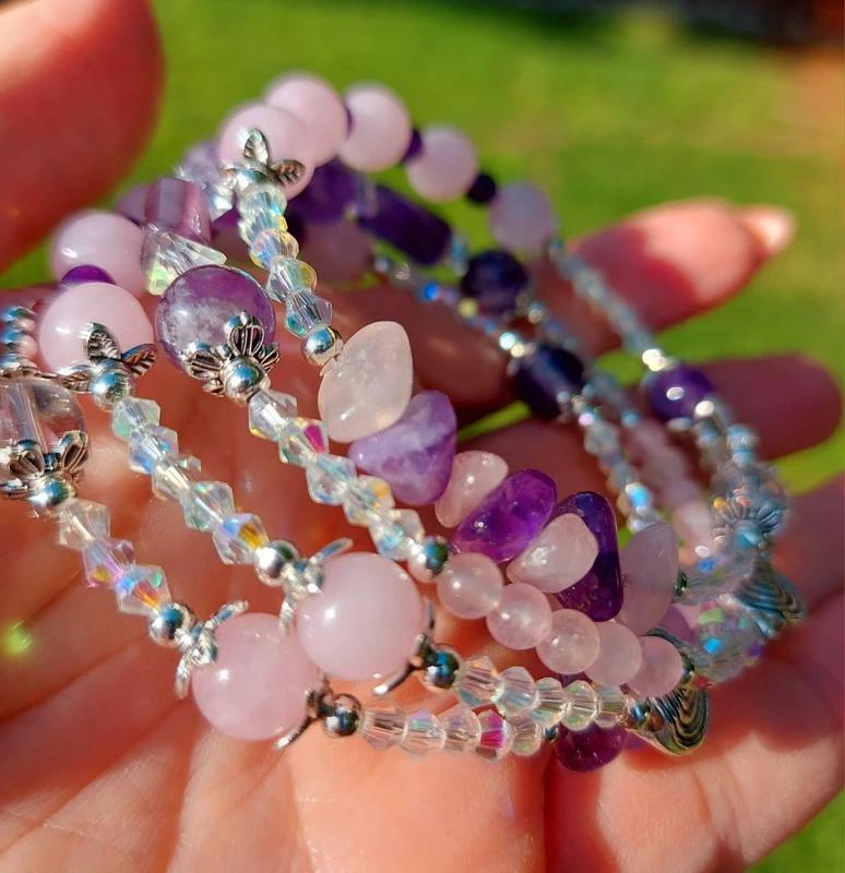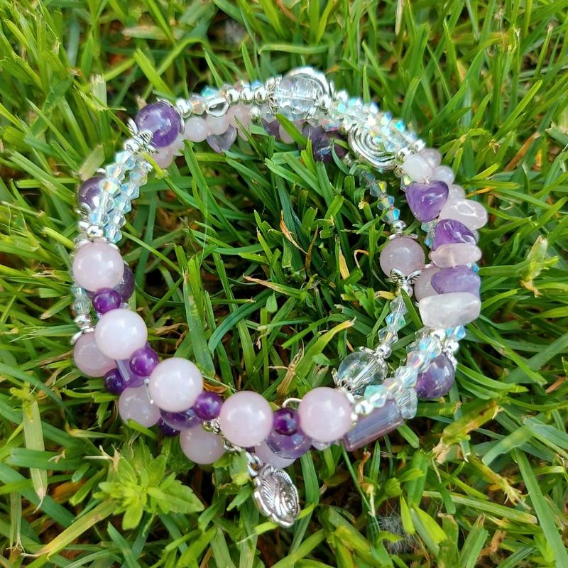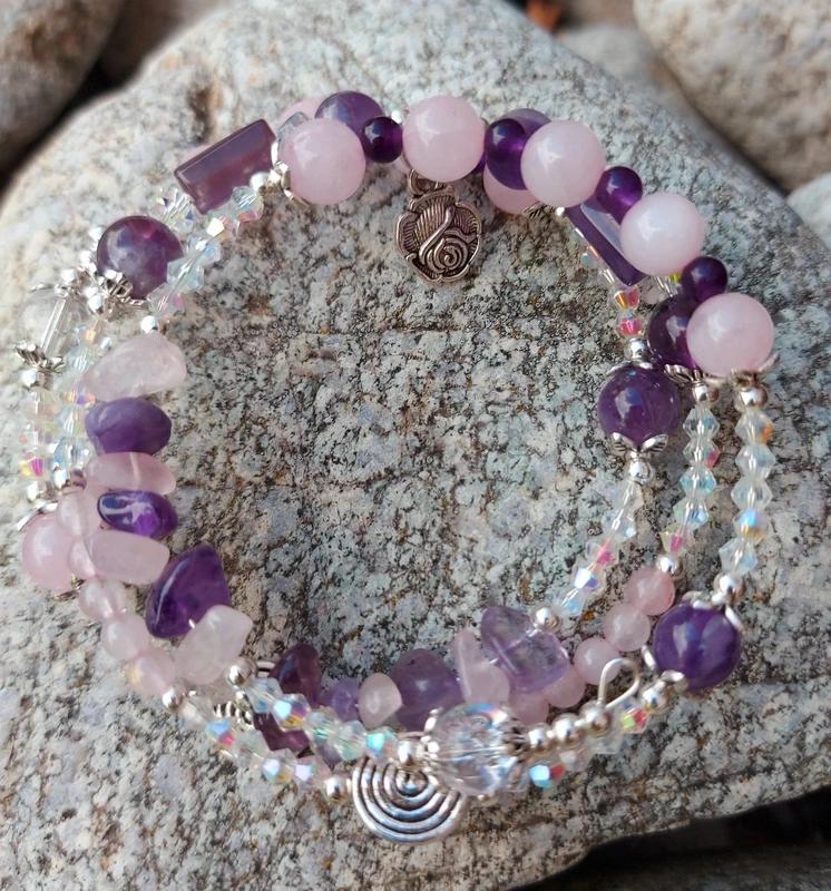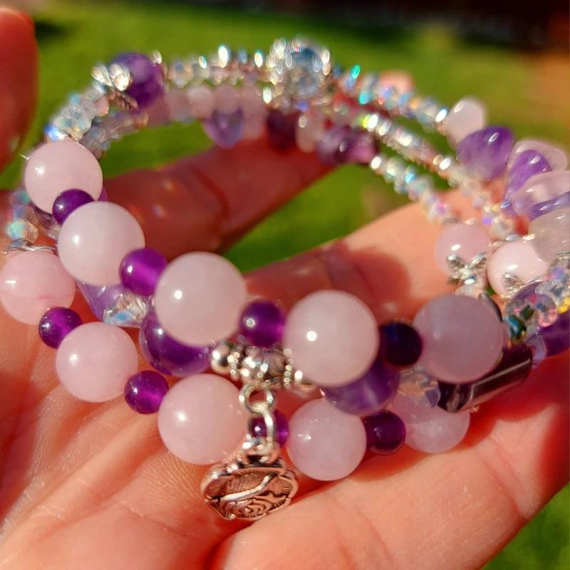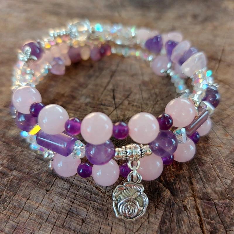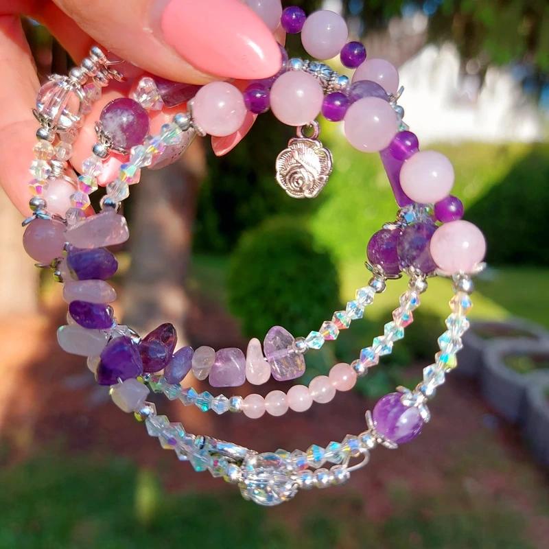 Tento elegantný náramok je vyrobený z kombinácie prírodného Ametystu a Ruženínu, ktoré sú známe svojimi ochrannými a harmonizačnými účinkami. Ozdobený je rakúskymi sklenenými krištálikmi, ktoré dodávajú náramku lesk.