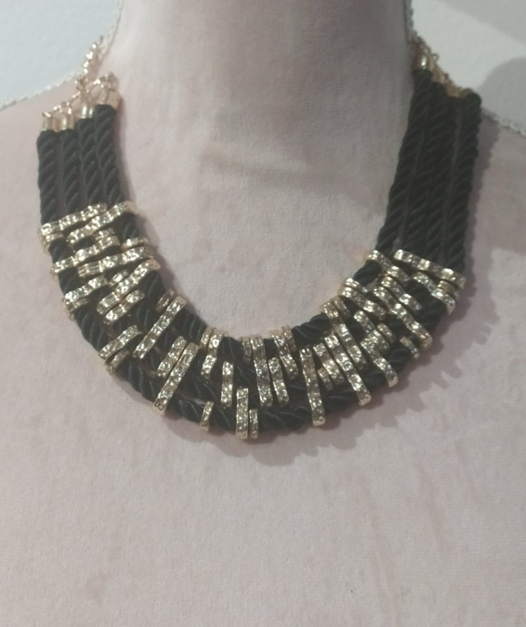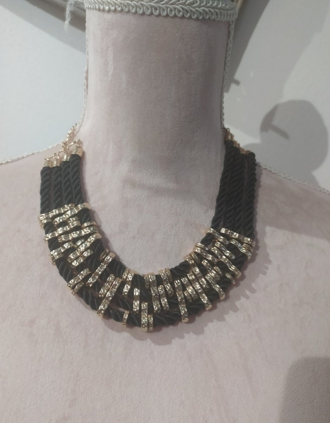 Jednoduchý náhrdelník s čiernou šnúrkou a trblietavou ozdobou v strede.