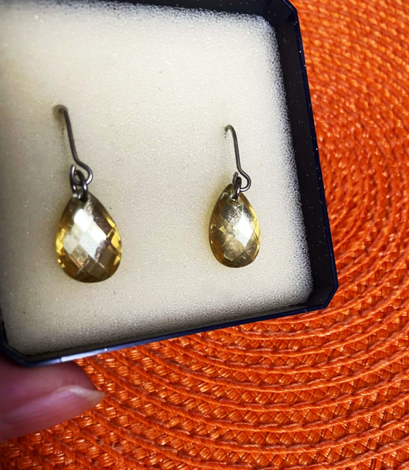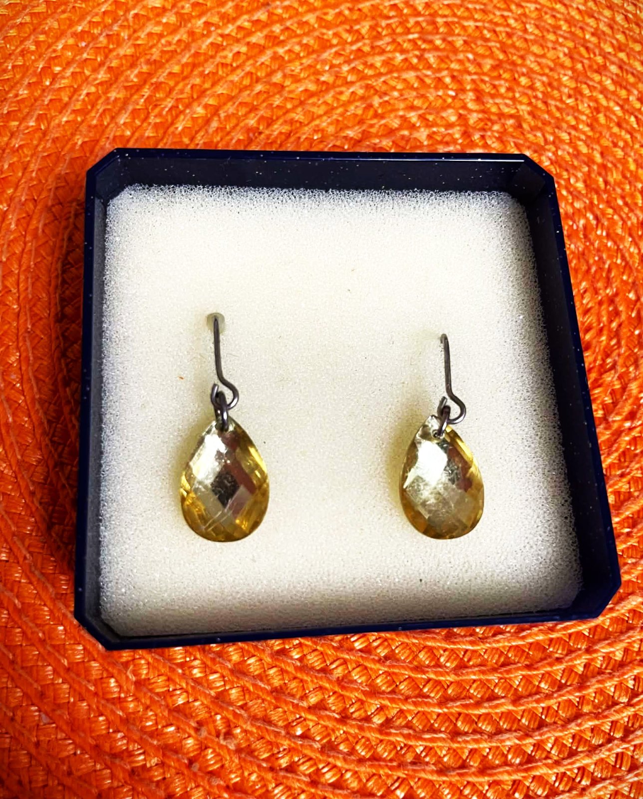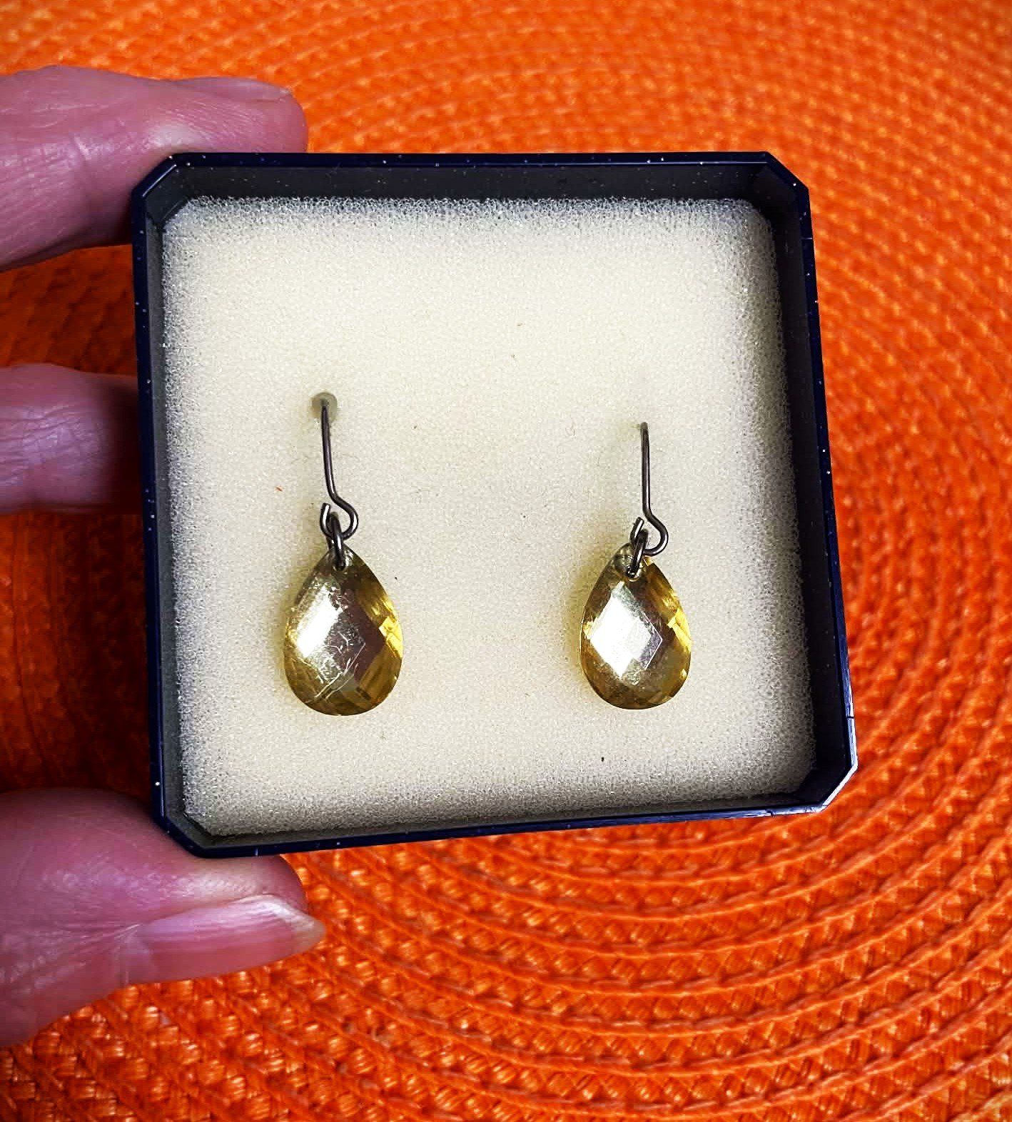krásne náušnice v tvare kvapky, visiace, s brúseným kamienkom citrín ,na spodnej strane sú ploché, na prednej plastické - brúsené,krásne odrážajú svetlo do žlto zlatého žiarivého odtieňa,očko : cca 1,5 x 1 cm