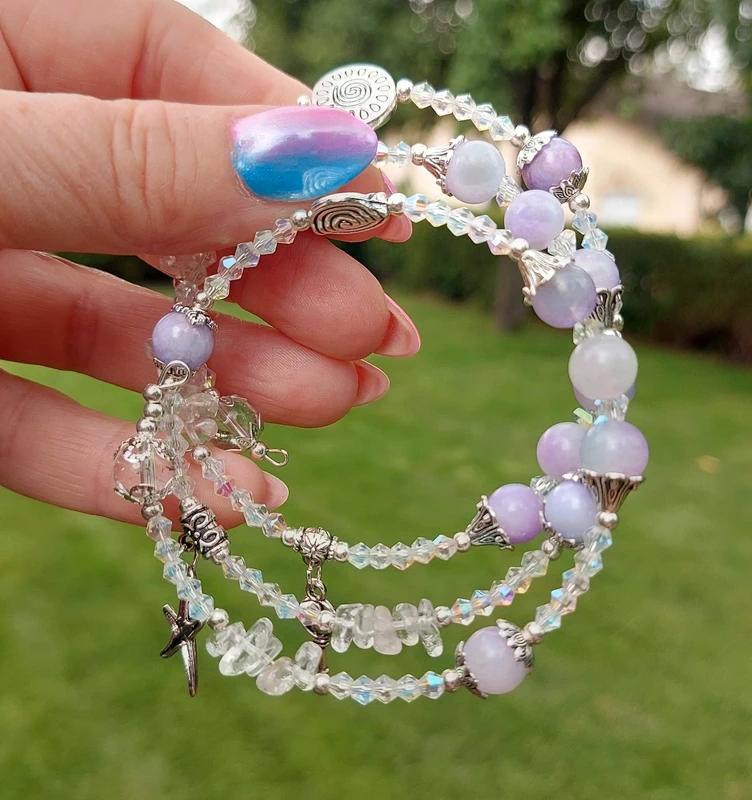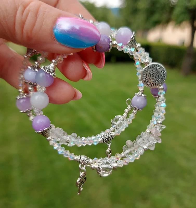 Hlavnú rolu tu hrá fialkavý chalcedón, ktorý som skombinovala s čírym krištáľom a jemne sa trblietajúcimi rakúskymi krištálikmi. Celé som to doladila striebornými komponentmi a dvomi symbolickými príveskami – morská hviezdica a mystický kľúč. Jeden pripomína slobodu a spojenie s prírodou, druhý otvára dvere do tvojej vnútornej sily a intuície. 🧜♀️🗝️