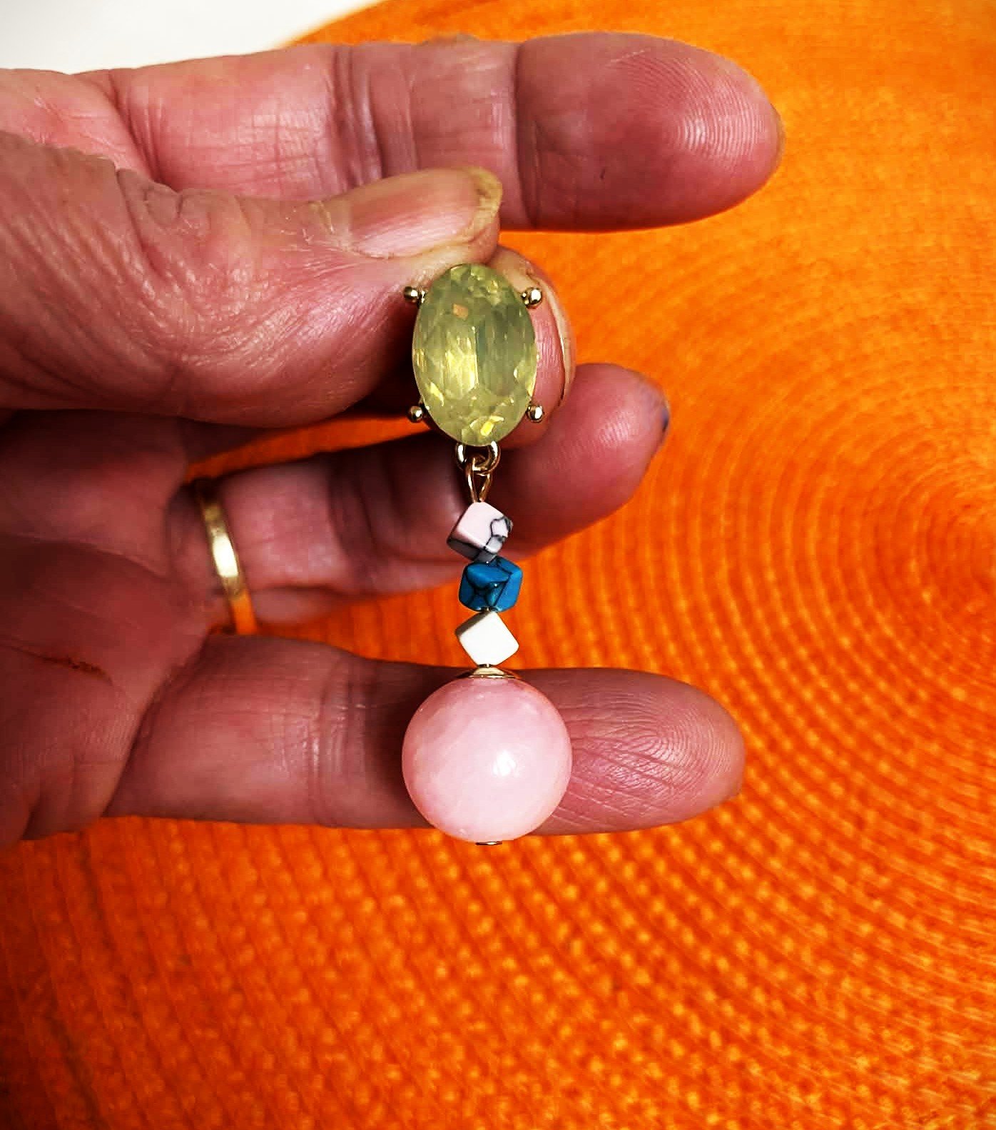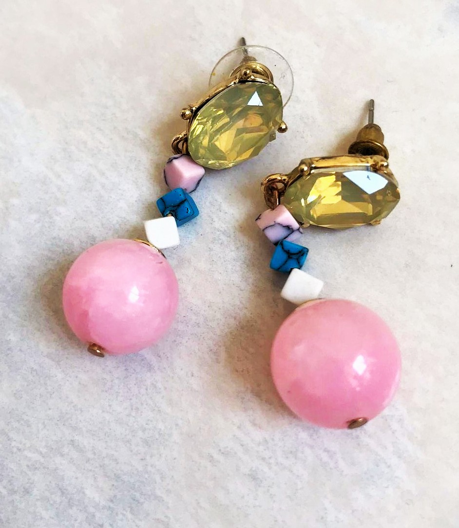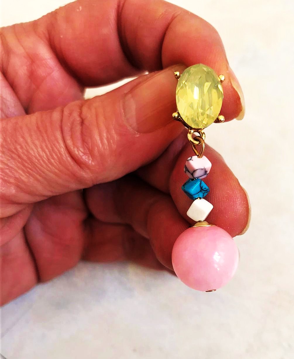 spoločenské visiace náušnice s napichovacím zapínaním,väčší, brúsený kameň,ktorý je dominantný mení farby ako opál s jemným brúsením (fazetovaním) je upevnený v kovovom lôžku zlatej farby, stredná časť sa skladá sa z menších, nepravidelne tvarovaných korálikov v odtieňoch ružovej, bielej a tyrkysovej farby,spodná časť je veľká, guľatá, ružová mliečna matná umelá perla,dlžka = 4,3 cm,krásny doplnok
