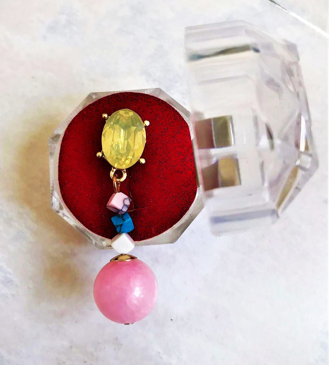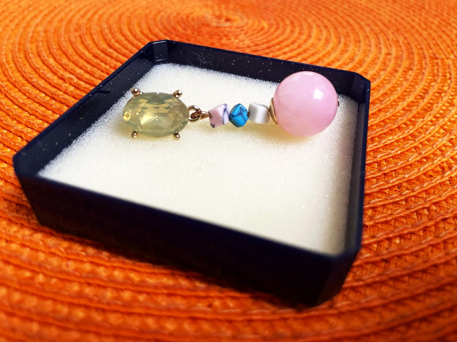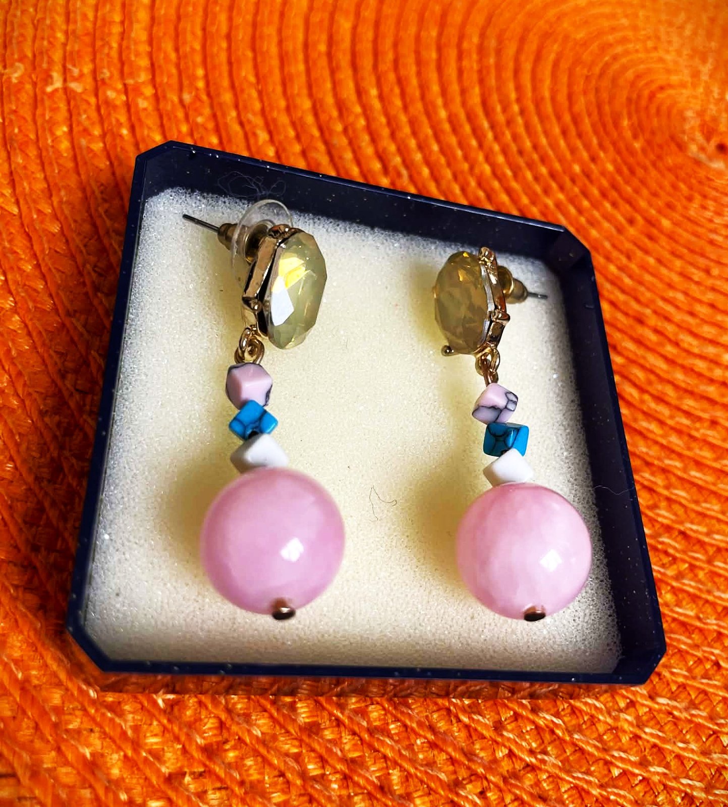 spoločenské visiace náušnice s napichovacím zapínaním,väčší, brúsený kameň,ktorý je dominantný mení farby ako opál s jemným brúsením (fazetovaním) je upevnený v kovovom lôžku zlatej farby, stredná časť sa skladá sa z menších, nepravidelne tvarovaných korálikov v odtieňoch ružovej, bielej a tyrkysovej farby,spodná časť je veľká, guľatá, ružová mliečna matná umelá perla,dlžka = 4,3 cm,krásny doplnok