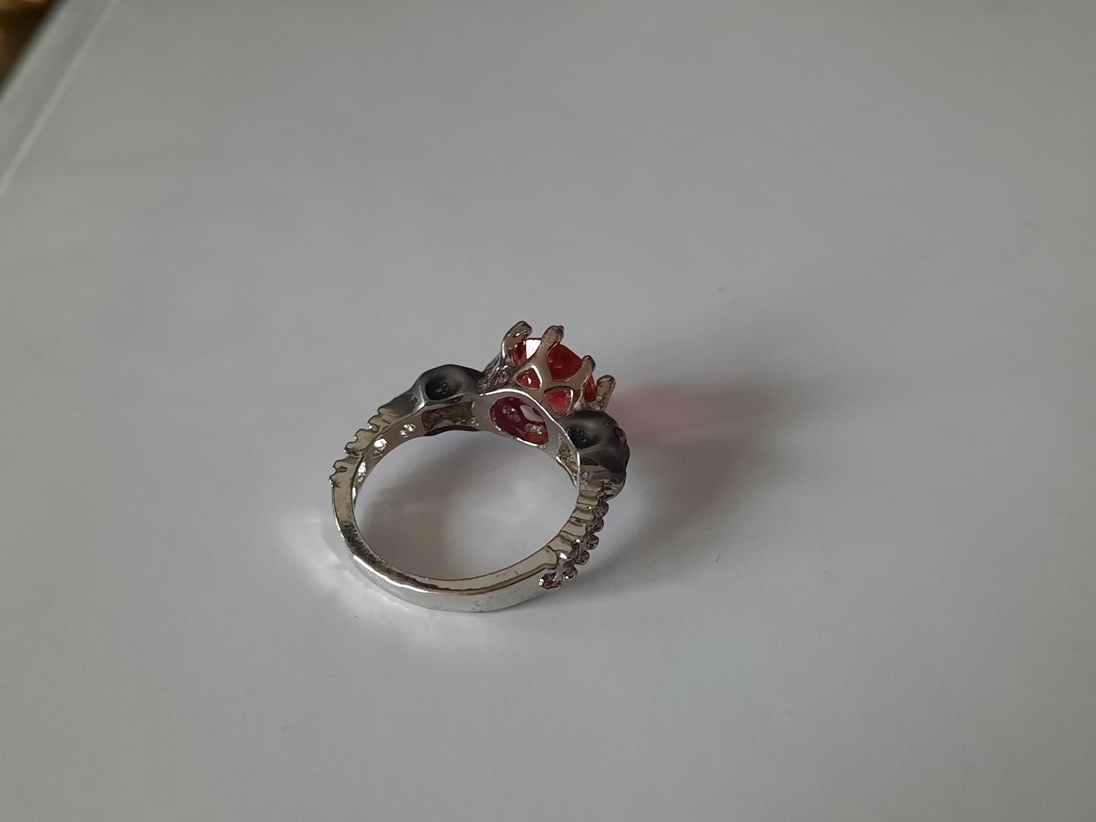 1. Prsteň šedostriebornej farby s červenými kamienkami a lebkami po stranách. Veľkosť S/M (6,50€)