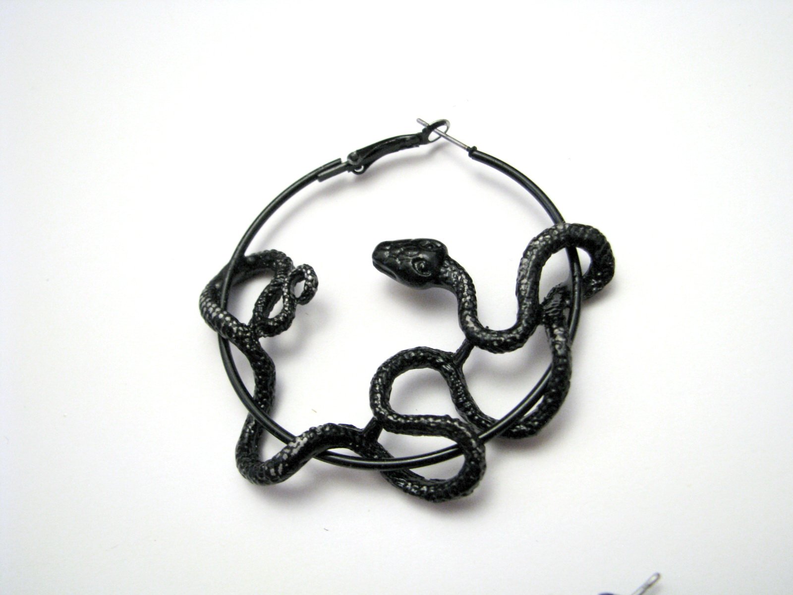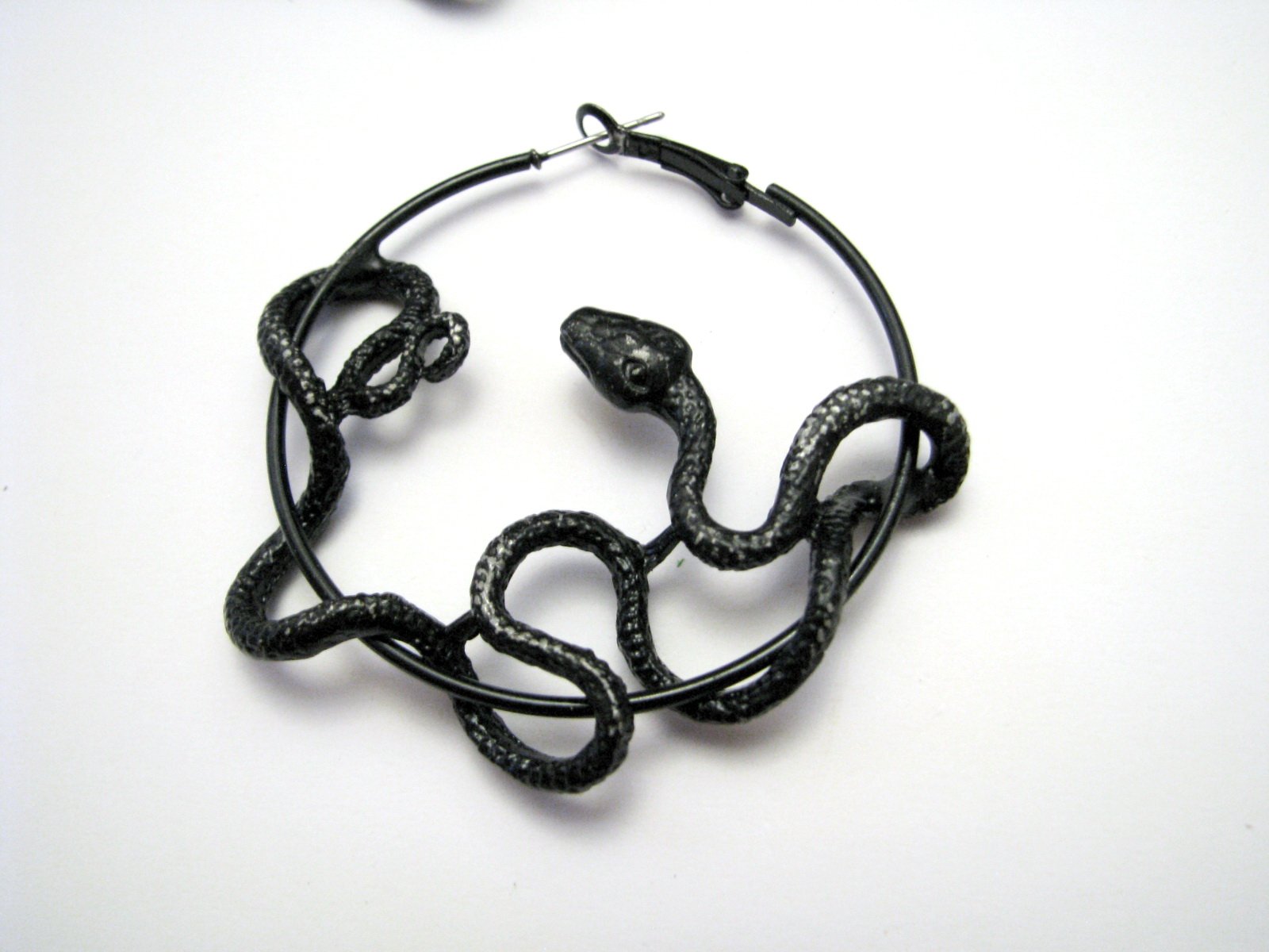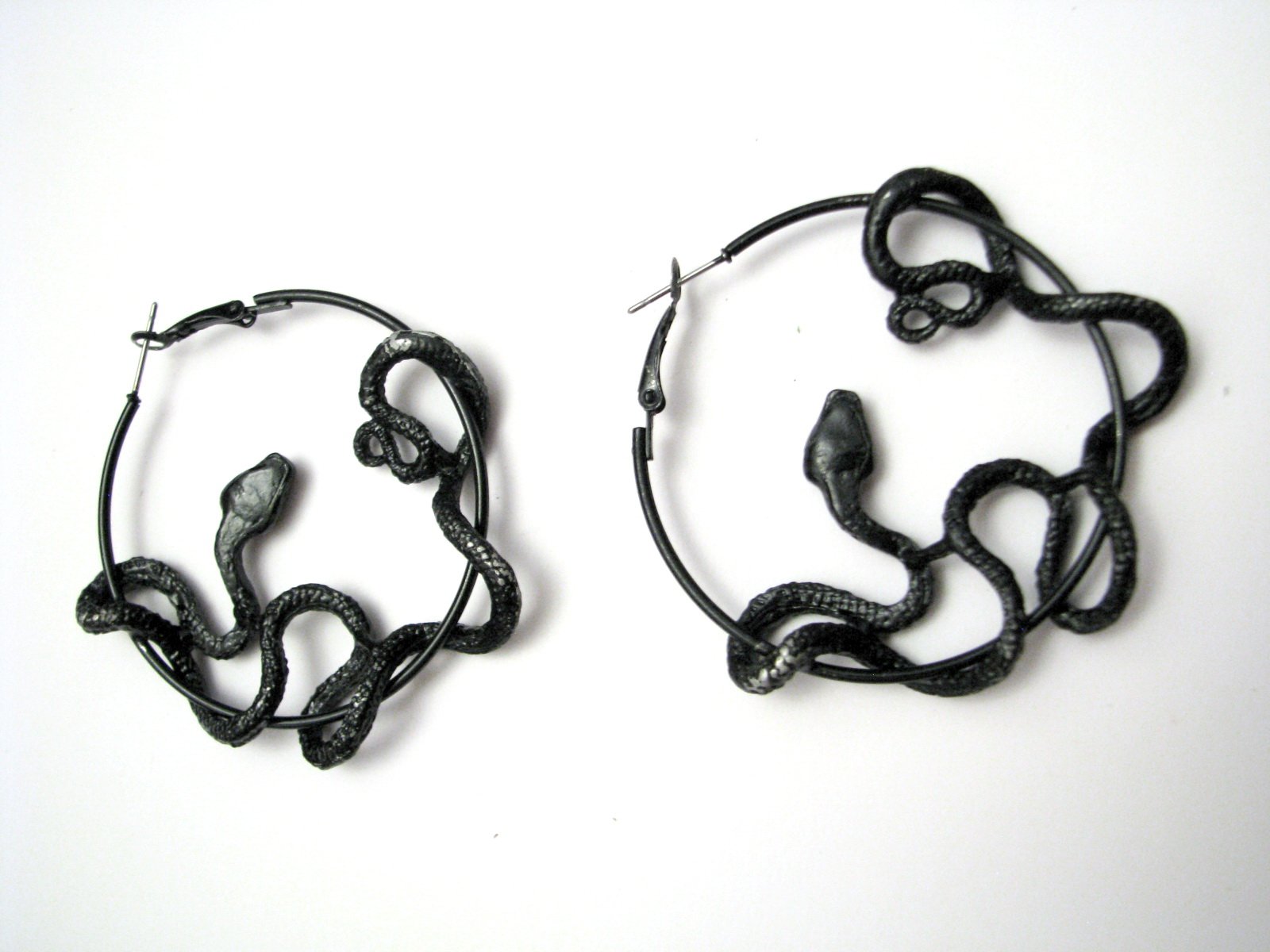 Výrazné kovové náušnice - čierne hady. Farba je miestami ošúchaná do striebornej, ak by vadilo, treba pretrieť/prestriekať čiernym lakom...
