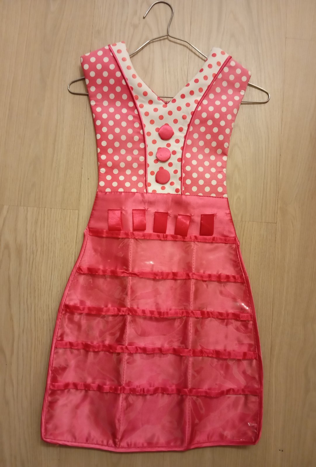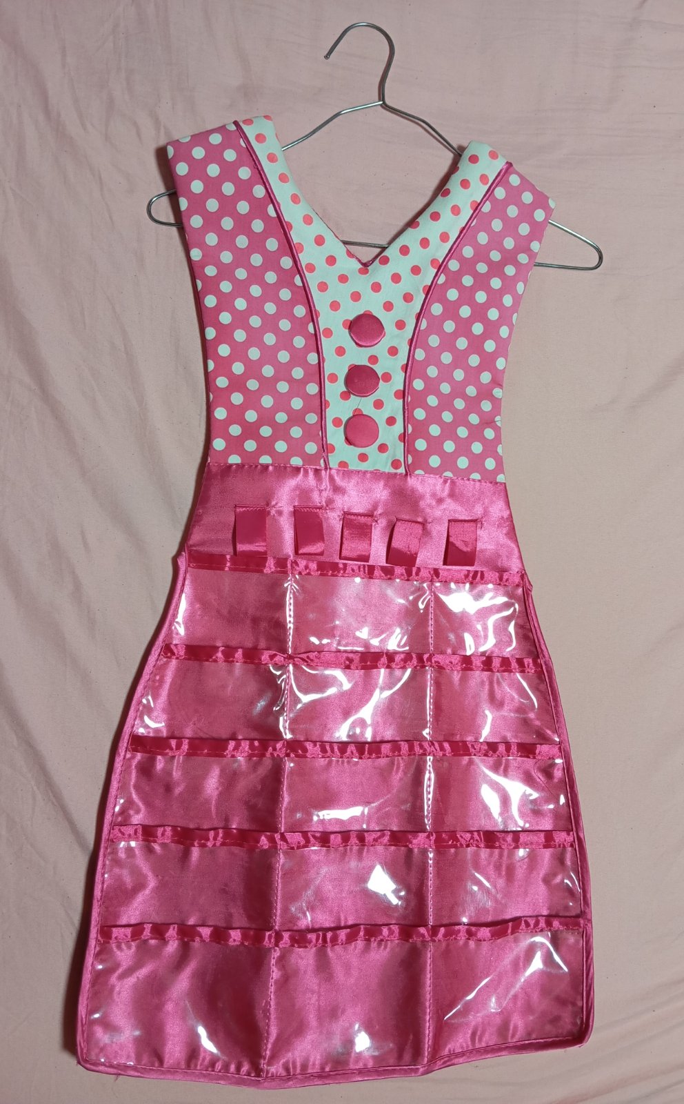 Závesný organizér na šperky v tvare šiat, ktorý obsahuje priesvitné priehradky a pútka na uloženie sponiek, gumičiek, prsteňov, náušníc a iných doplnkov. Rozmery 77 x 40 cm plus vešiak. Na vrchu v strede je kúsok rozpáraný, stačí zašiť. Zaujímavý doplnok do izby mladej slečny.
