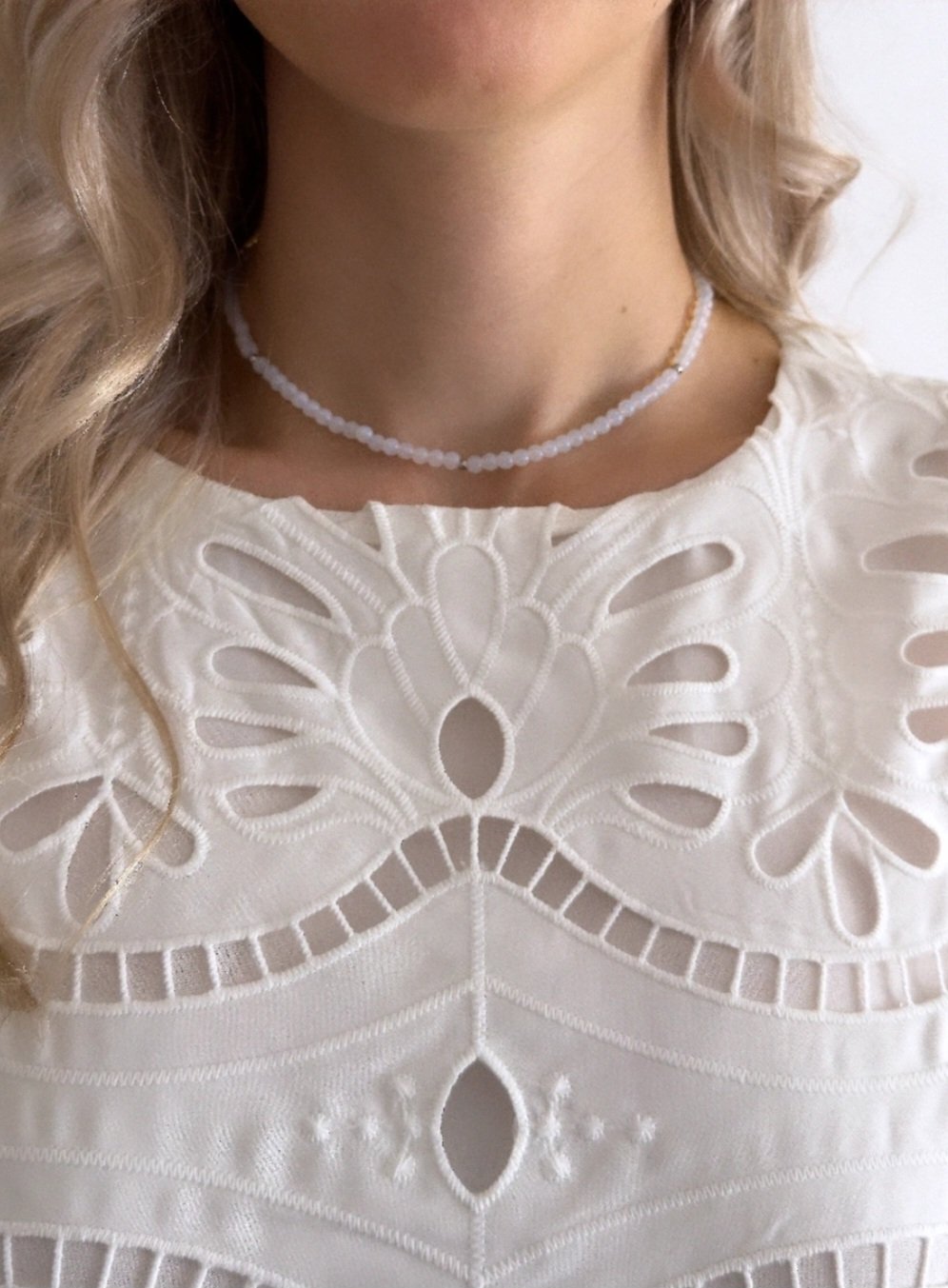 Elegantný ručne vyrábaný náhrdelník z opalitových korálok, ktoré nádherne odrážajú svetlo a vytvárajú jemný dúhový lesk.