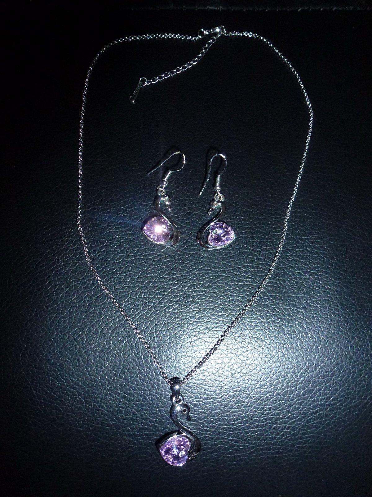Set skladajúci sa z náušníc a retiazky s príveskom. Krásna fialová farba, so Swarowski elementami. Jediná chybička, že z jednej náušnice vypadla kamienka, ale nie je to dosť vidieť. Dôvodom predaja je, že bohužiaľ už nemôžem nosiť šperky takéhoto typu, iba striebro alebo zlato :(.