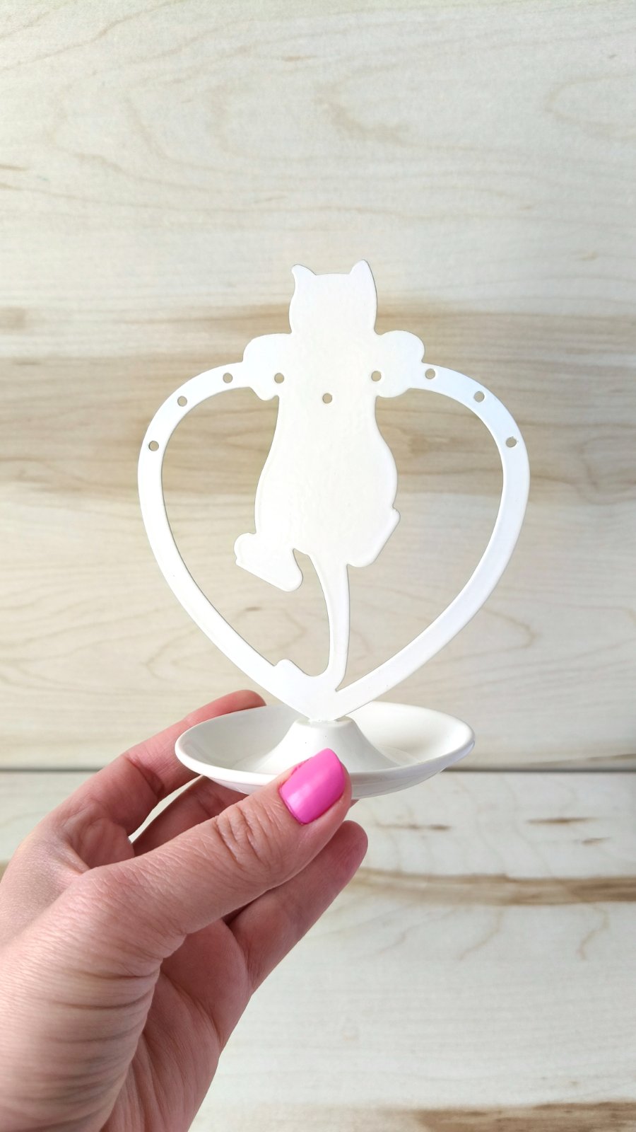 Biely kovový stojan/ vešiak v tvare mačky, na zavesenie visiacich náušníc(na háčiky). Spodná miska slúži na odkladanie drobnej bižutérie, prsteňov a malých náušníc napichovačiek.