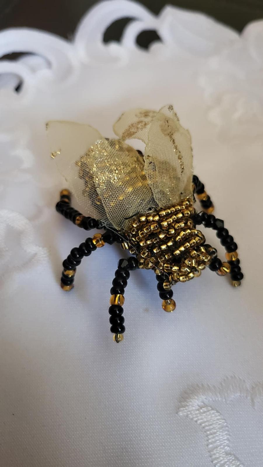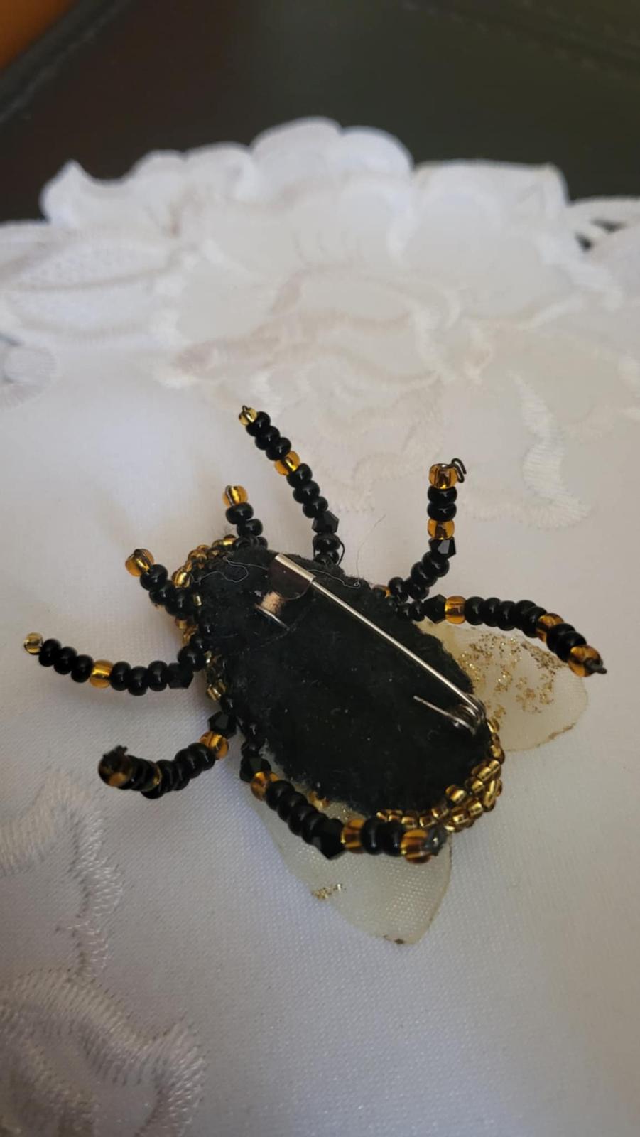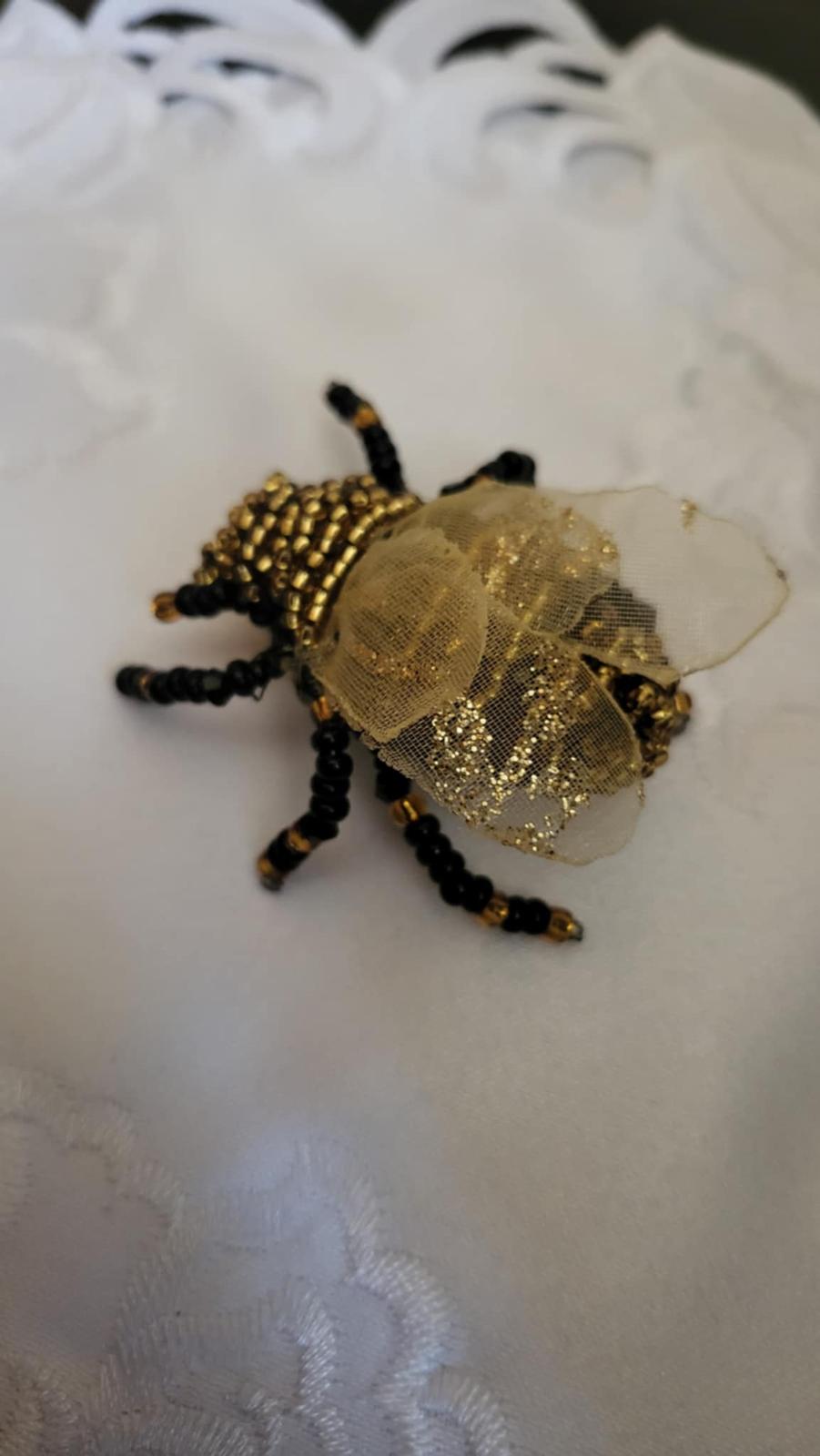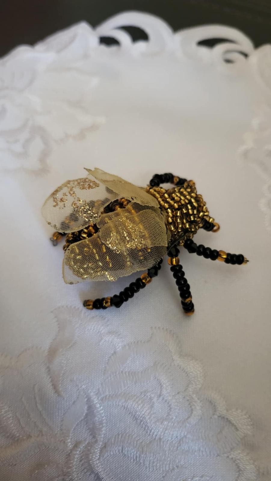 Brošňa ,,muchovčela,, je ručne šitá s použitím koralok Preciosa. Krídelká zo stuhy slabožletej farby s trblietkou. Muchovčela je čierno-žltej (zlatej) farby. Zadná strana je z filcu s brošňovym mostíkom na pripnutie k oblečeniu. Veľkosť - cca. dl.5 cm, š. 5 cm. Krásny módny doplnok. Posielam po prevode na účet, podací lístok na sledovanie zásielky. Poštovné a balné v cene.