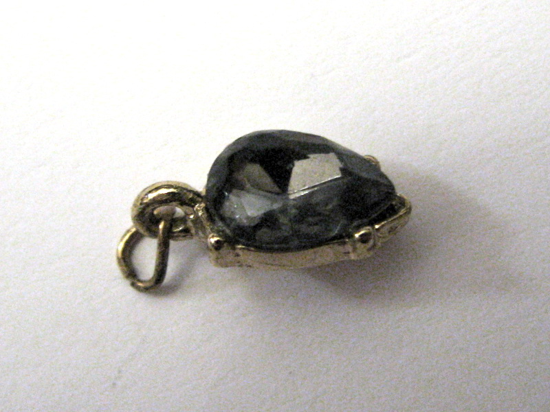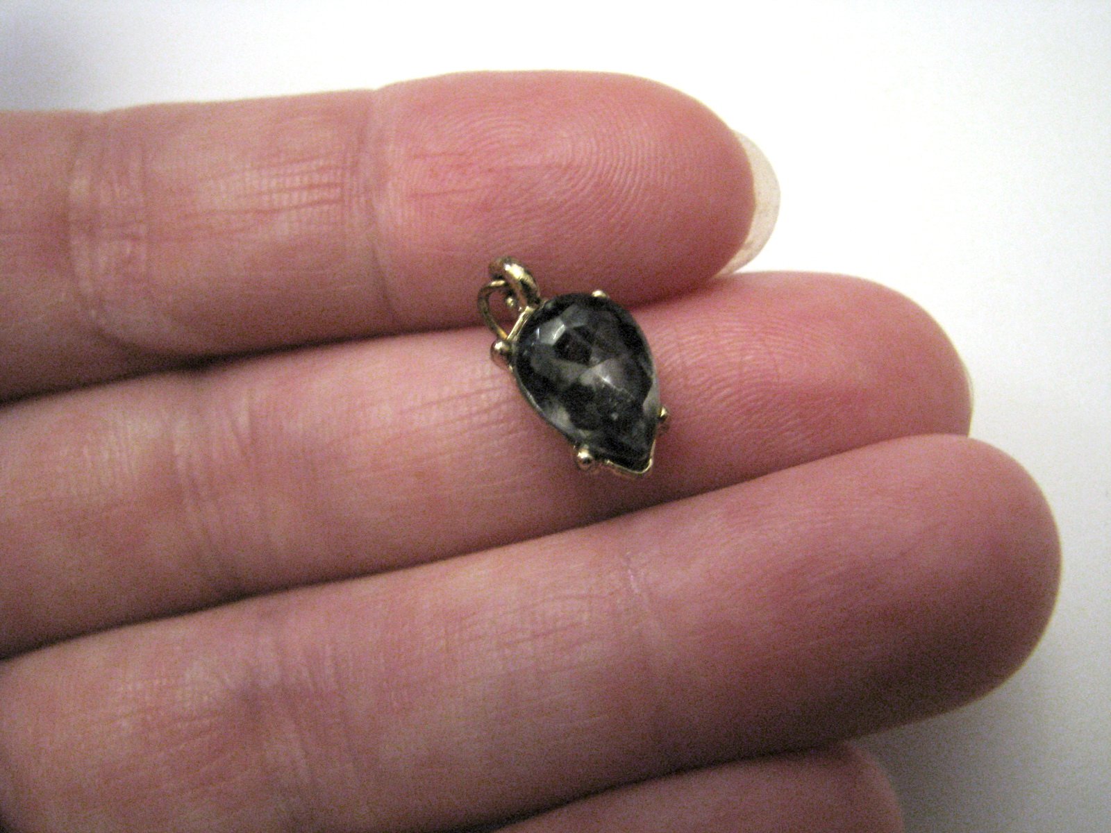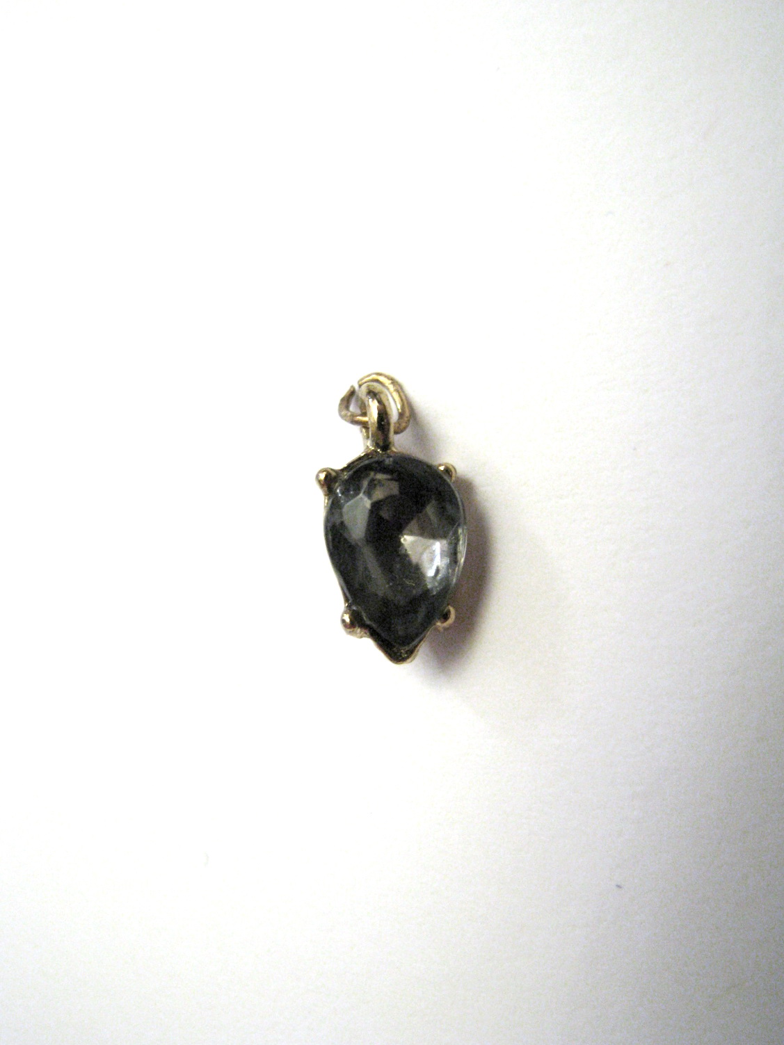 Maličký prívesok s brúseným skleneným kamienkom tmavošedej farby, v tvare obrátenej slzy, v lôžku zlatej farby. Bez poškodení.