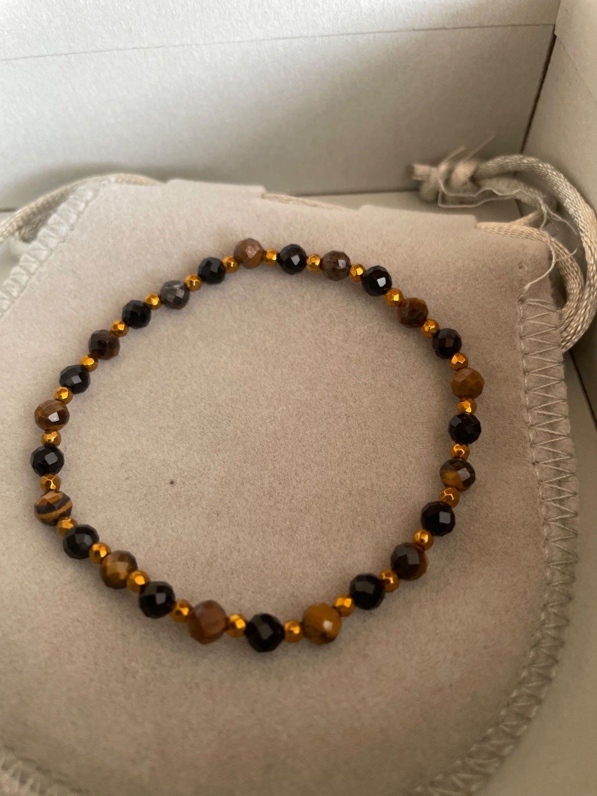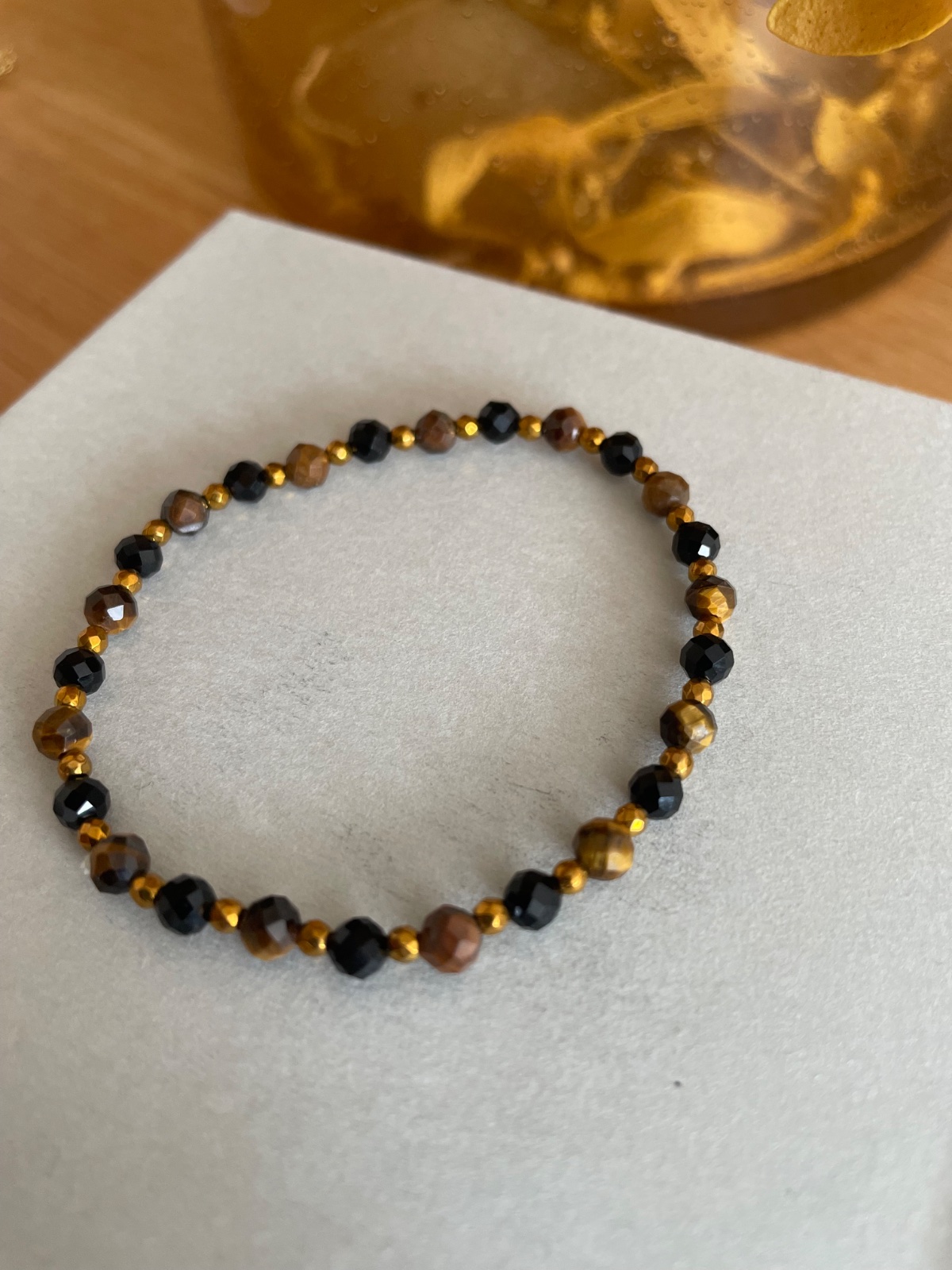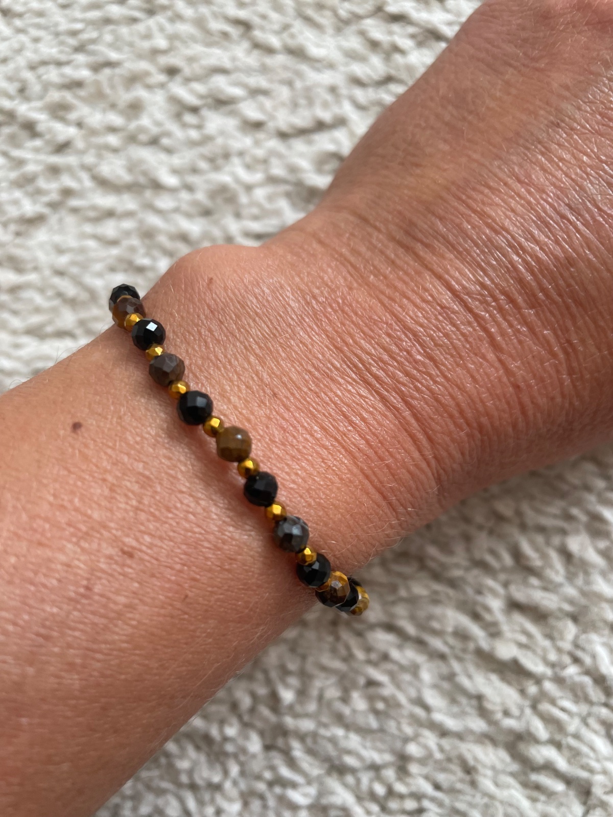 Náramky zo sklenených korálok českej výroby. Zapínanie na karabínku z bižutérneho kovu v zlatej alebo striebornej farbe. Návlek na niti SYNTON. Je nutný obvod zápästia. Veľa farieb skladom.