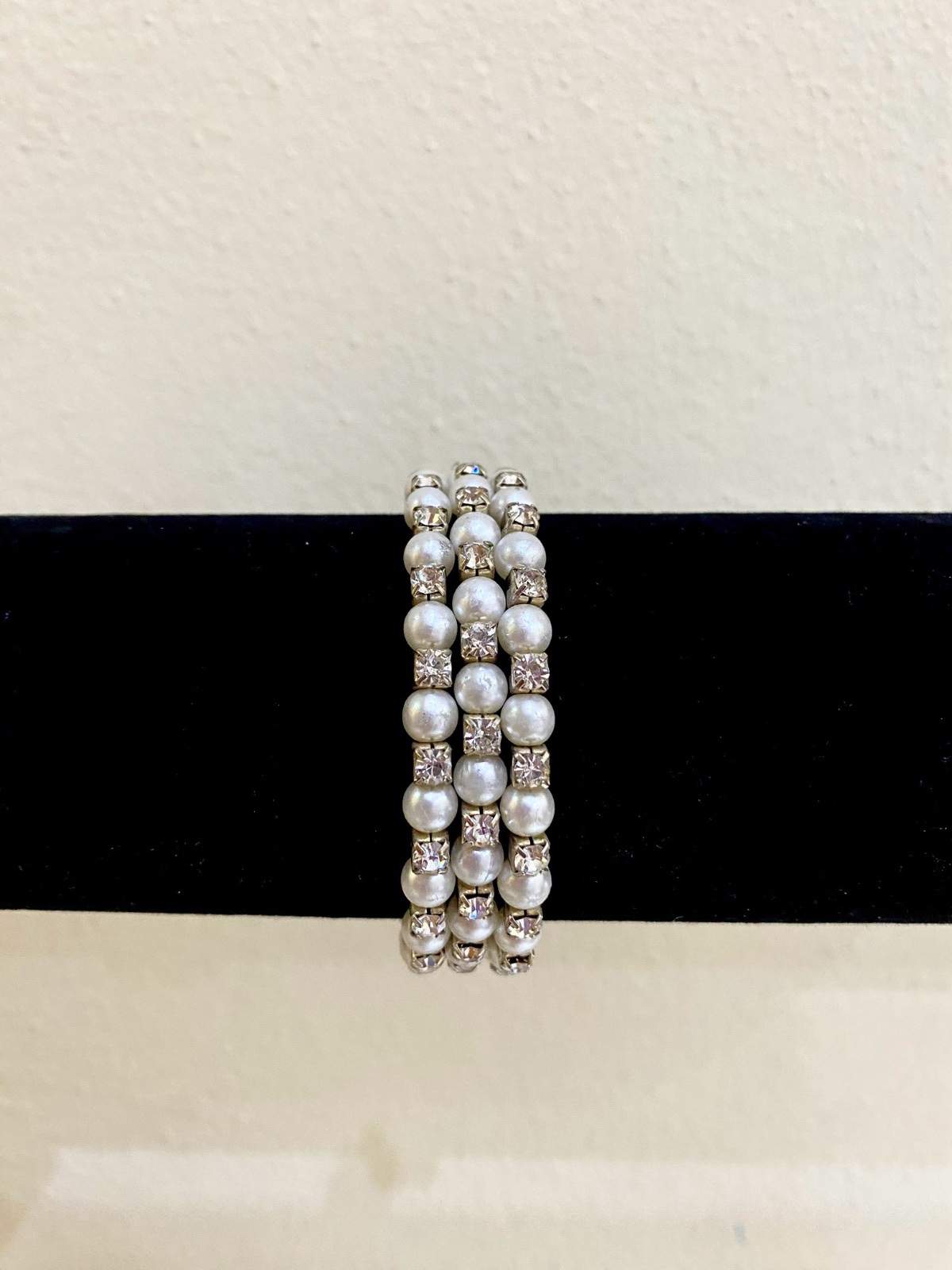 Dámsky elegantný náramok na ruku, ktorý sa skladá z troch obručí, je zdobený malými perličkami a striebornými kamienkami. Je vhodný na príležitostné udalosti.