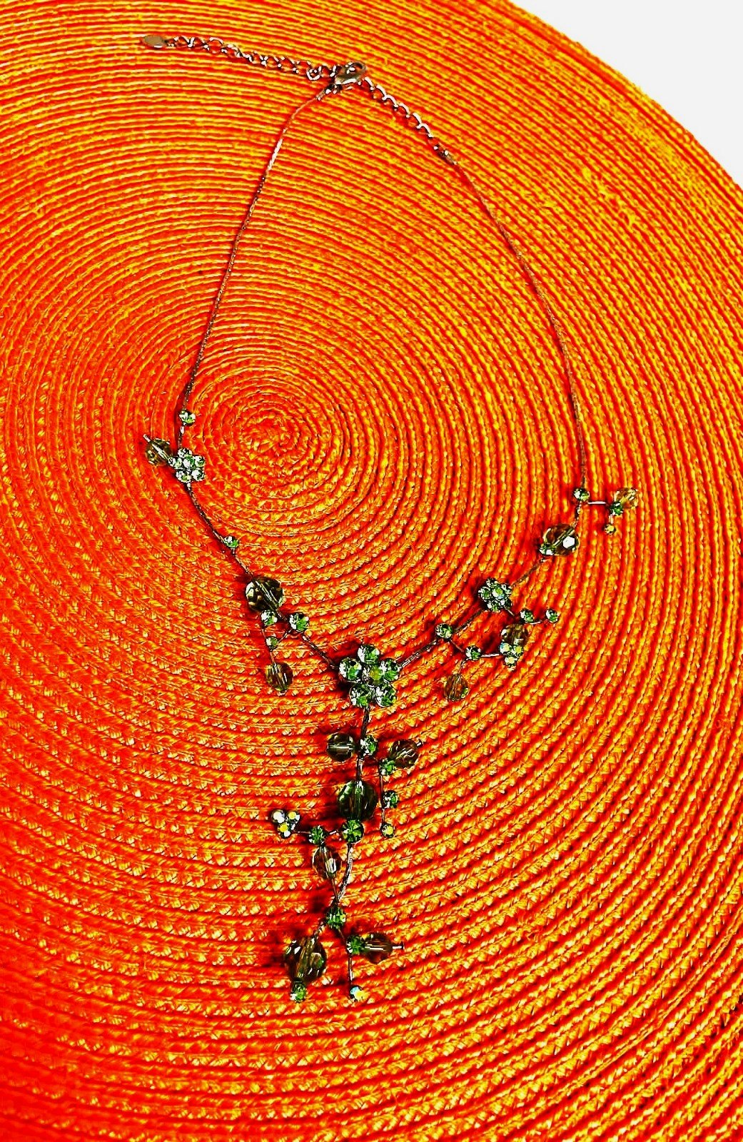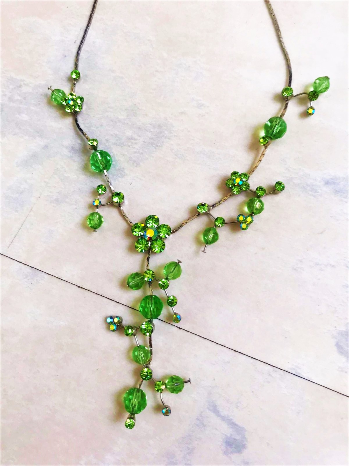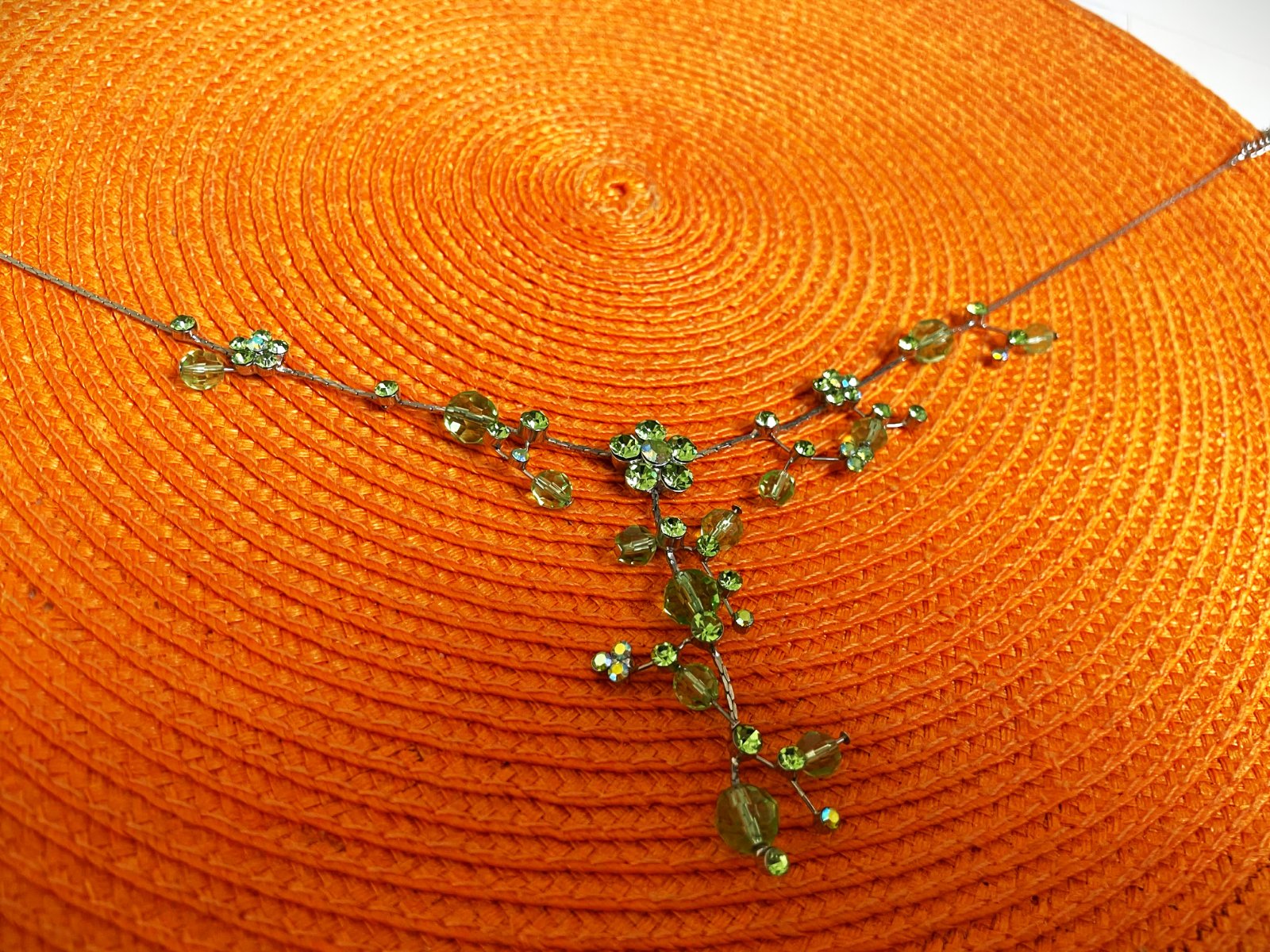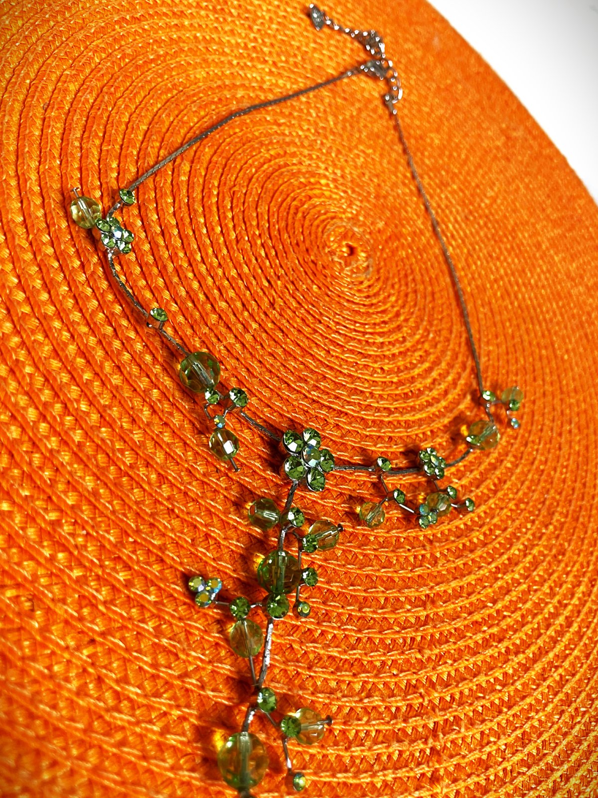 zaujímavý netuctový náhrdelník, zdobený zelenými očkami a korálkami, ktoré vytvárajú kvetinové a listové motívy,jeho farby sa na svetle pekne menia a očká nádherne hrajú rôznymi farbami,dlžka - obvod max. 50 cm - dá sa upraviť na kratší - viď foto,nie je to striebro,použitý na 1 svadbe,pozri aj náušnice :