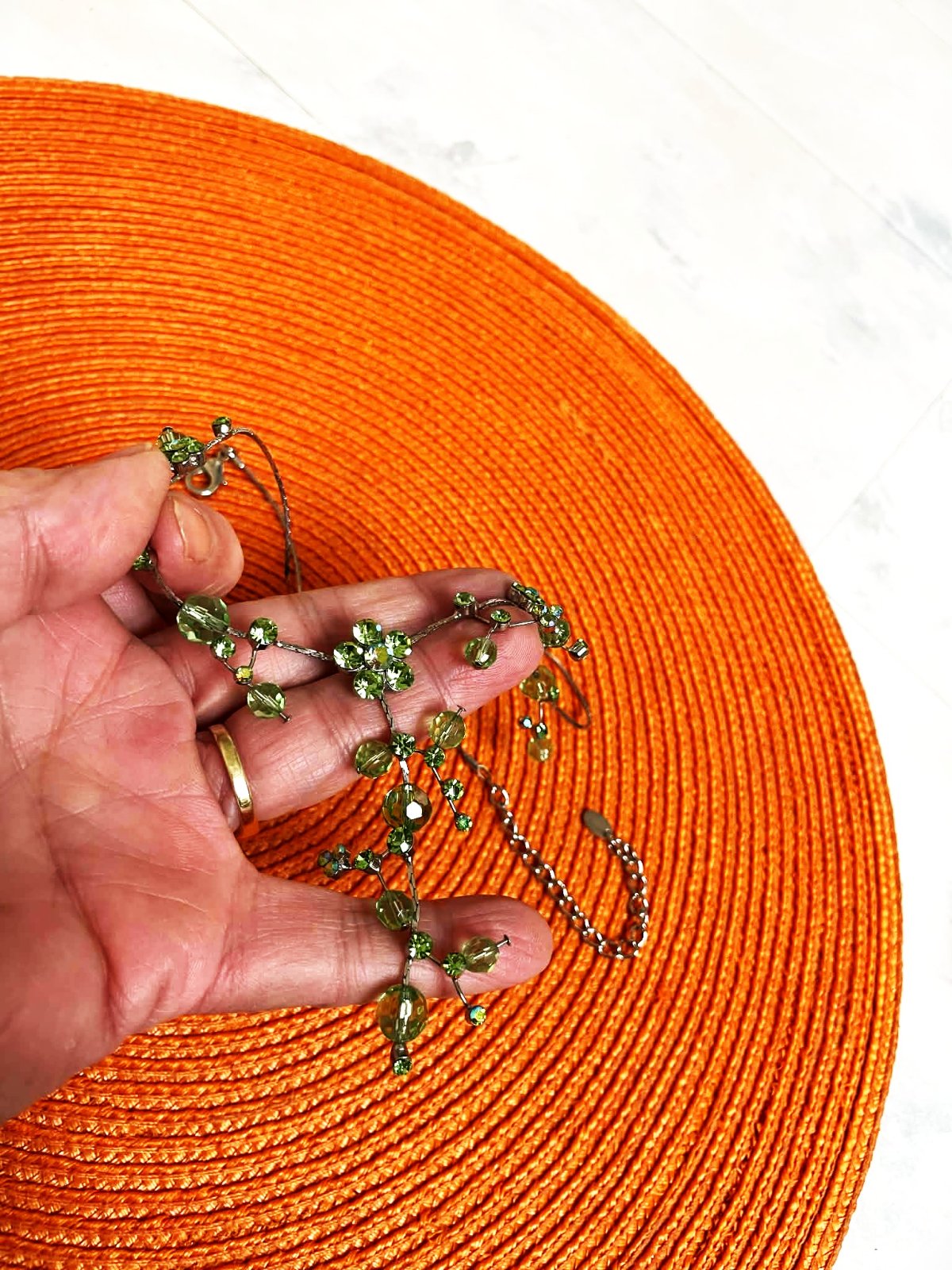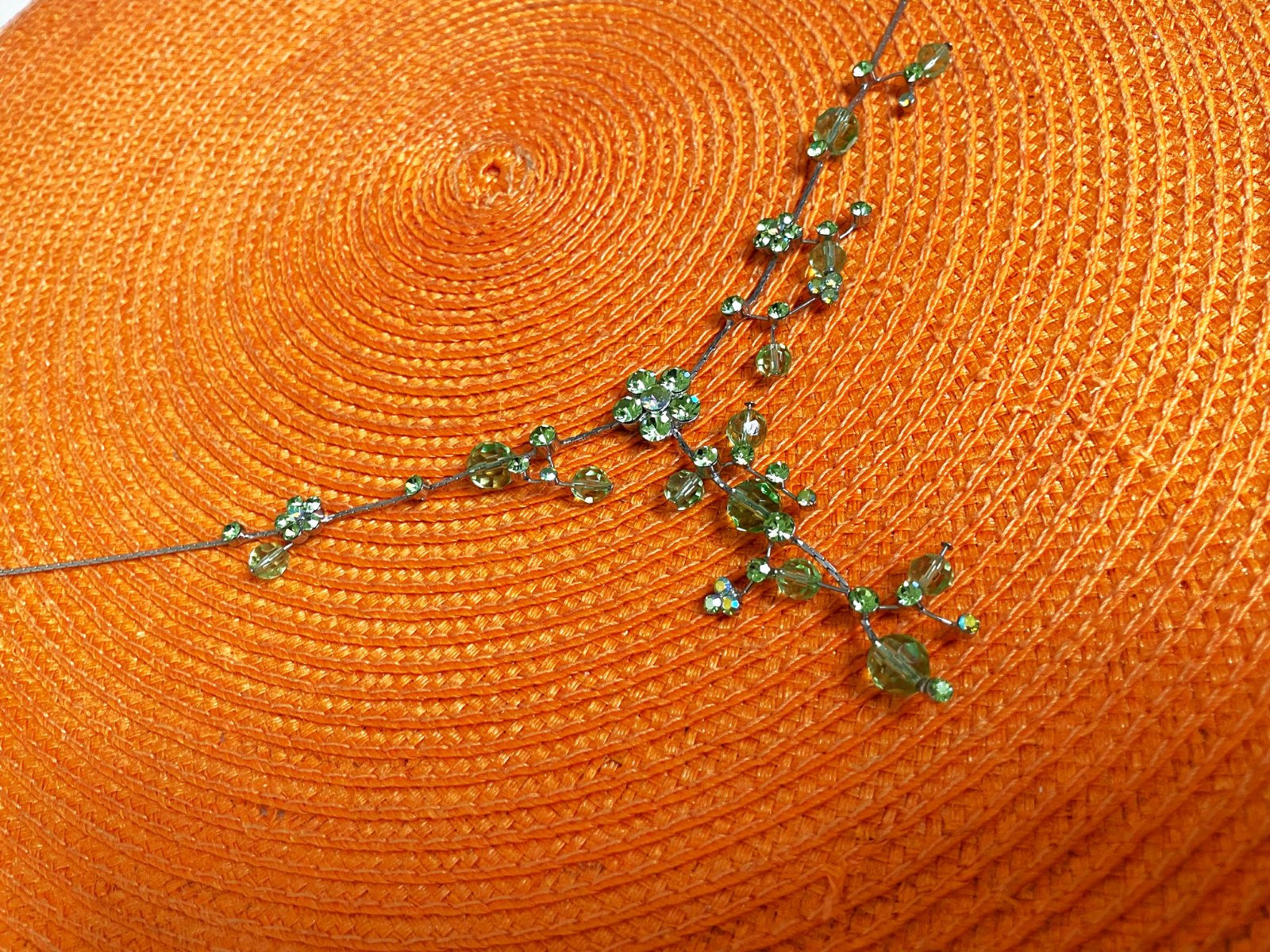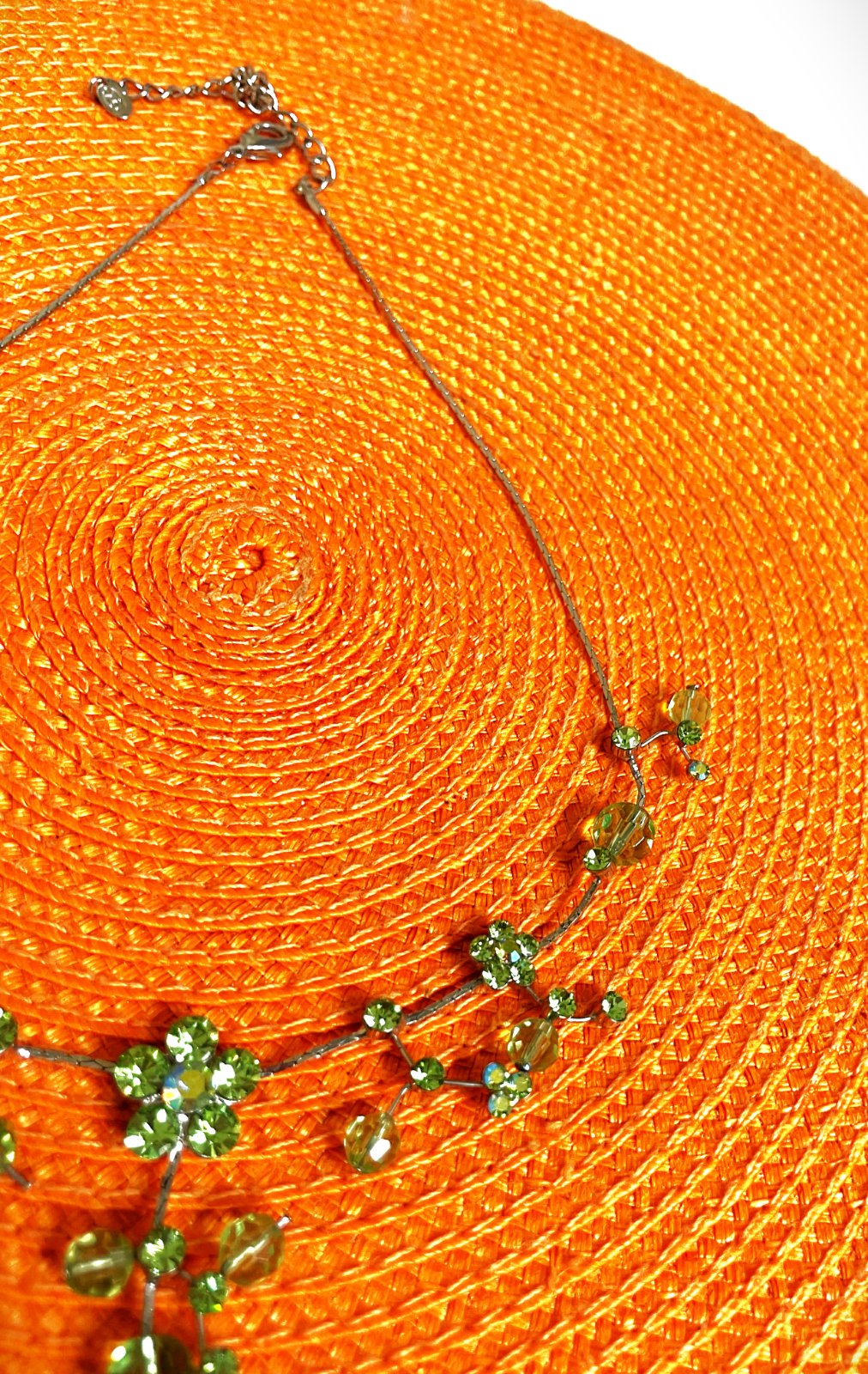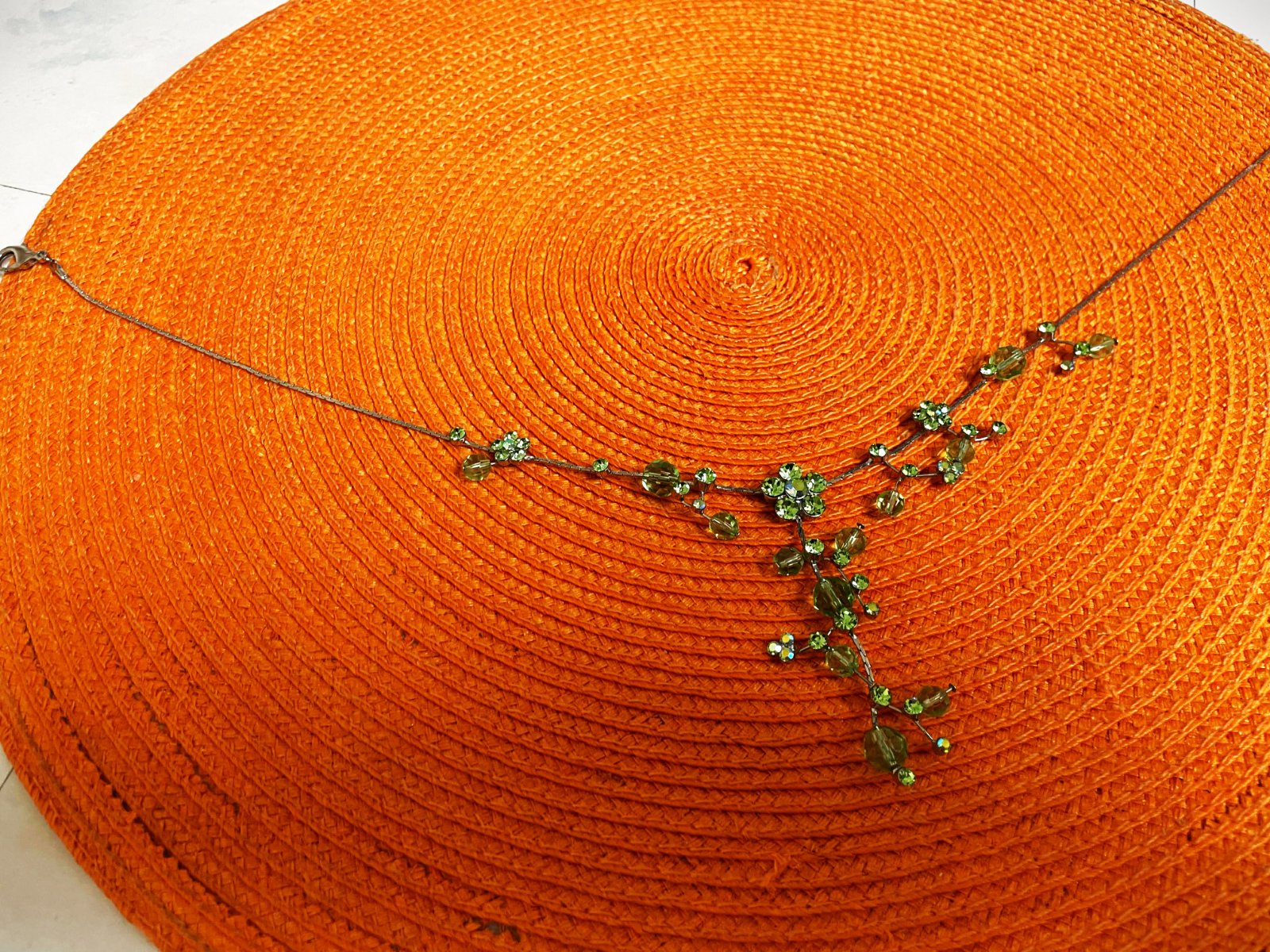 zaujímavý netuctový náhrdelník, zdobený zelenými očkami a korálkami, ktoré vytvárajú kvetinové a listové motívy,jeho farby sa na svetle pekne menia a očká nádherne hrajú rôznymi farbami,dlžka - obvod max. 50 cm - dá sa upraviť na kratší - viď foto,nie je to striebro,použitý na 1 svadbe,pozri aj náušnice :