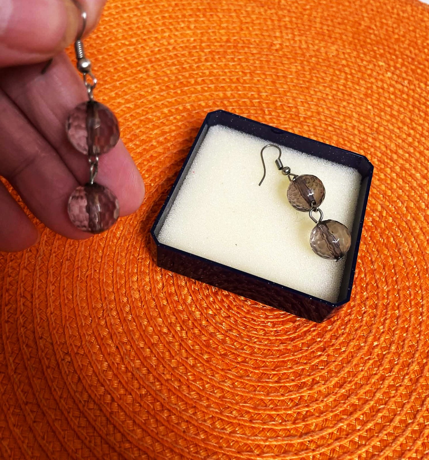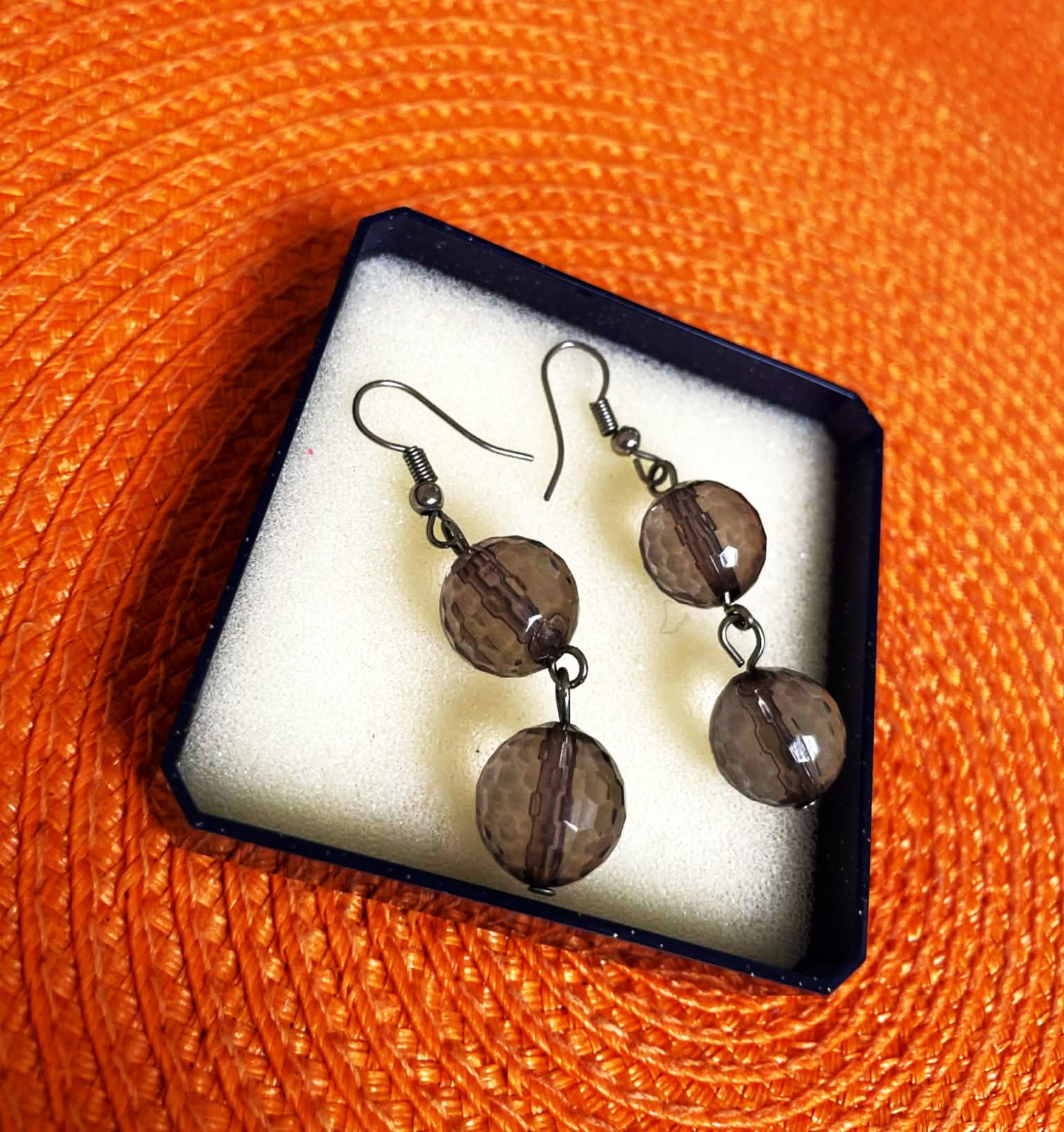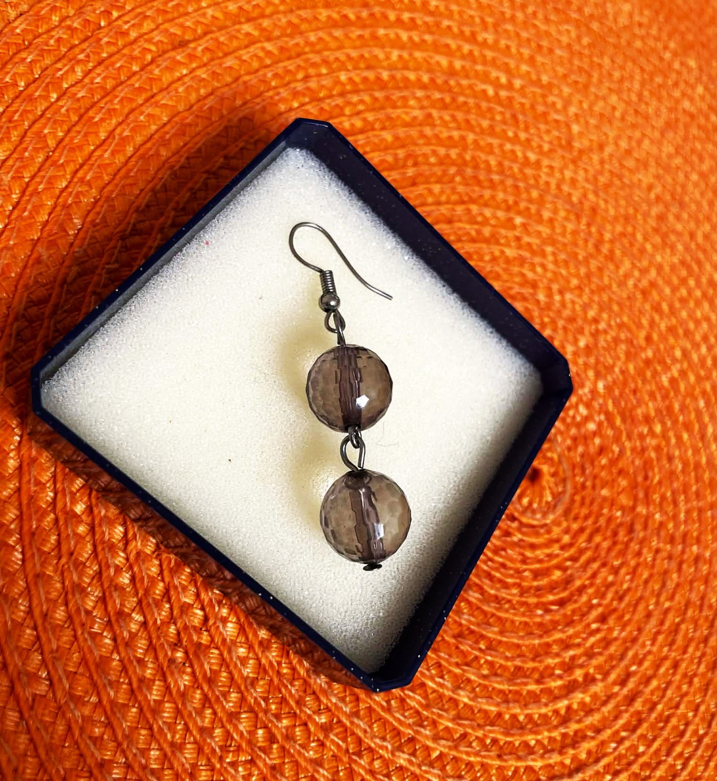 visiace dymové náušnice s dvoma guličkam,vyrobené z fazetovaného dymového kremeňa, známeho aj ako záhneda, brúsený povrch pekne láme svetlo a vytvára odlesk, dlžka visiacej časti okrem háčika = 3 cm