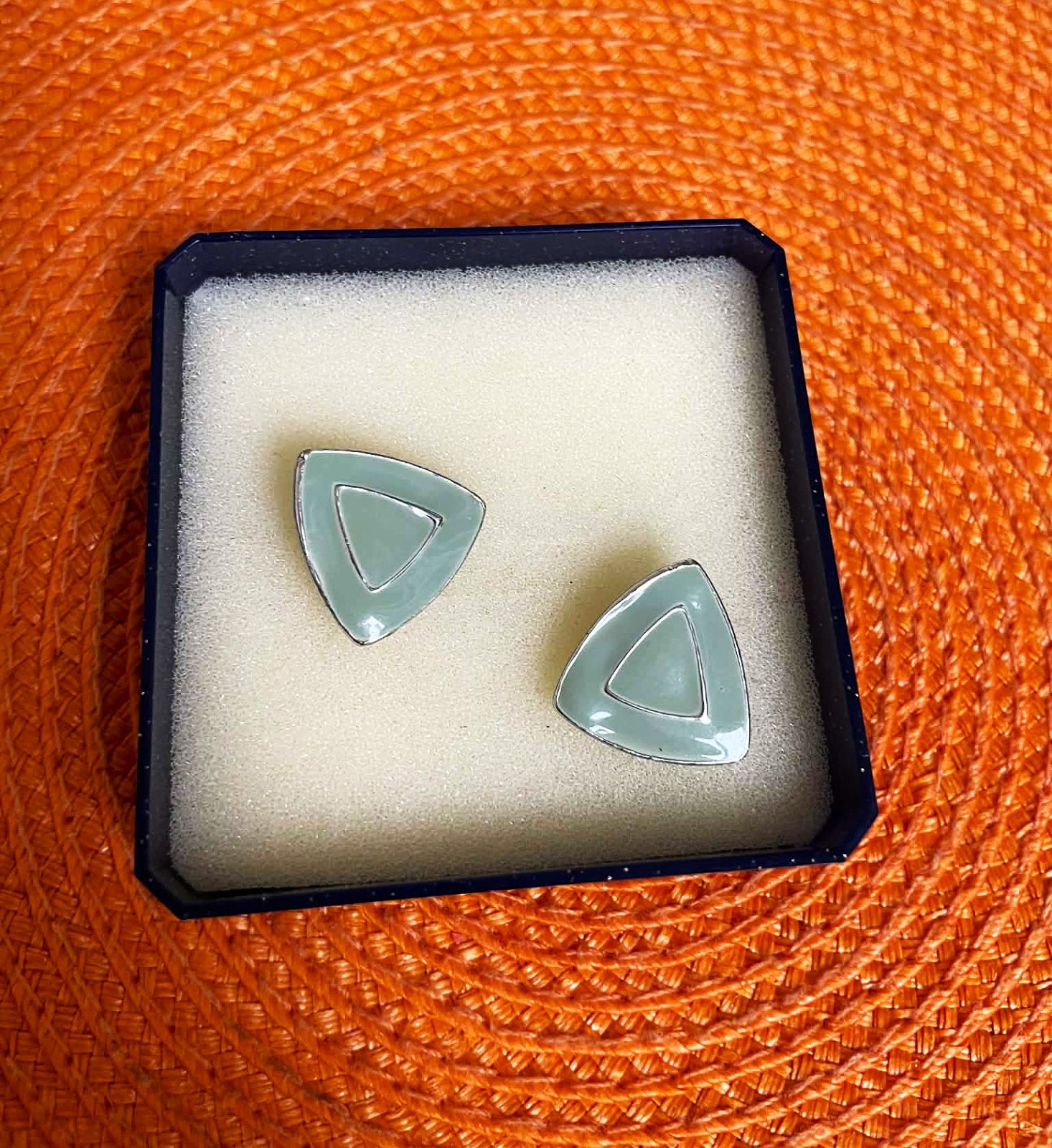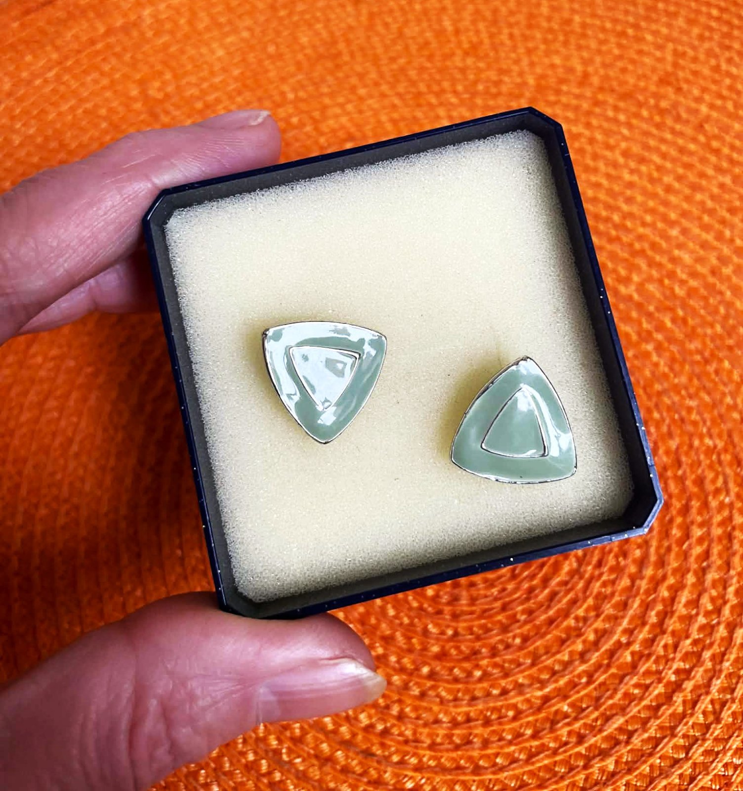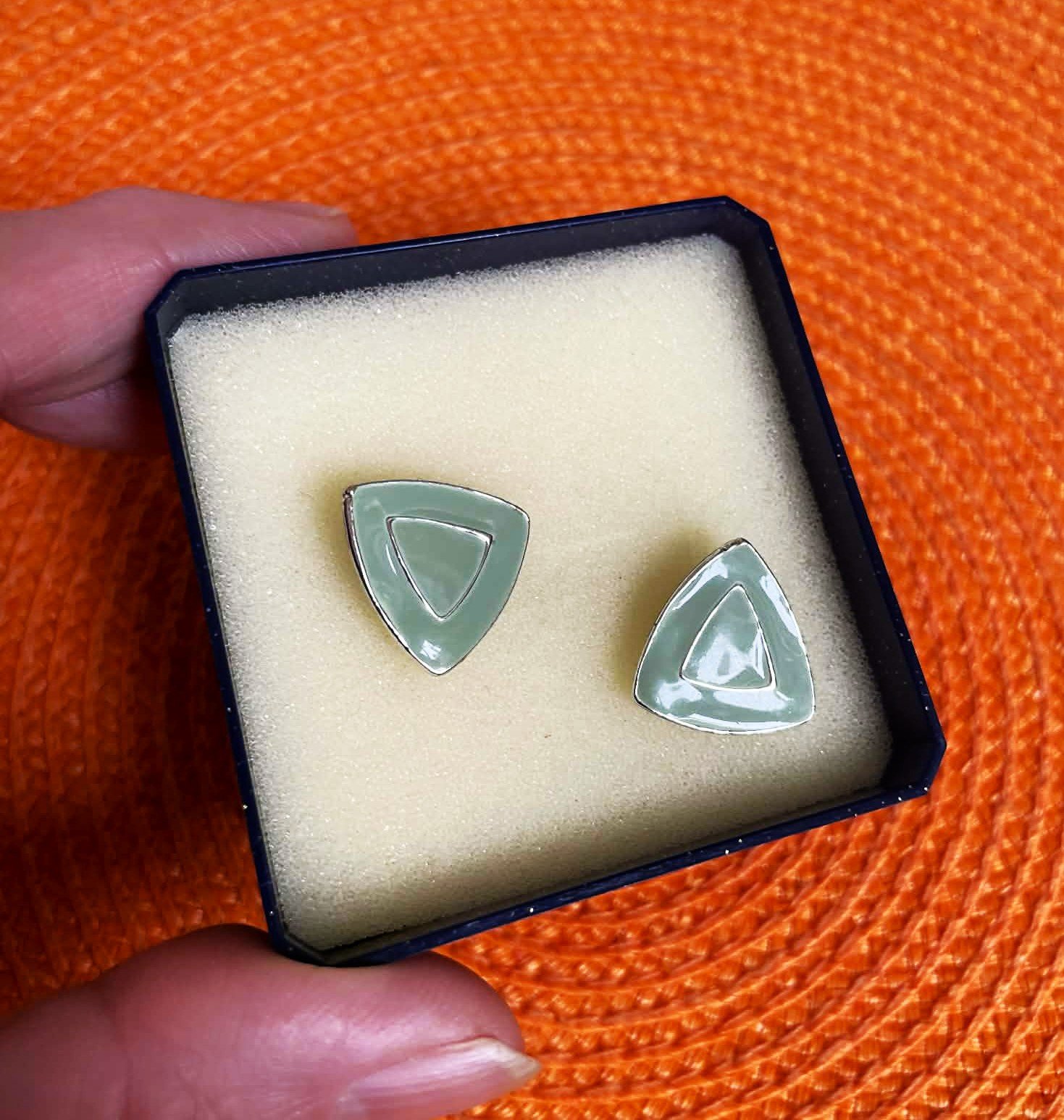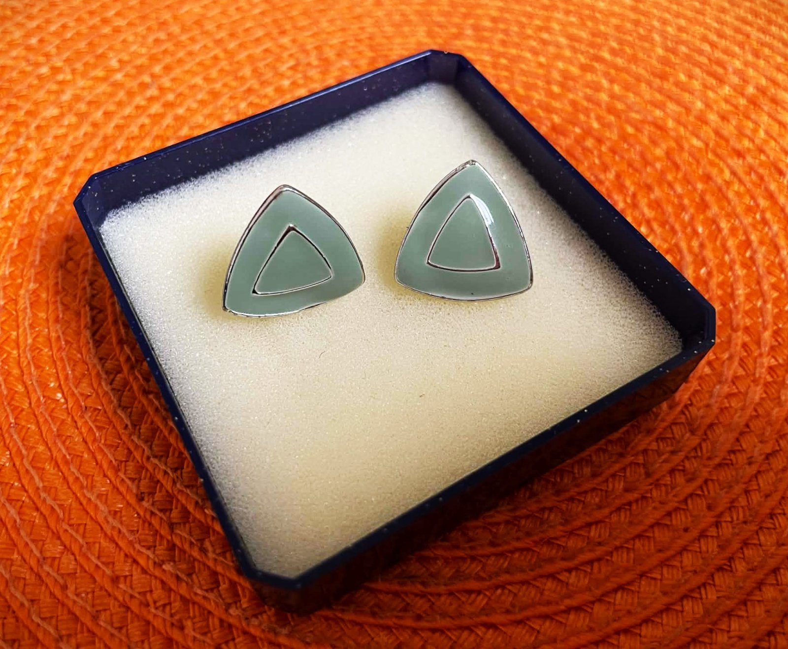 napichovacie trojuholníkové náušnice v tvare trojuholníka, sú z kovu s povrchovou úpravou z mätového (mint) alebo svetlozeleného smaltu.