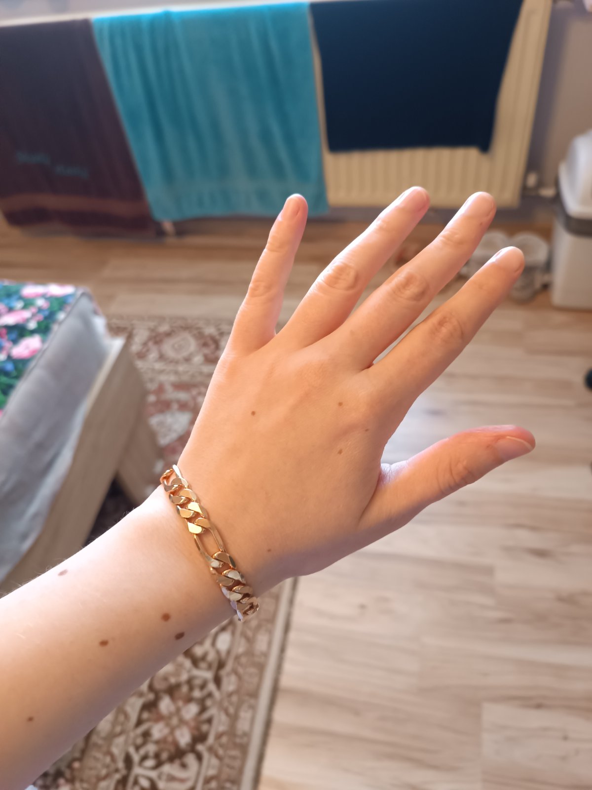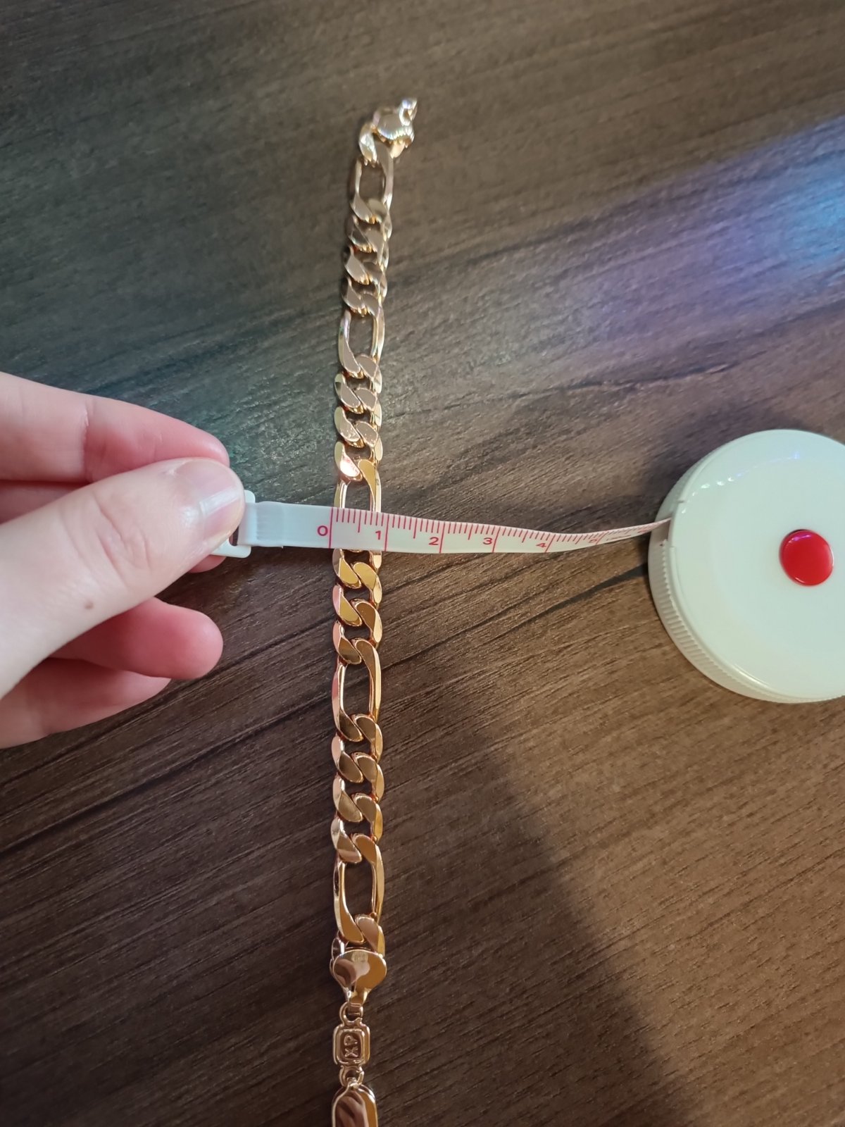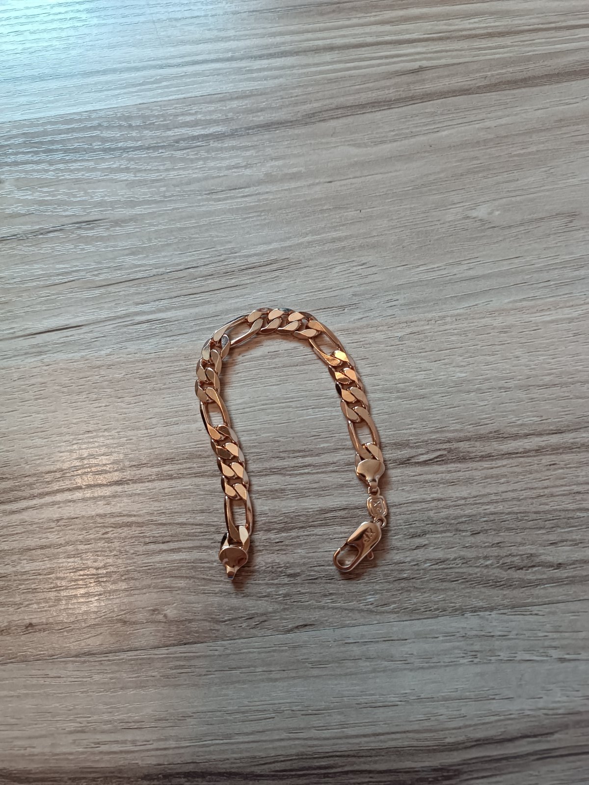 Náramok, chirurgická oceľ, celková dĺžka cca 20 cm, šírka cca 1 cm.