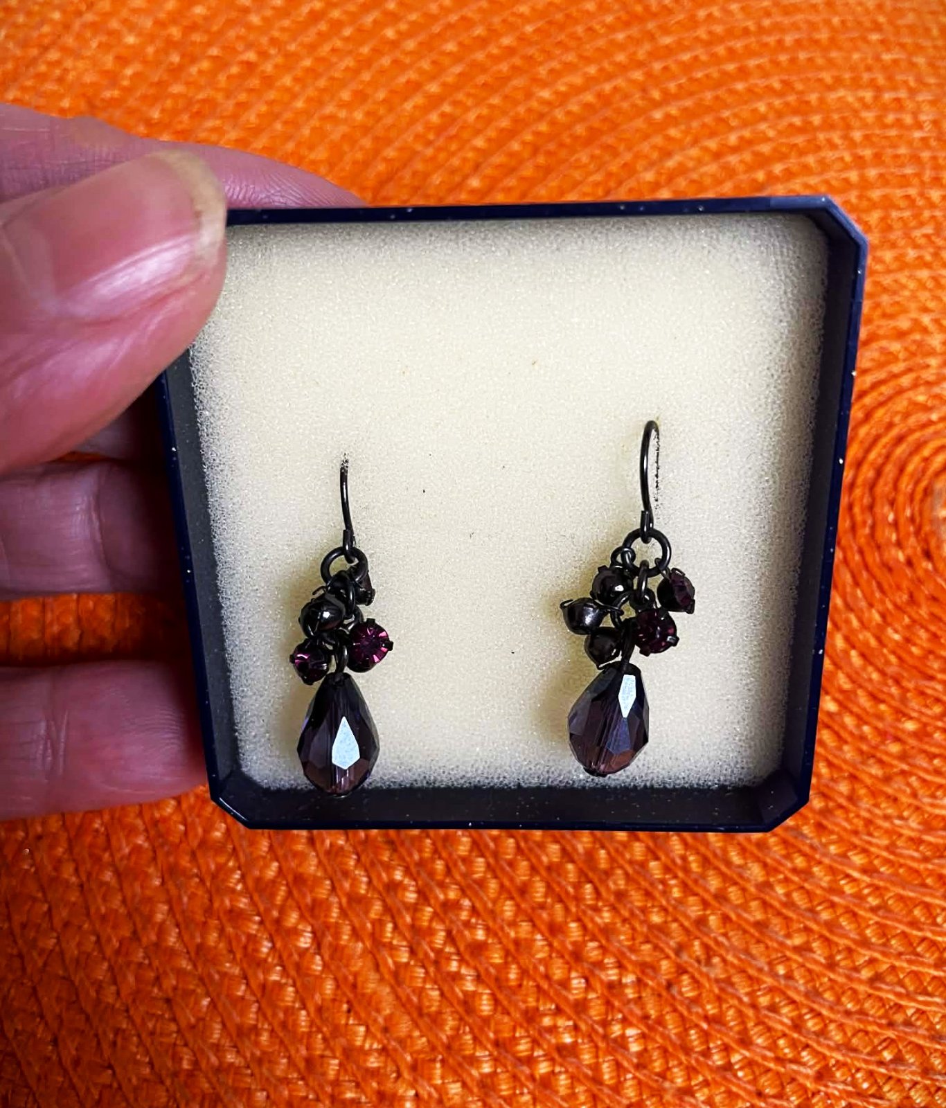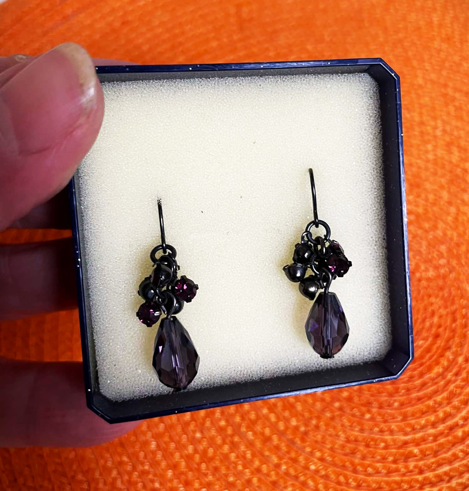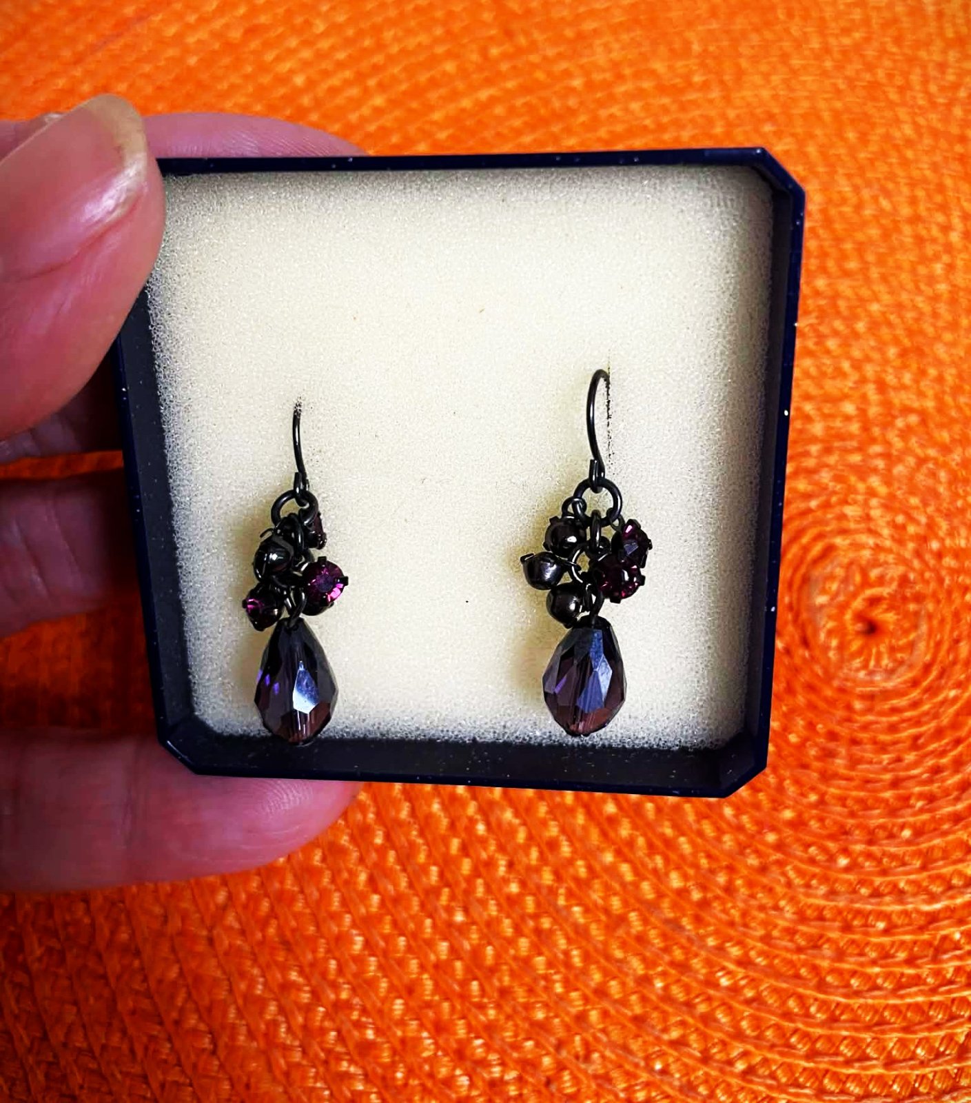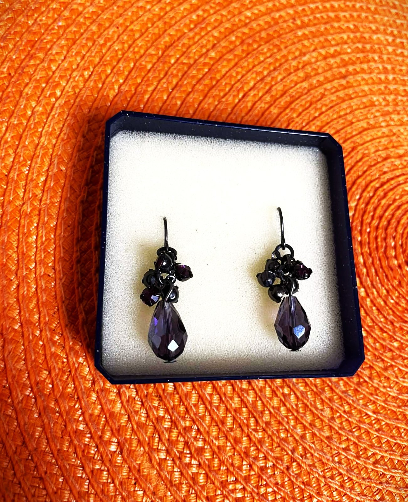 nádherné luxusné náušnice v priehľadnej chladnej fialovej farbe z brúsených sklenených korálok, veľmi elegantné, vhodné na spoločenské udalosti a plesy, obsahujú fialové kryštály a korálky v čírej ametystovej farbe, majú kvapkovitý tvar hlavného kryštálu a zhluk menších drobných kraštálových korálok nad ním,dlžka = 2,5 cm