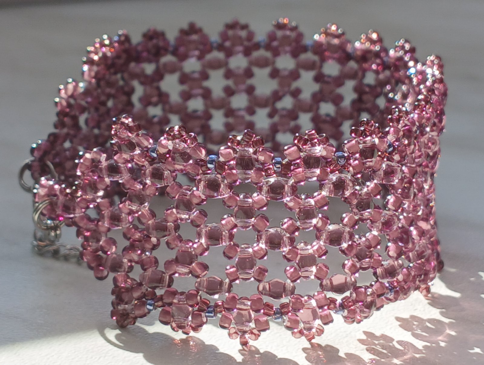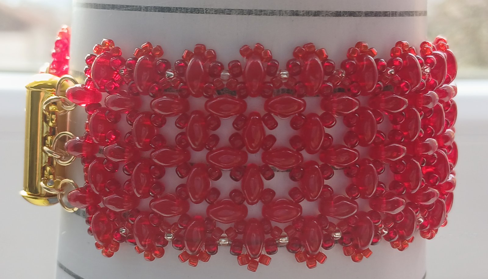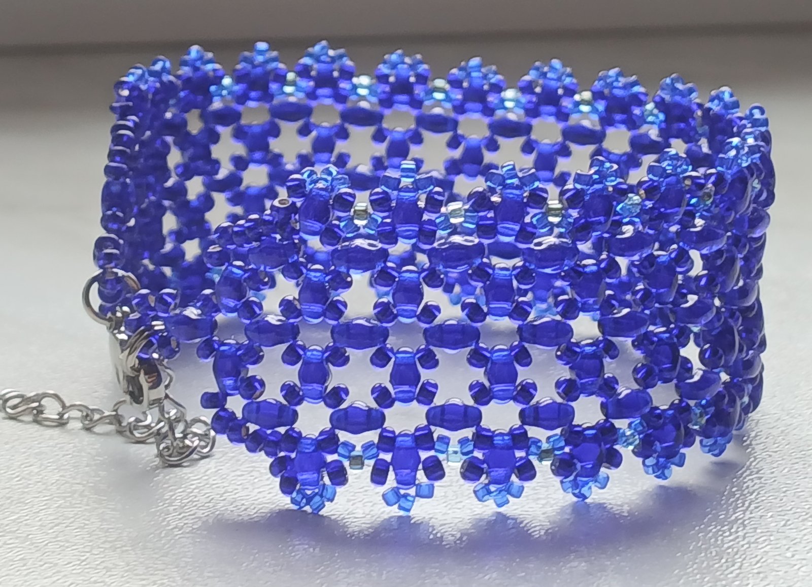 Šijem náramky zo sklenených koralok českej výroby. Tieto sú z dvojdierkových tzv. SUPERDUO korálok, šírka 3 cm. Zapínanie je z chirurgickej ocele v striebornej alebo zlatej farbe. Môže byť trojradové (15 eur) alebo zatláčacie (14 eur).