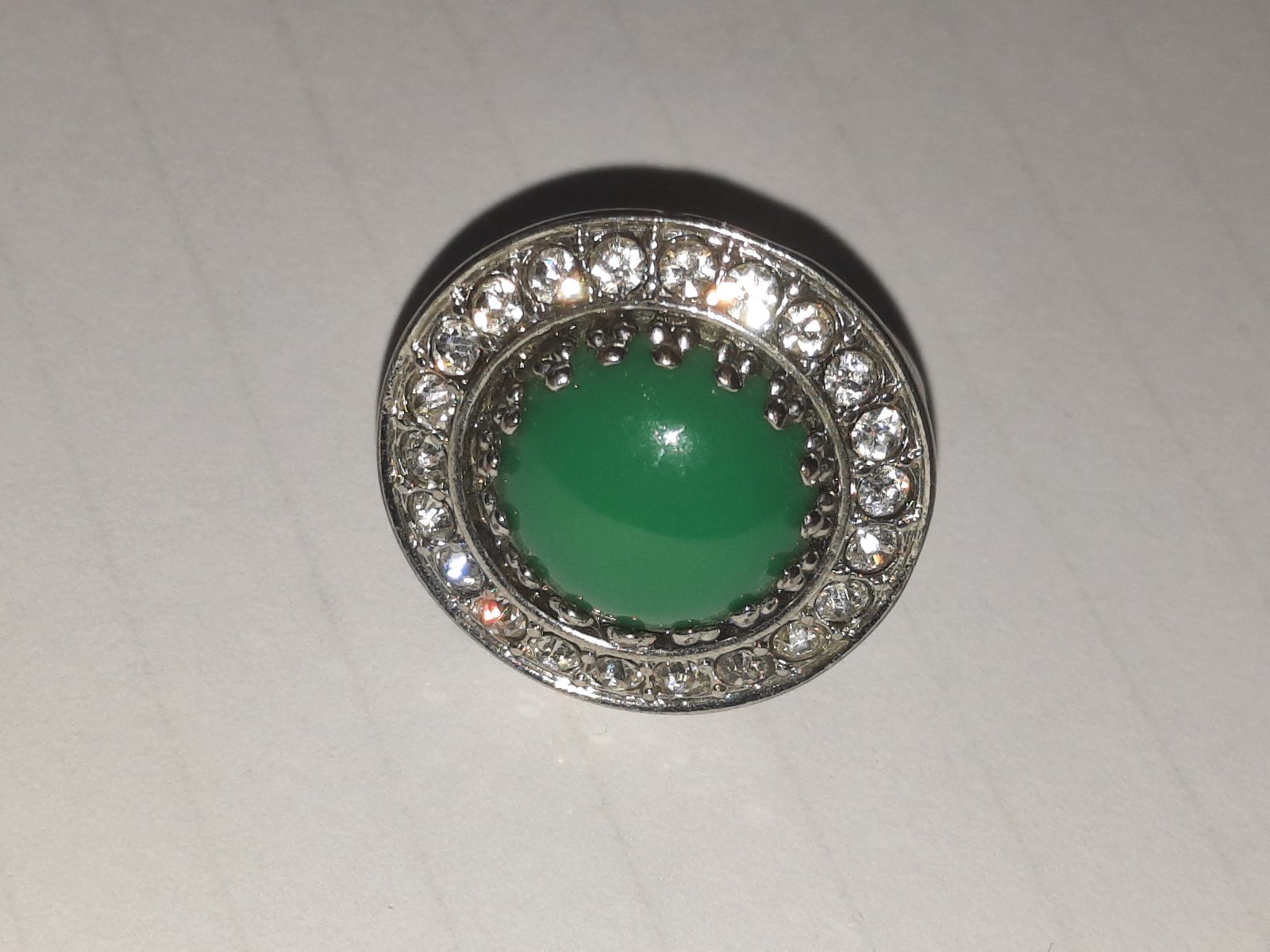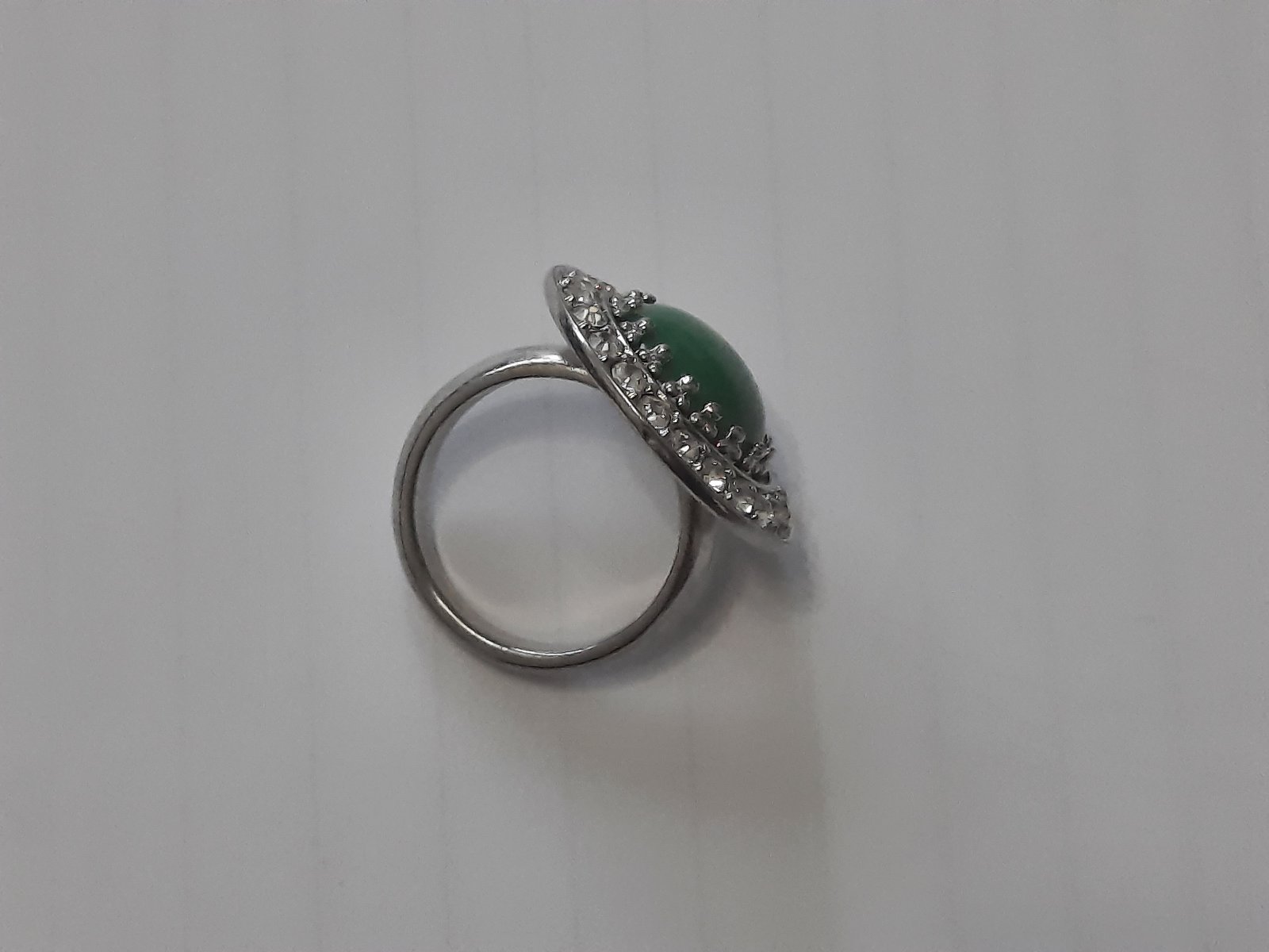 3. Prsteň striebornej farby so zeleným stredom a imitáciou diamantov okolo, veľkosť S, 5€