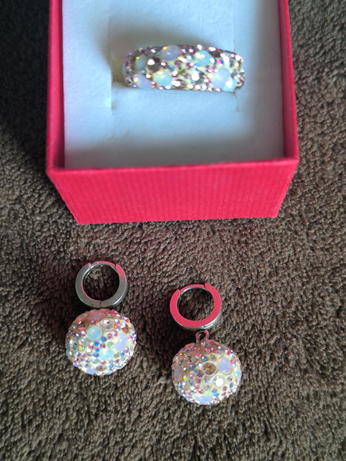 Nádherná sada, kvalitná Česká výroba. Opuncované striebro, Swarovski kryštál. Na náušnici vypadnutý jeden malinký kamienok, nie je vôbec vidieť pri nosení. Vhodné aj ako darček. Priemer prsteňa je 1,6cm
