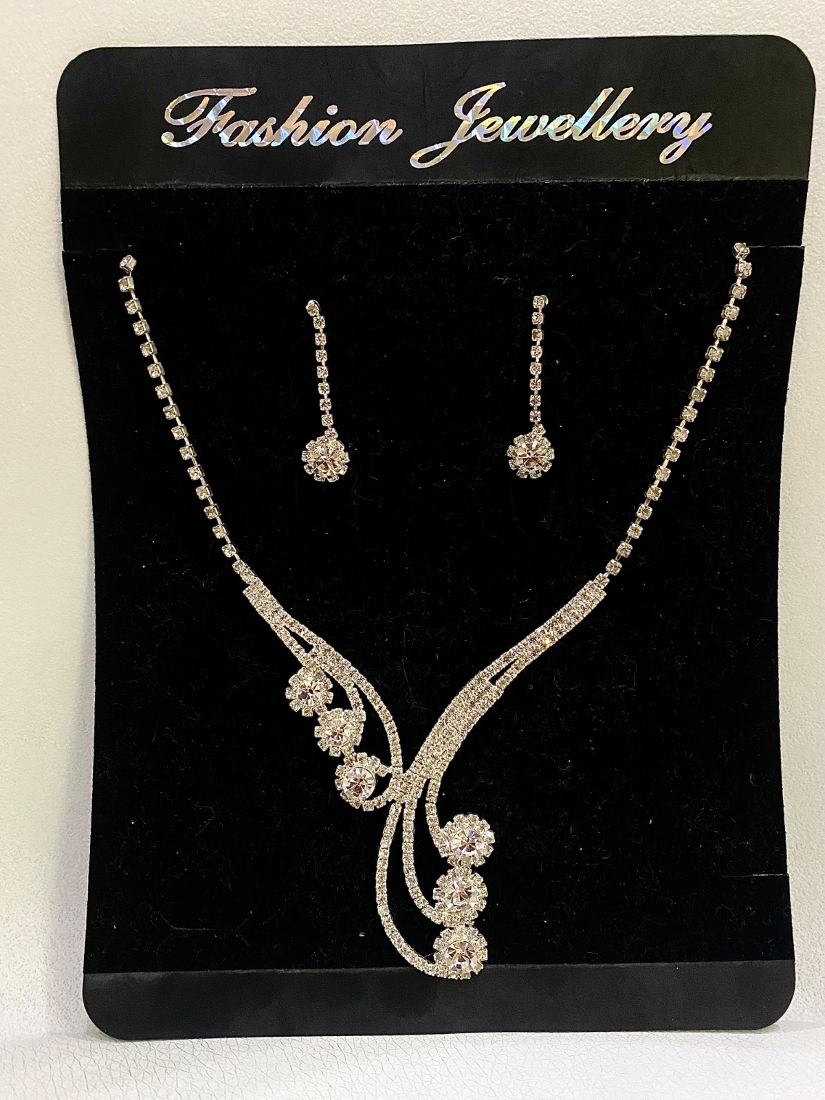 Elegantná sada módnej bižutérie na čiernom podklade s nápisom „Fashion Jewellery“.