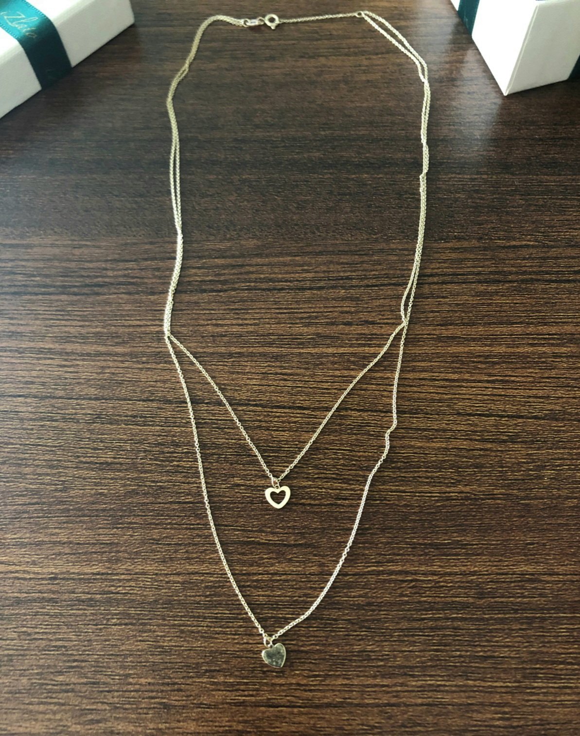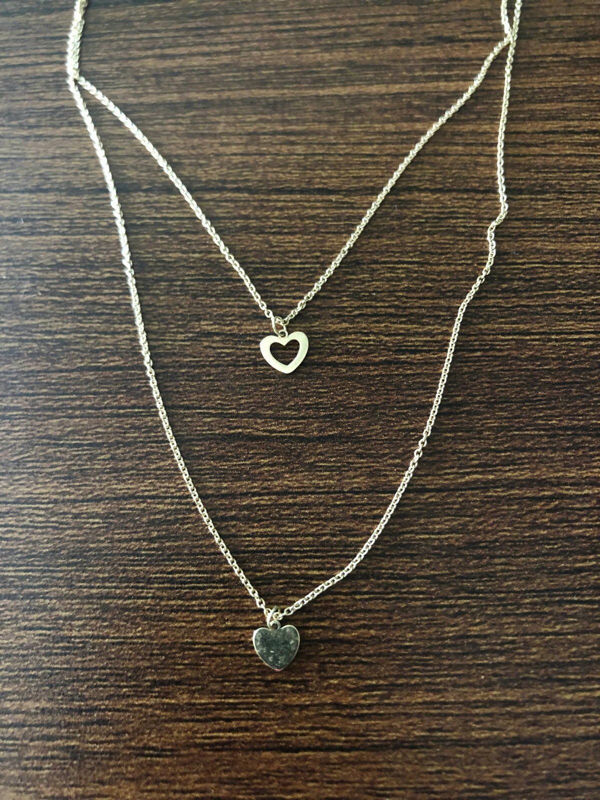 Zlaty náhrdelník, ktorý tvoria dve rôzne dlhé línie tenkých retiazok, spojené v jeden