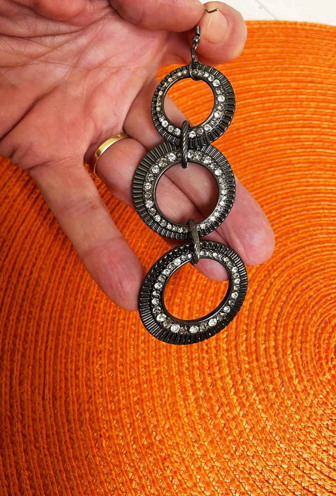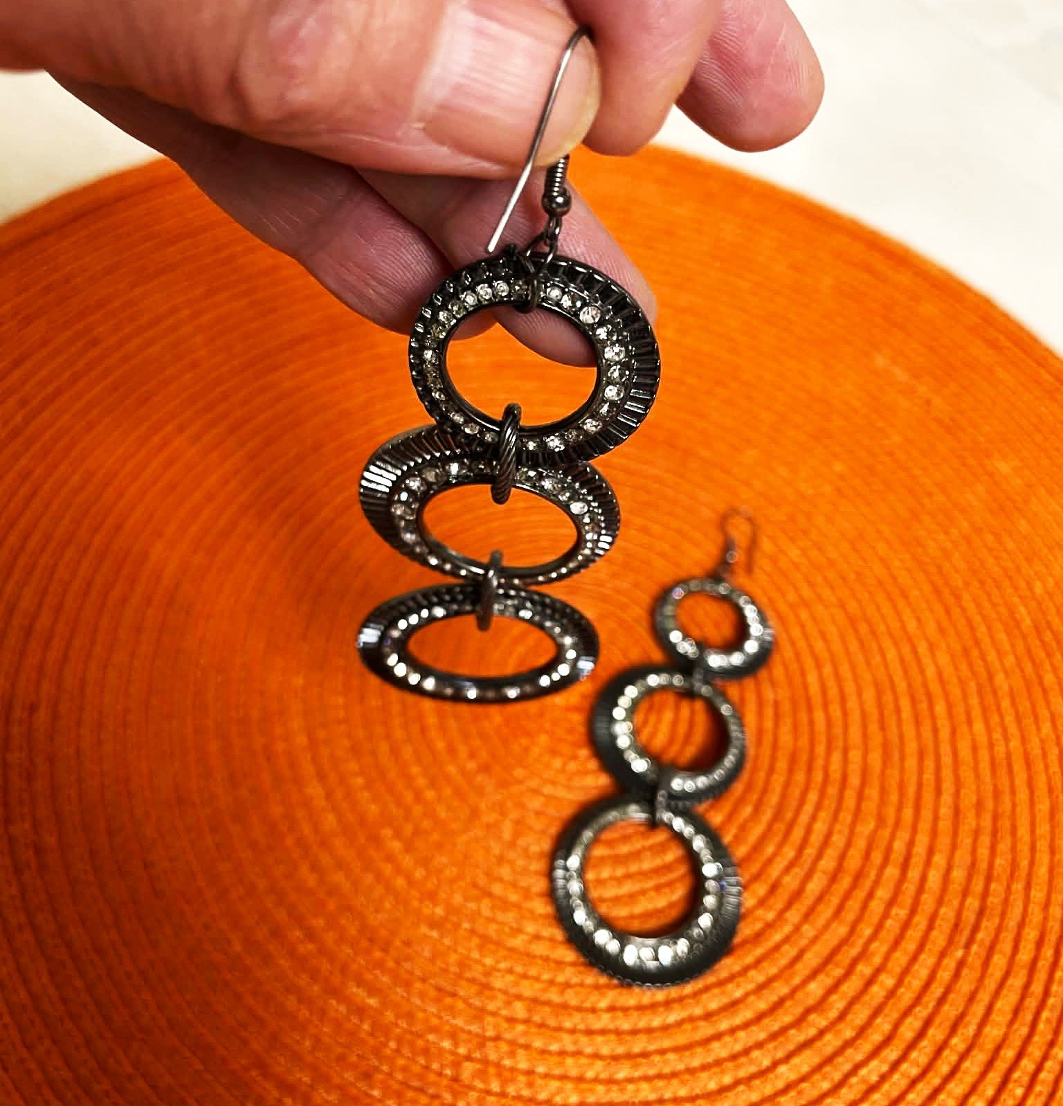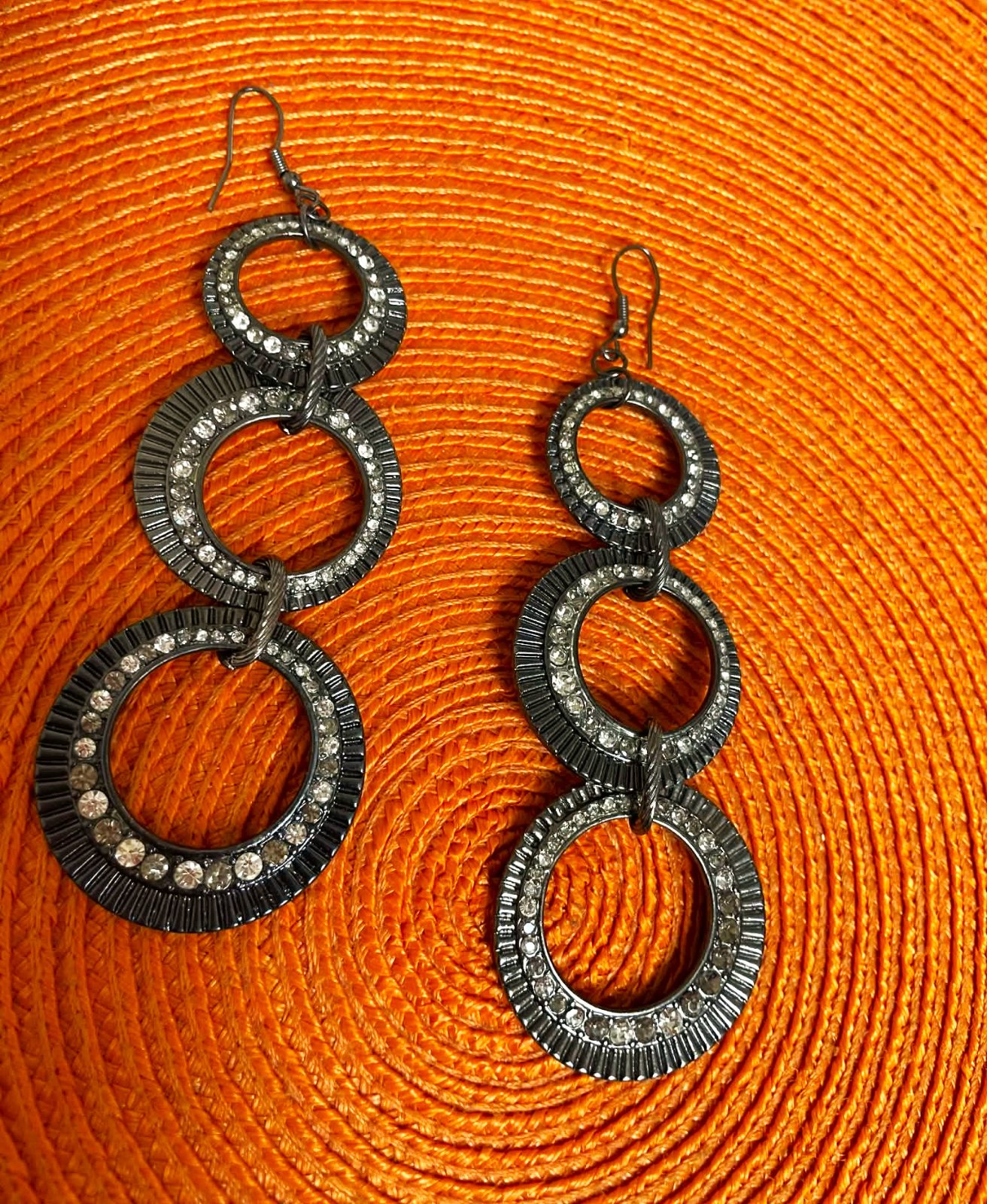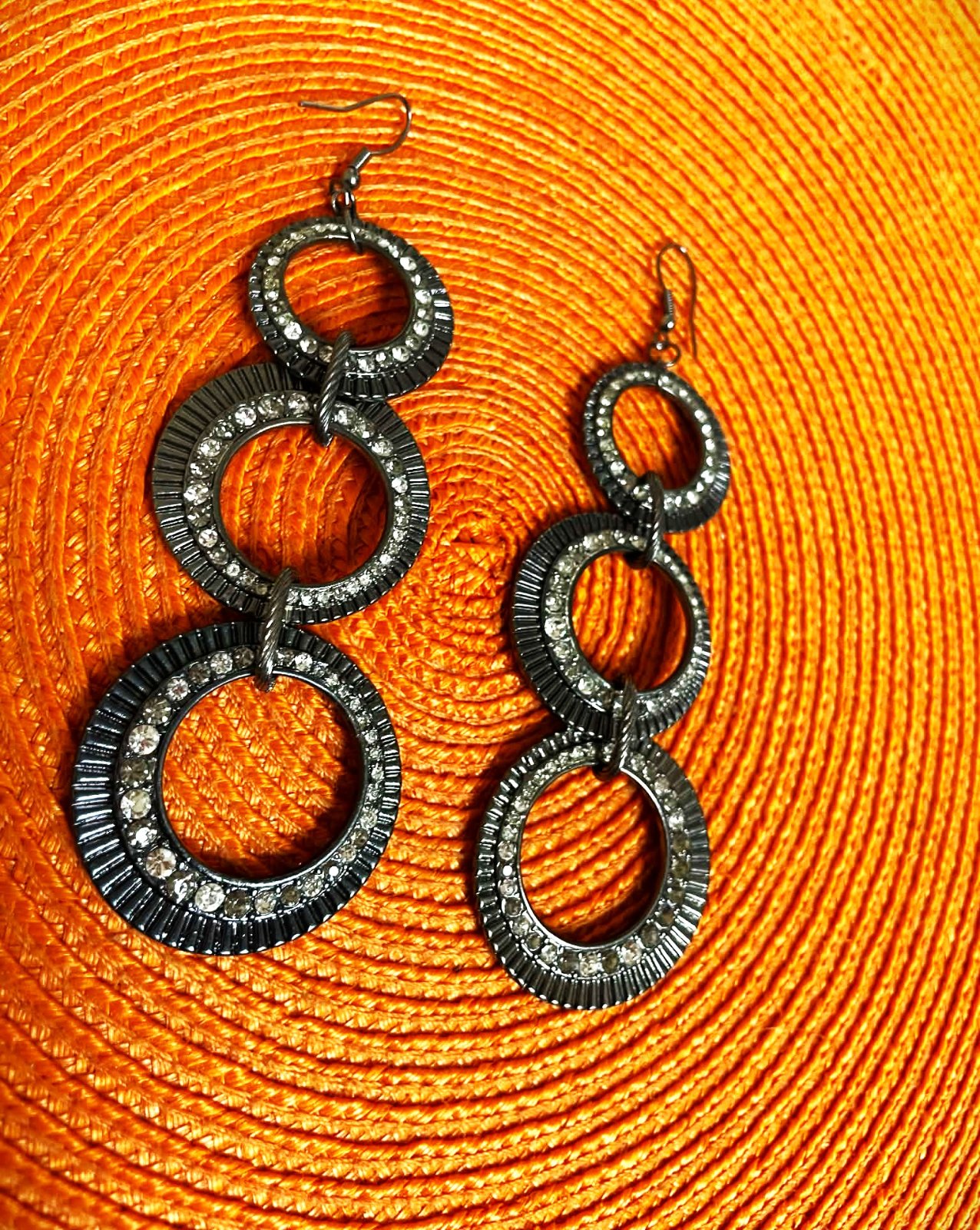 krásne a výrazné visiace náušnice,raz použité,zdobené krásnymi kamienkami, top kúsok,dlžka = 9,5 cm