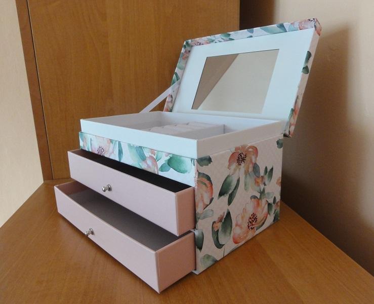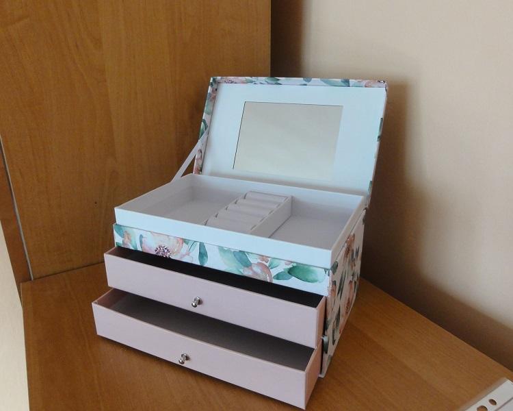 3x úložný priestor, s zrkadlom, Horná priehradka obsahuje menší organizér na prstene alebo náušnice.; nepodarený darček, nevyužijem