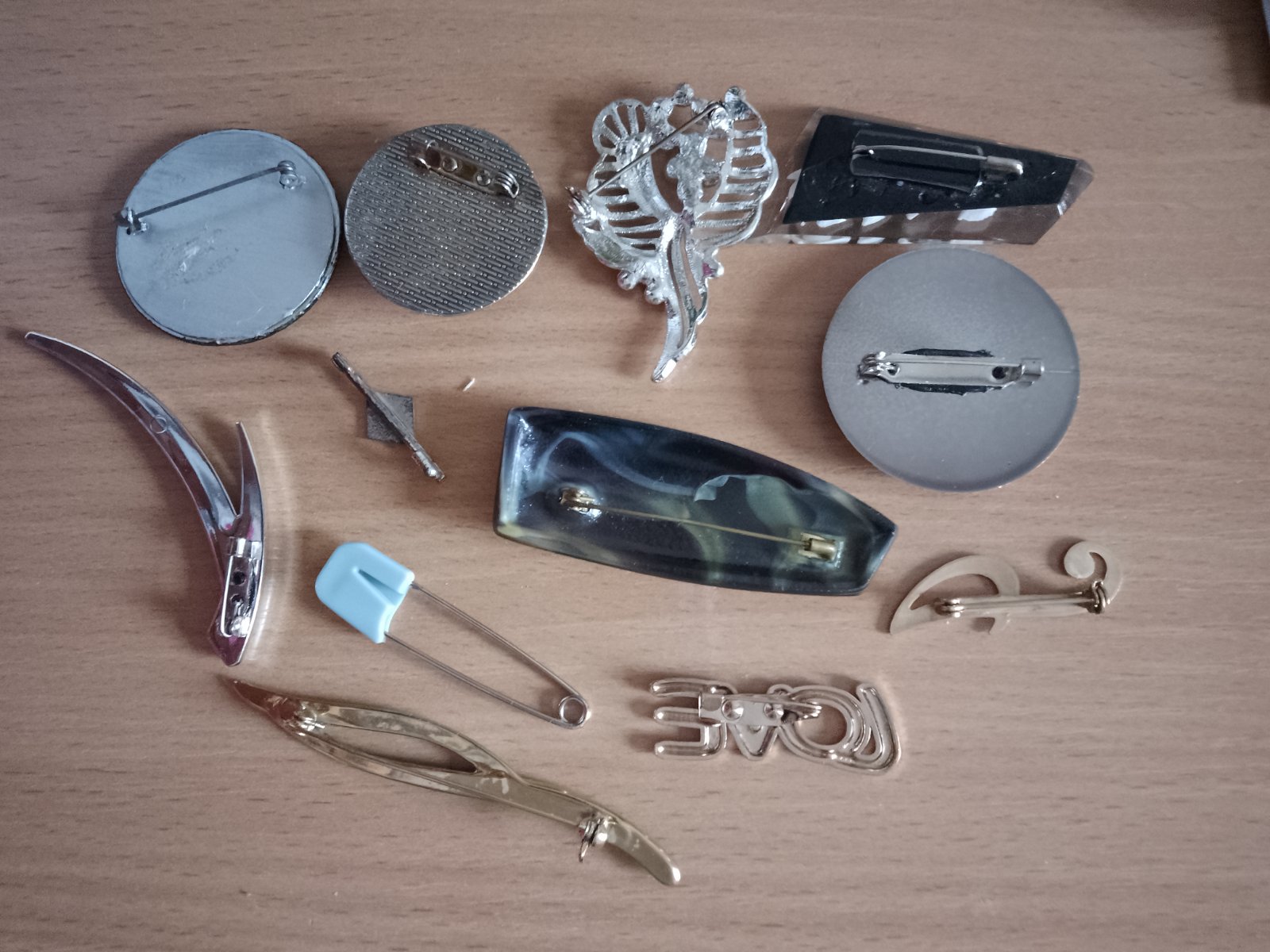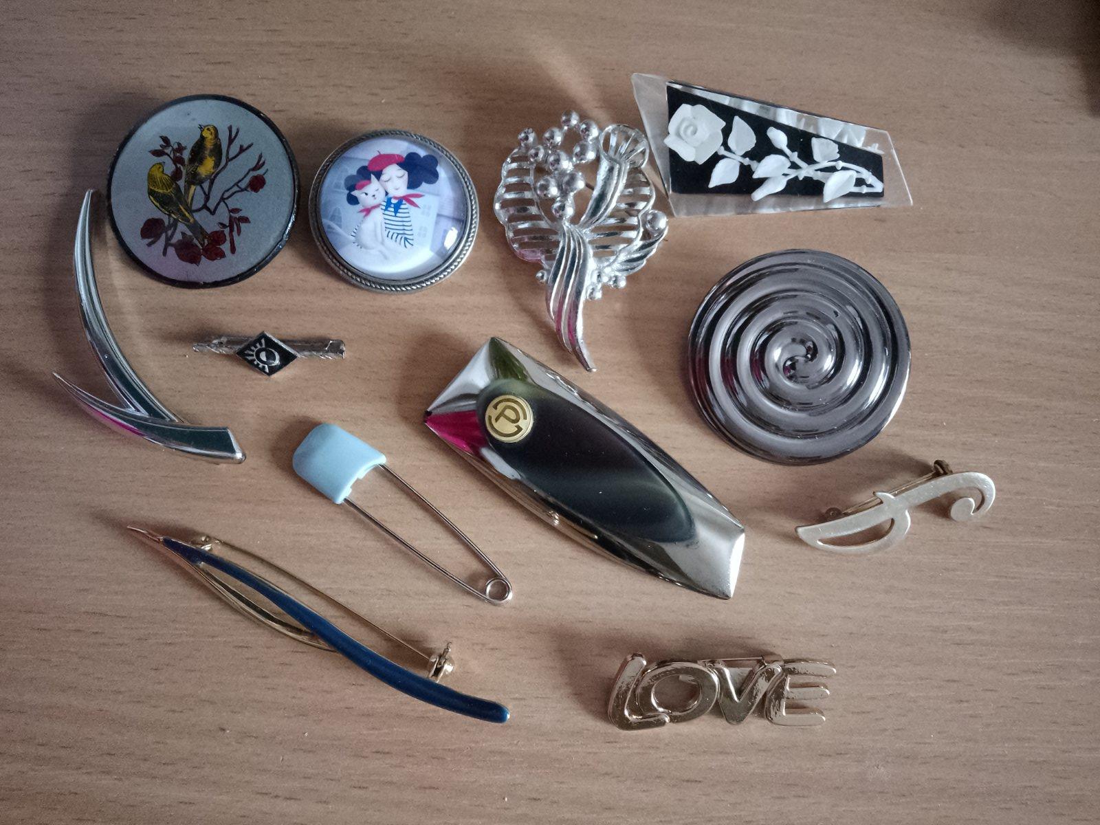 Len spolu 12 kusov, niektoré neboli ani pouzívané, v cene 9 eur je aj poštovné doporučene druhou triedou platba vopred na dobierku nie, brošňa s písmenom P nie je farebná je to odraz svetla, je sivočierna