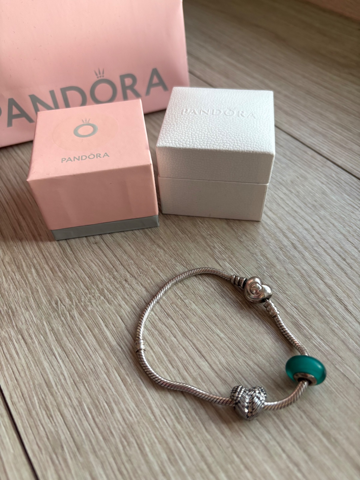 náramok Pandora v pôvodnom balení, dĺžka 18 cm. Zapínanie - srdiečko bolo opravované, je to vidieť na fotkách, náramok je naďalej nositeľný. Vzhľadom k oprave, ktorá je aj viditeľná, zohľadňujem ce...