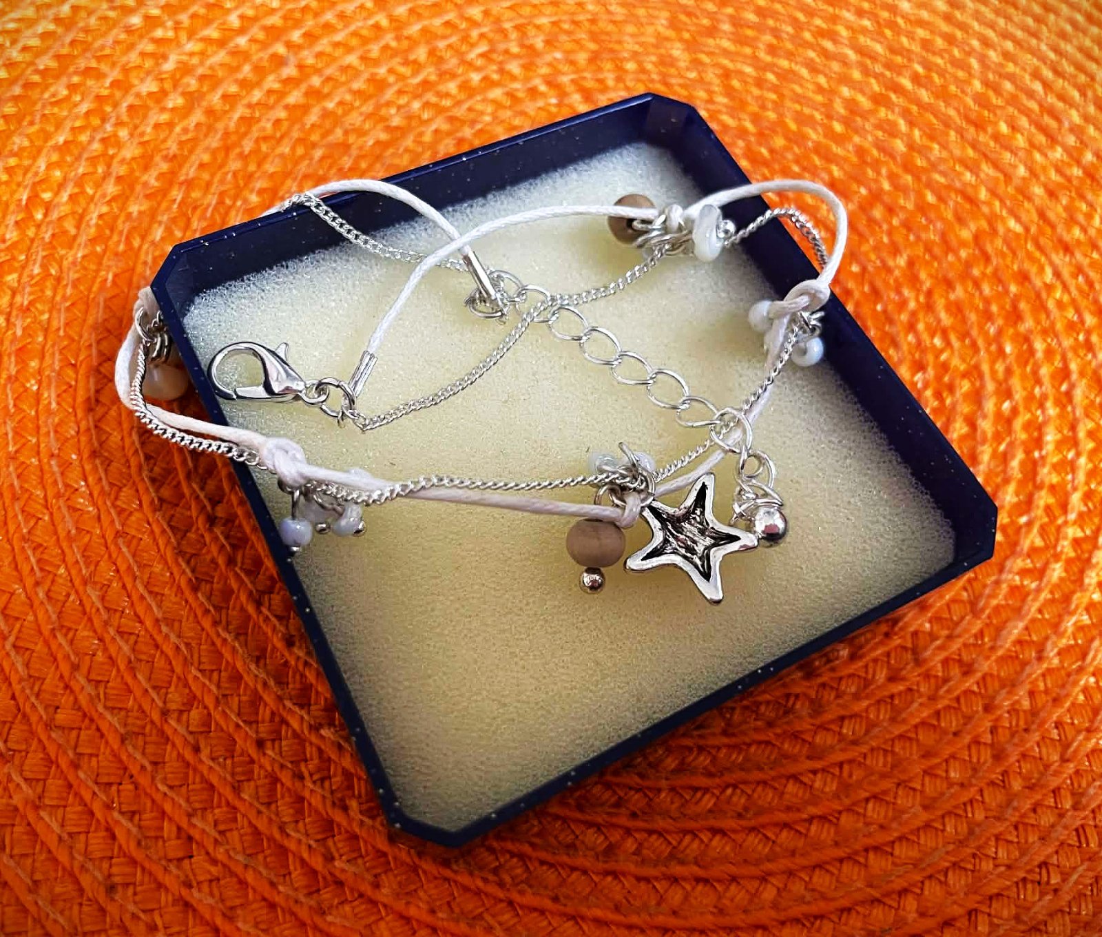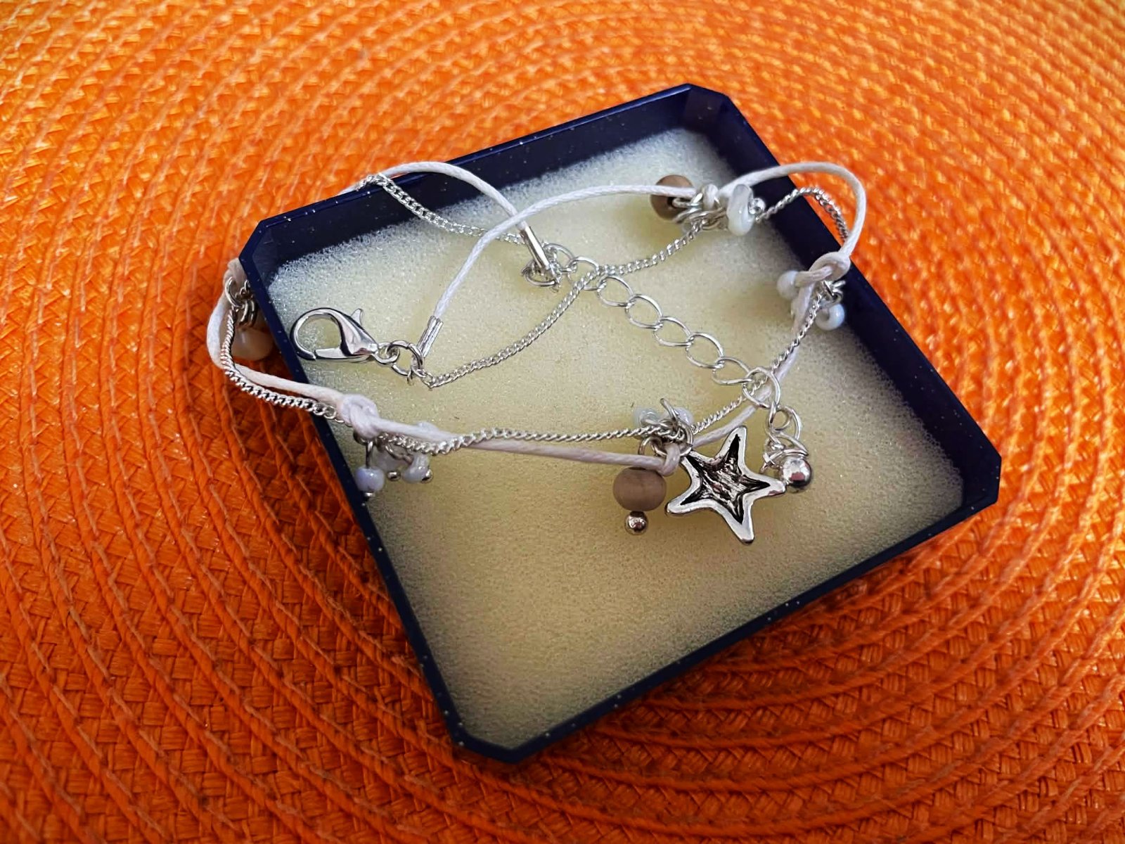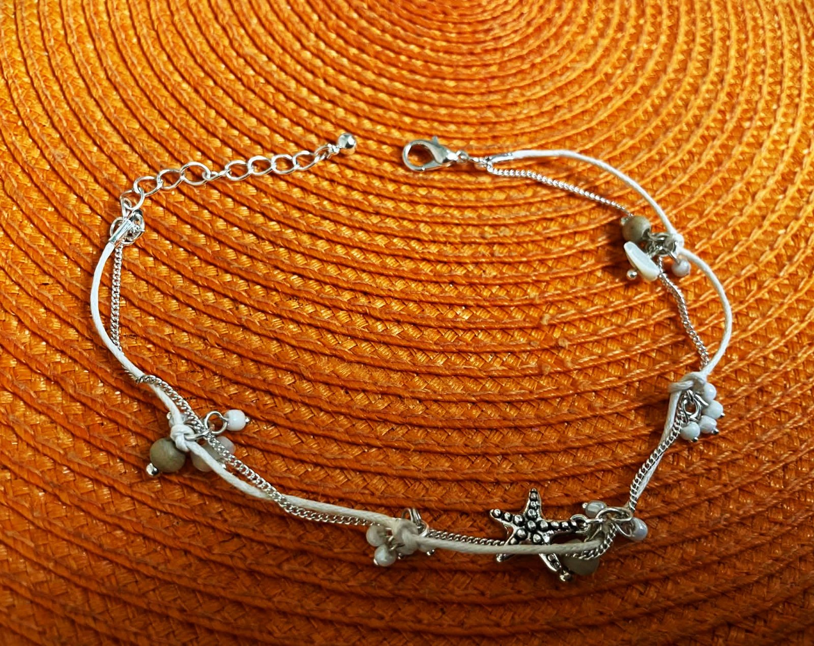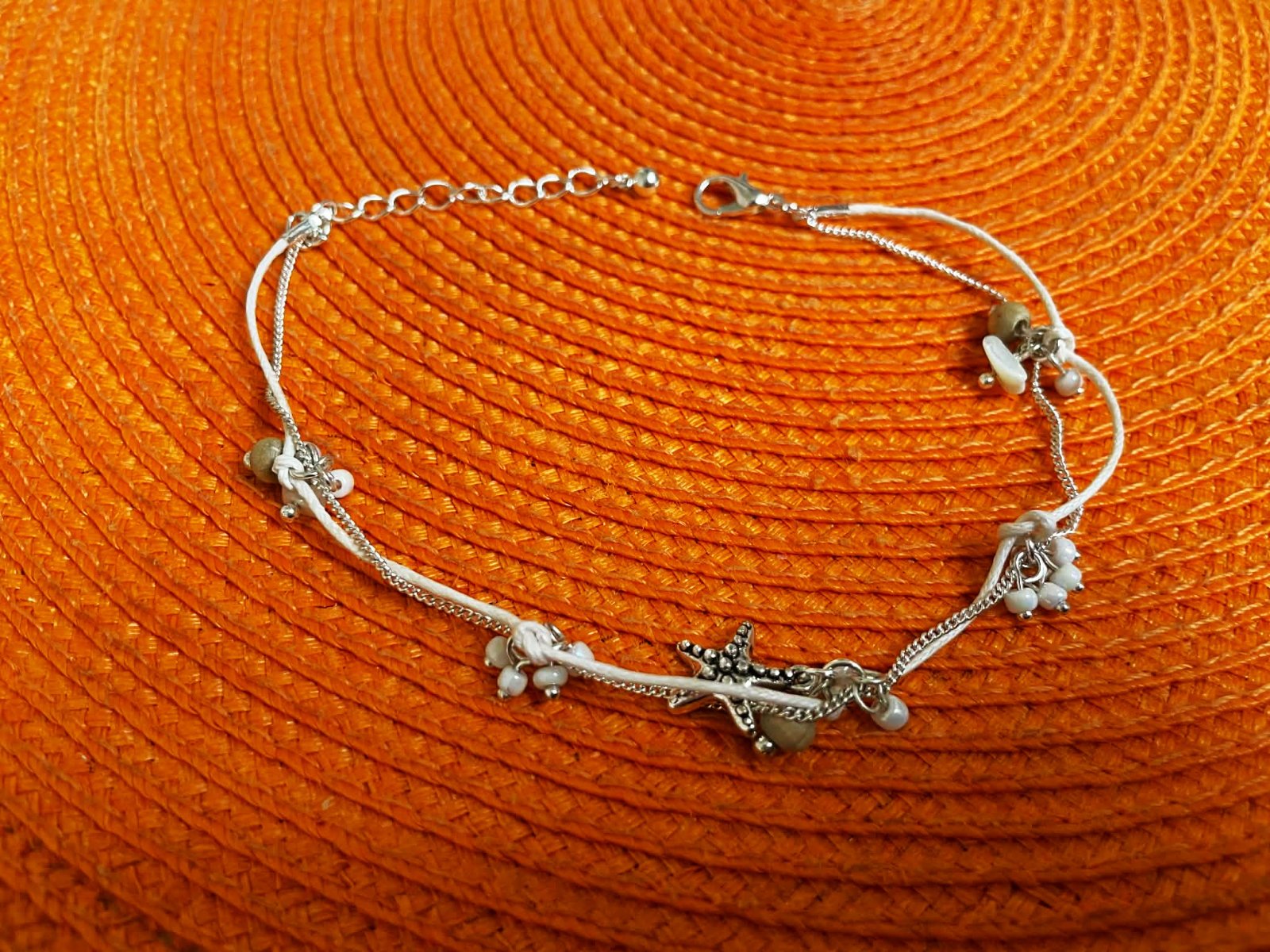 náramok na členok s príveskami v tvare hviezdice a mušlí,dvojitý - kombinuje bielu šnúrku a jemnú striebornú retiazku,super na leto okolo kotníka, nastaviteľné zapínanie s predlžovacou retiazkou, aby sedel na rôzne veľkosti členkov - povoliteľný obvod ,je to striebro, dá sa upnúť aj na kratšie a nosiť na zápästí,má bohémsky plážový štýl, ideálny ako doplnok na leto alebo dovolenku