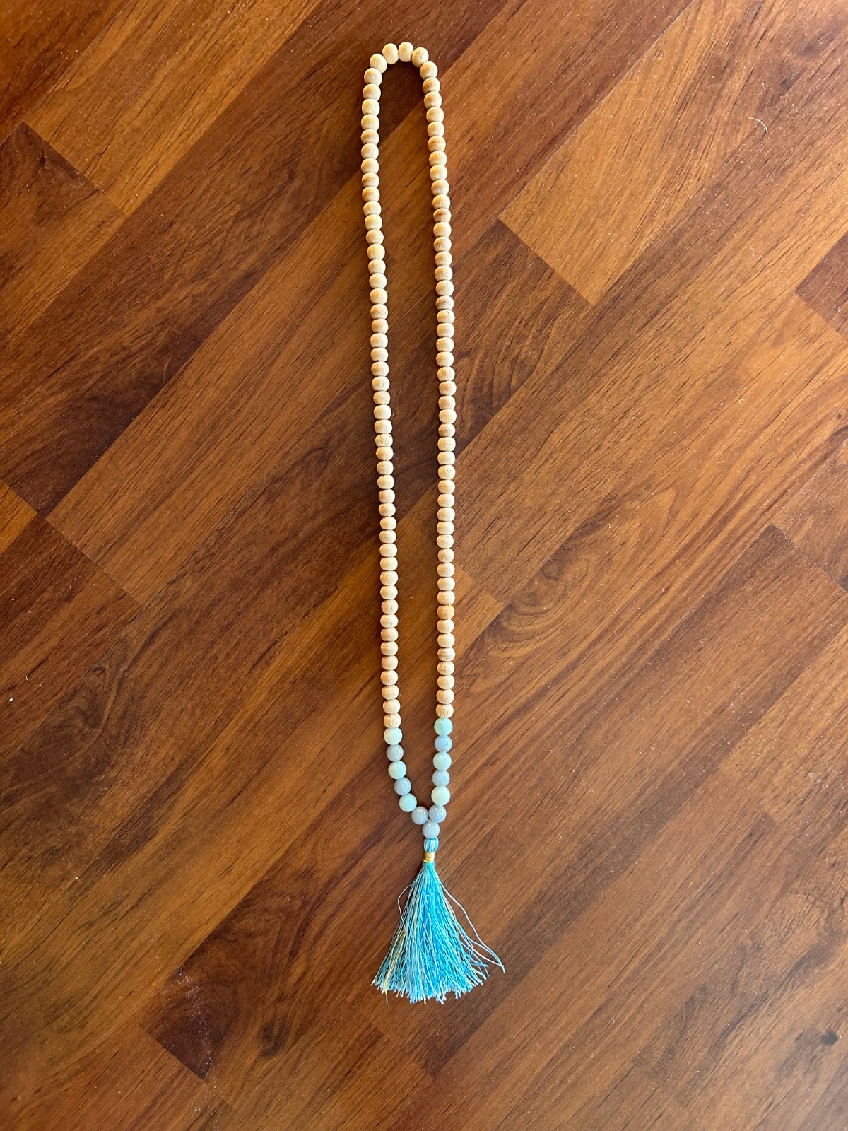 Predám náhrdelník Japa Mala z drevených korálok kombinovaných s Angelitom pre upokojenie mysle, potlačenie stresu a napätia. Korálky sú cca 8 mm, dĺžka náhrdelníka 92 cm vrátane strapca. Počet korálkov je 108. Modrá farba aktivuje 5. čakru, čakru hrdla a strapec symbolizuje mier, komunikáciu, dôveru, vernosť a vieru. BA alebo poštou+poštovné.