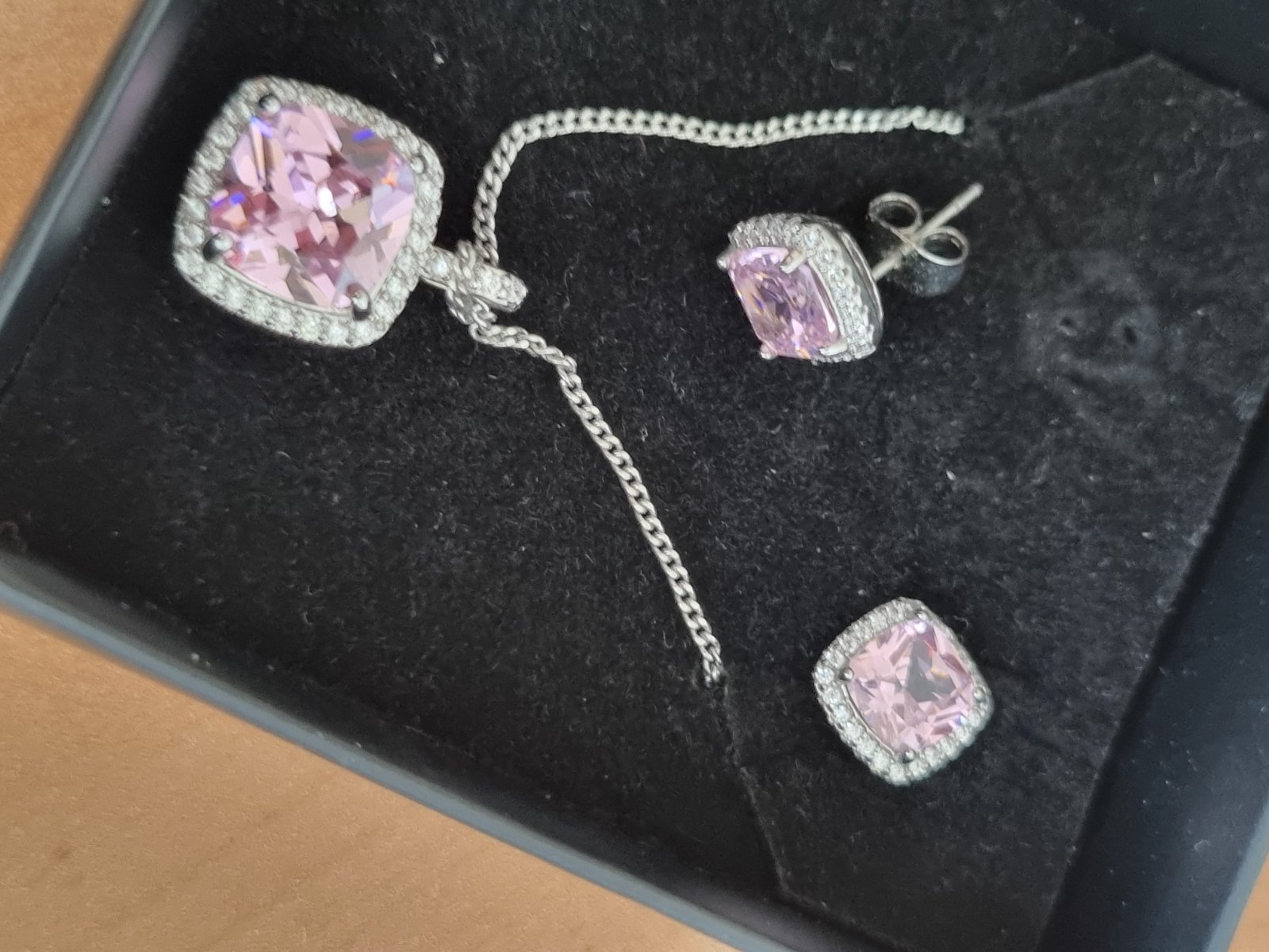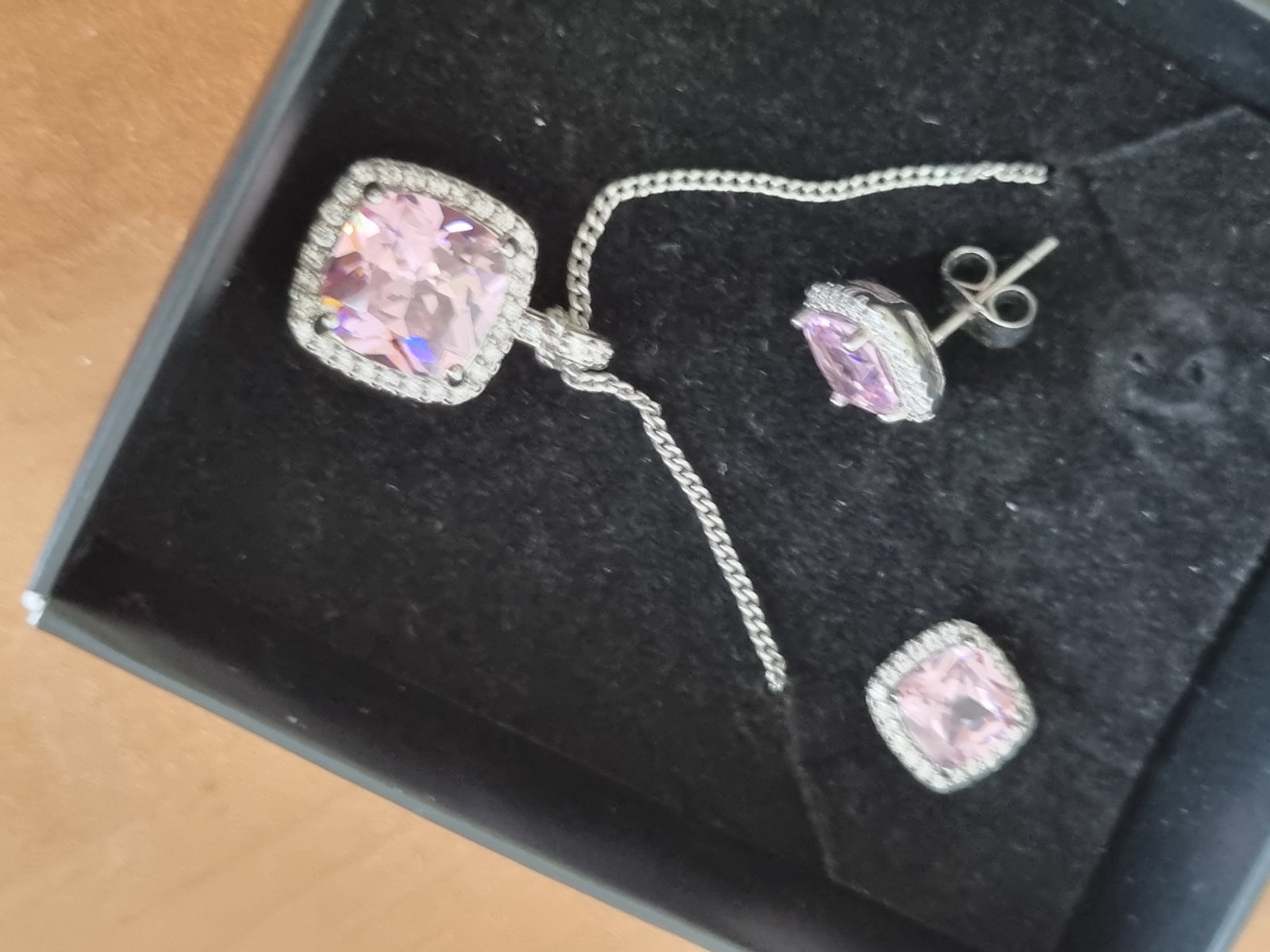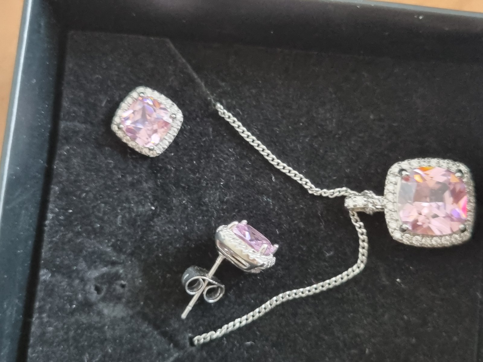 štvorcové ružové kamienky a biele okolo..napichovacie...retiazka s priveskom..strieb.prevedenie