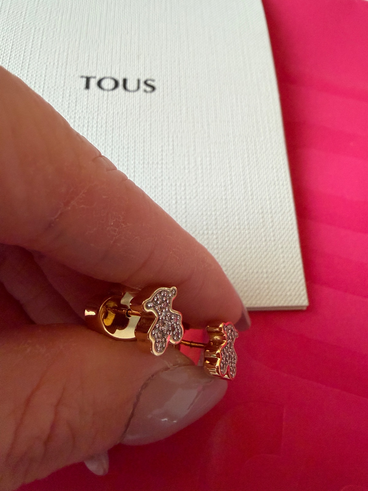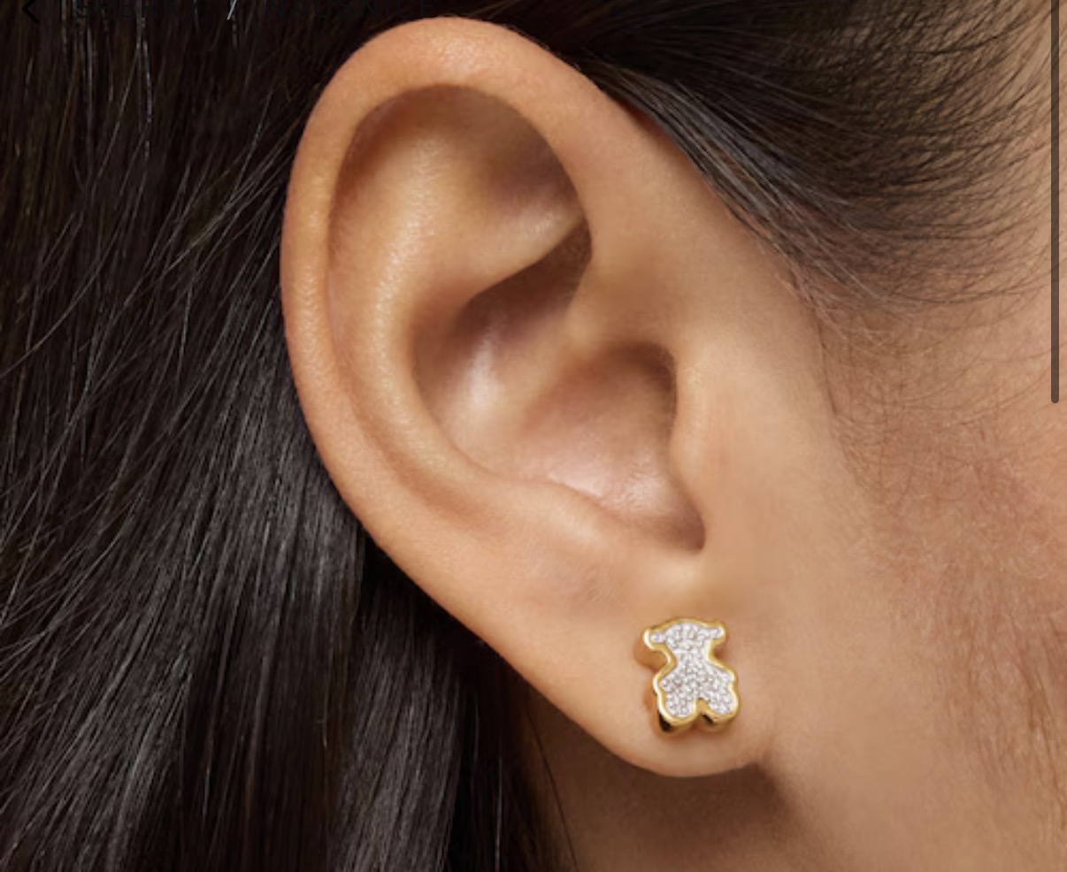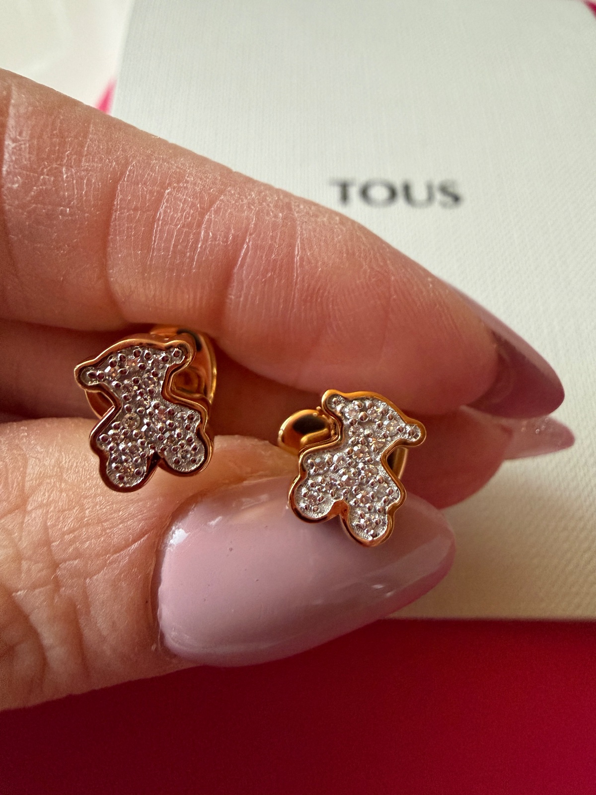 Par krat vzate náušnice s medvedíkom TOUS 1950 s 18 kt pozlátením na striebre a 0,15 kt diamantmi s jediným výbrusom. Kvalita diamantov: 8x8 GH/SI. Veľkosť náušníc: 9 mm. Zapínanie na puzetu. Kúsok je vyrobený z mincového striebra s 18 až 23-karátovým pozlátením s hrúbkou 3 mikróny. To zaručuje lepšiu odolnosť šperku.
