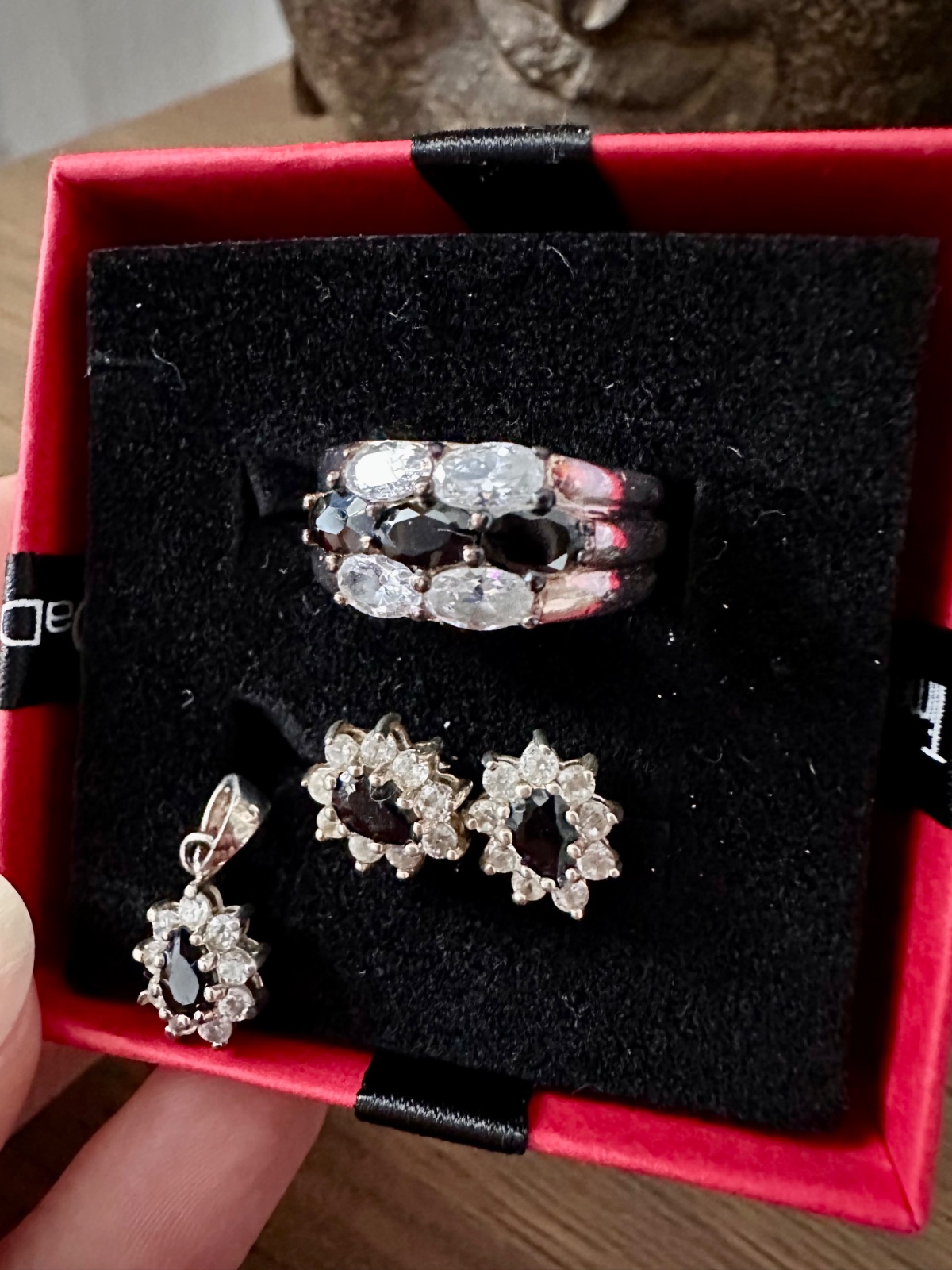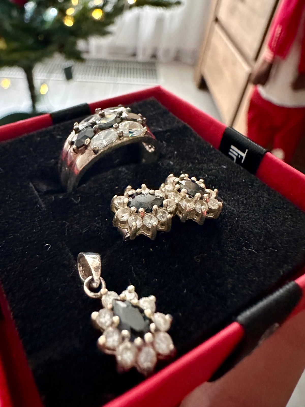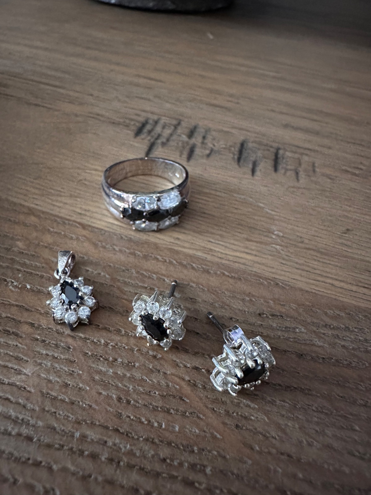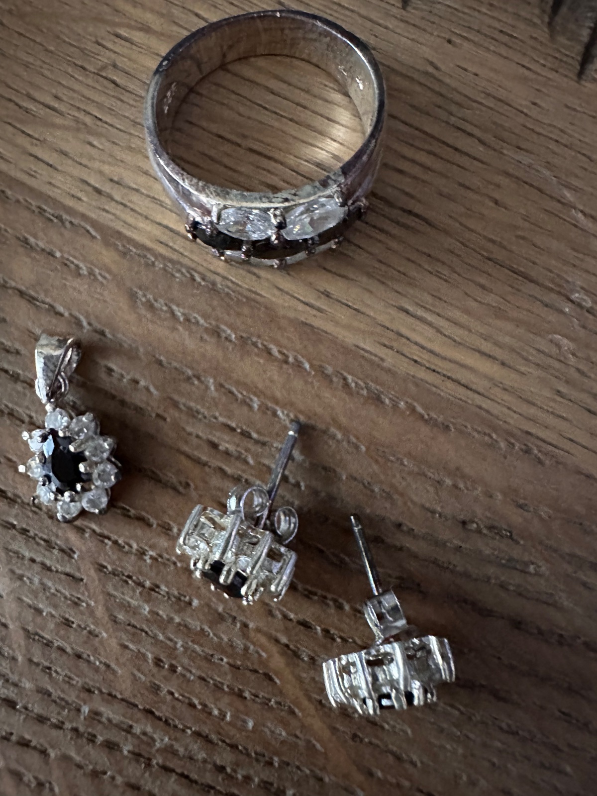 Predam tento strieborny set, min.noseny, privespk nenoseny. Vycisteny. Nausnice maju v strede cierny kamen a su lemovane malymi bielymi kamienkami. Prsten ma velkost 54. V BA mozny osobny