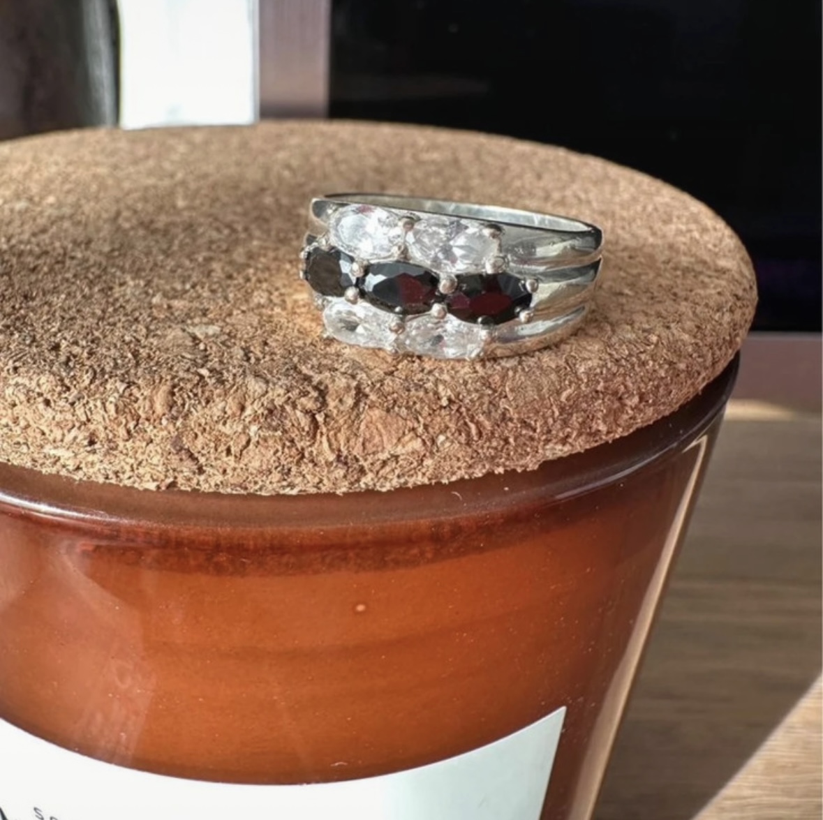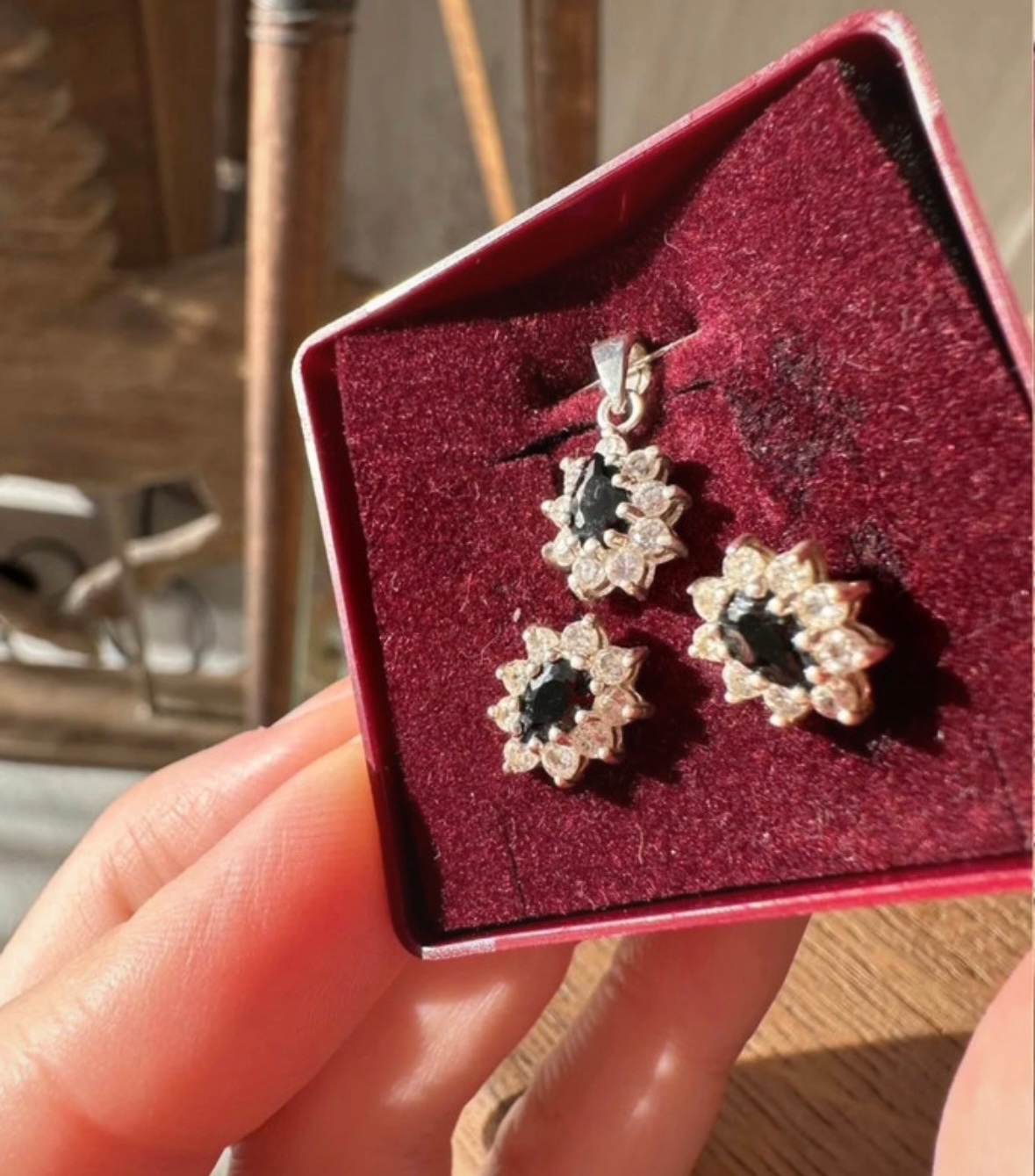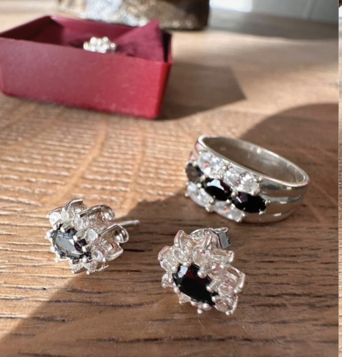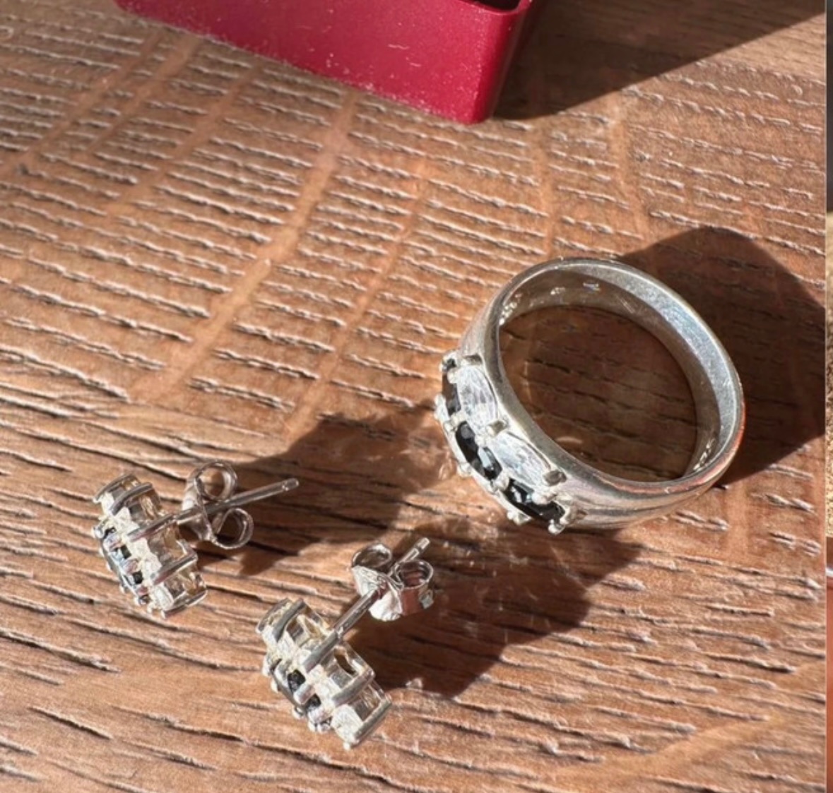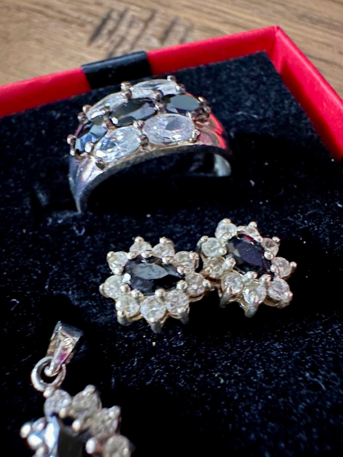 Predam tento strieborny set, min.noseny, privespk nenoseny. Vycisteny. Nausnice maju v strede cierny kamen a su lemovane malymi bielymi kamienkami. Prsten ma velkost 54. V BA mozny osobny